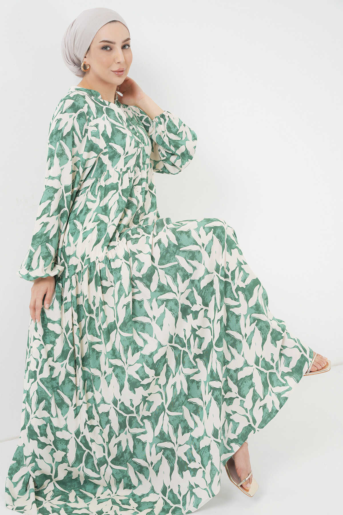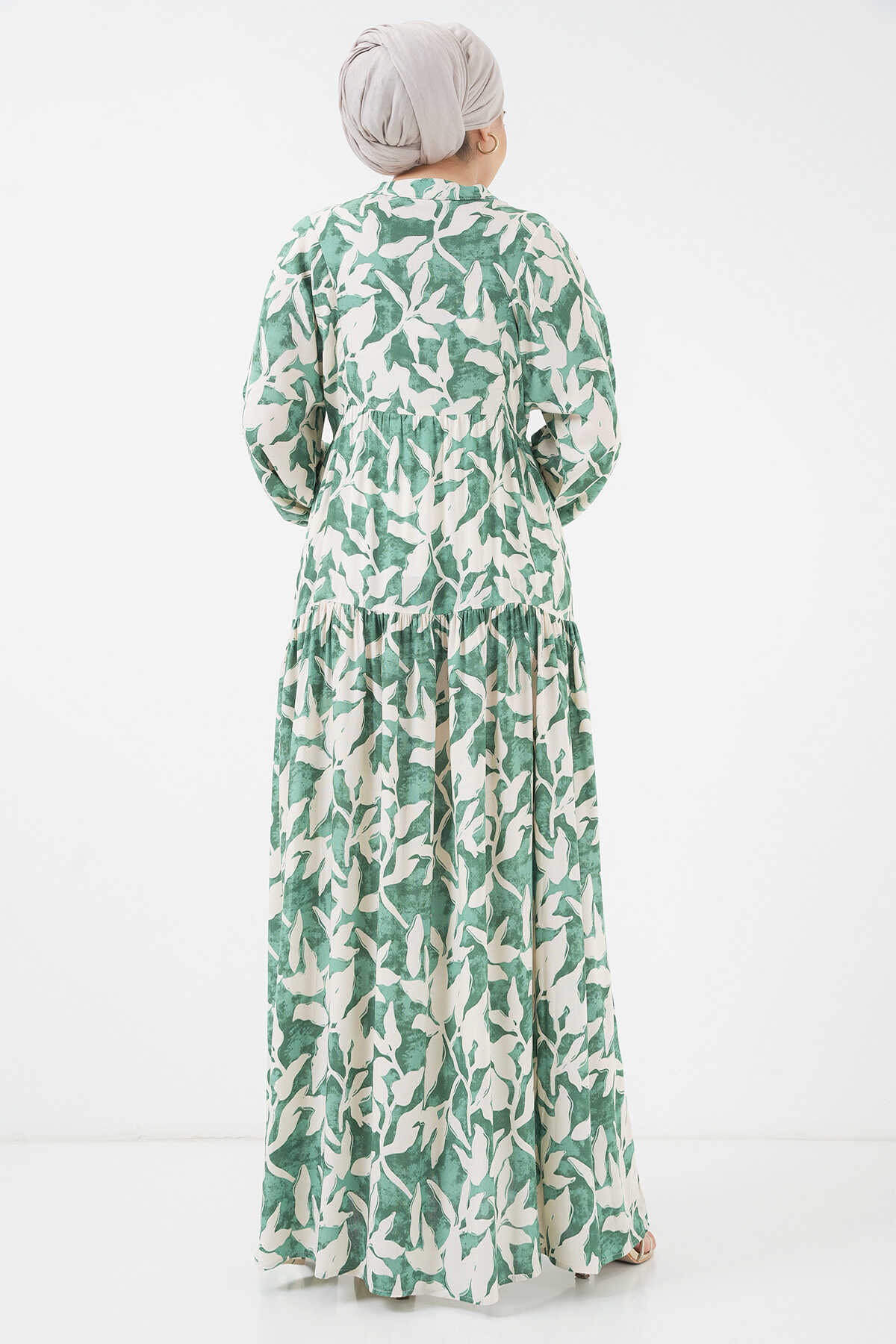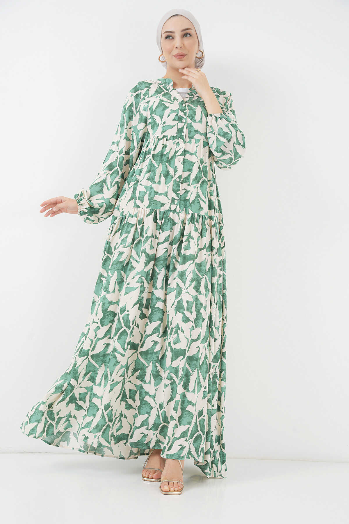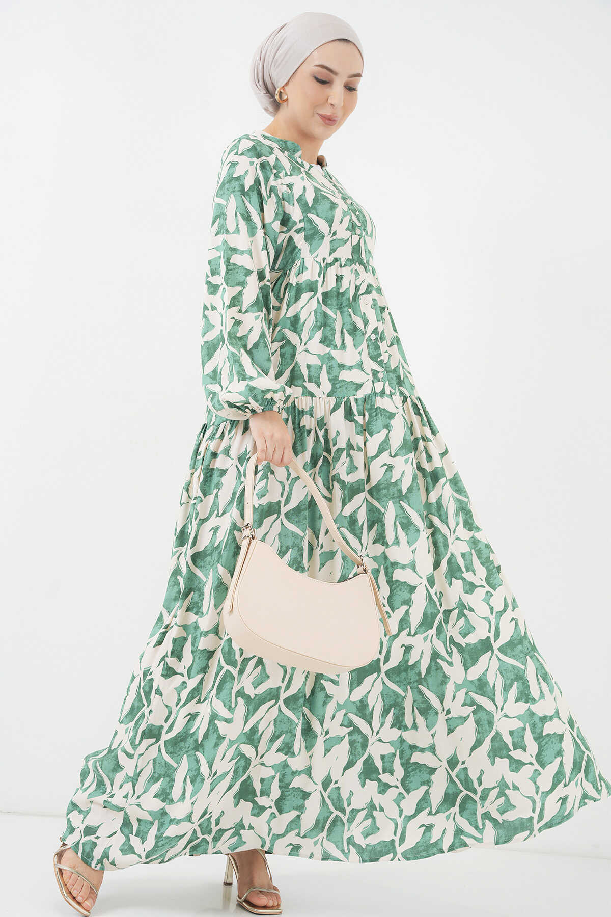 2423 Otantik Desenli Tesettür Elbise - Z.Yeşil - Kombin