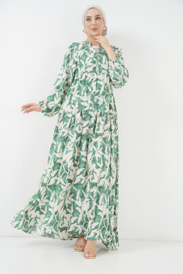 2423 Otantik Desenli Tesettür Elbise - Z.Yeşil