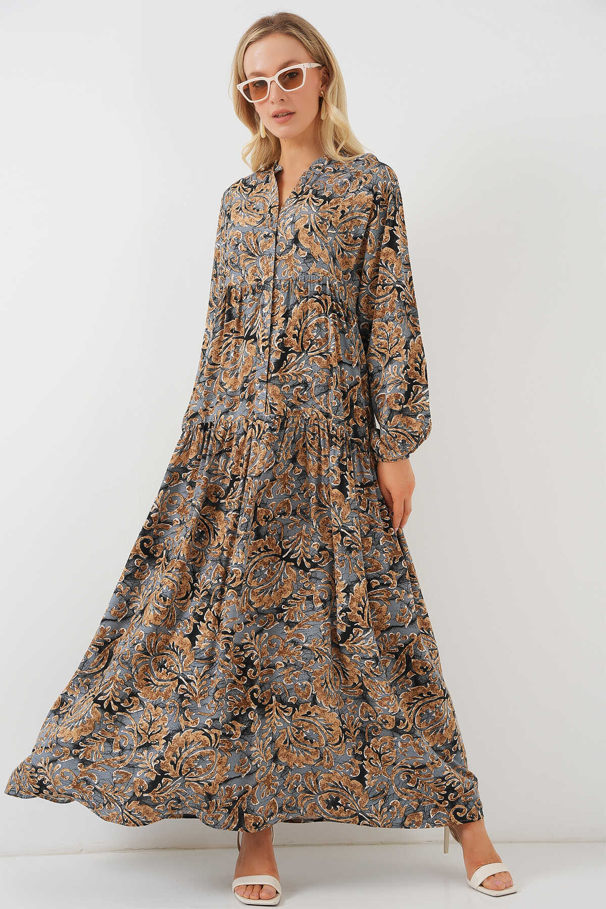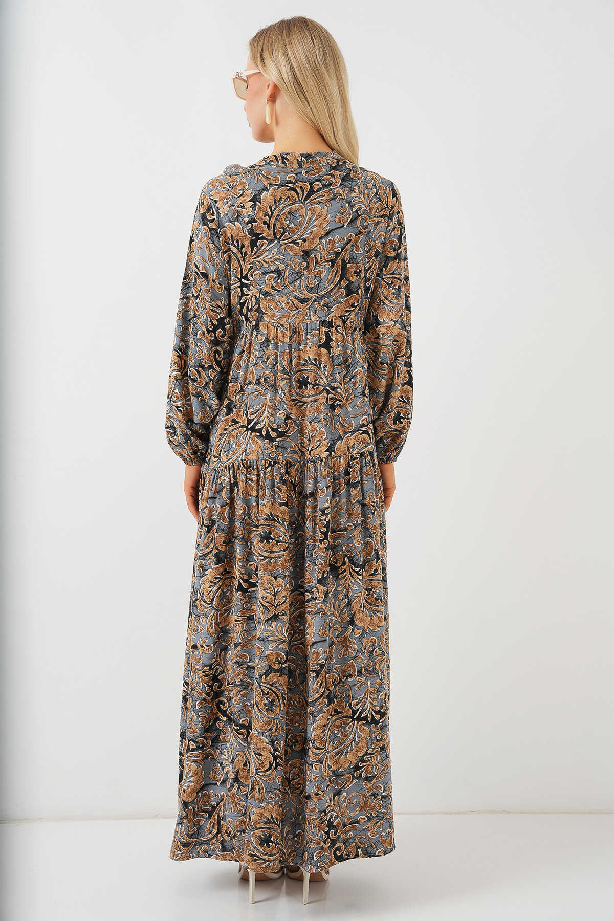 2423 Otantik Desenli Tesettür Elbise - A.Gri