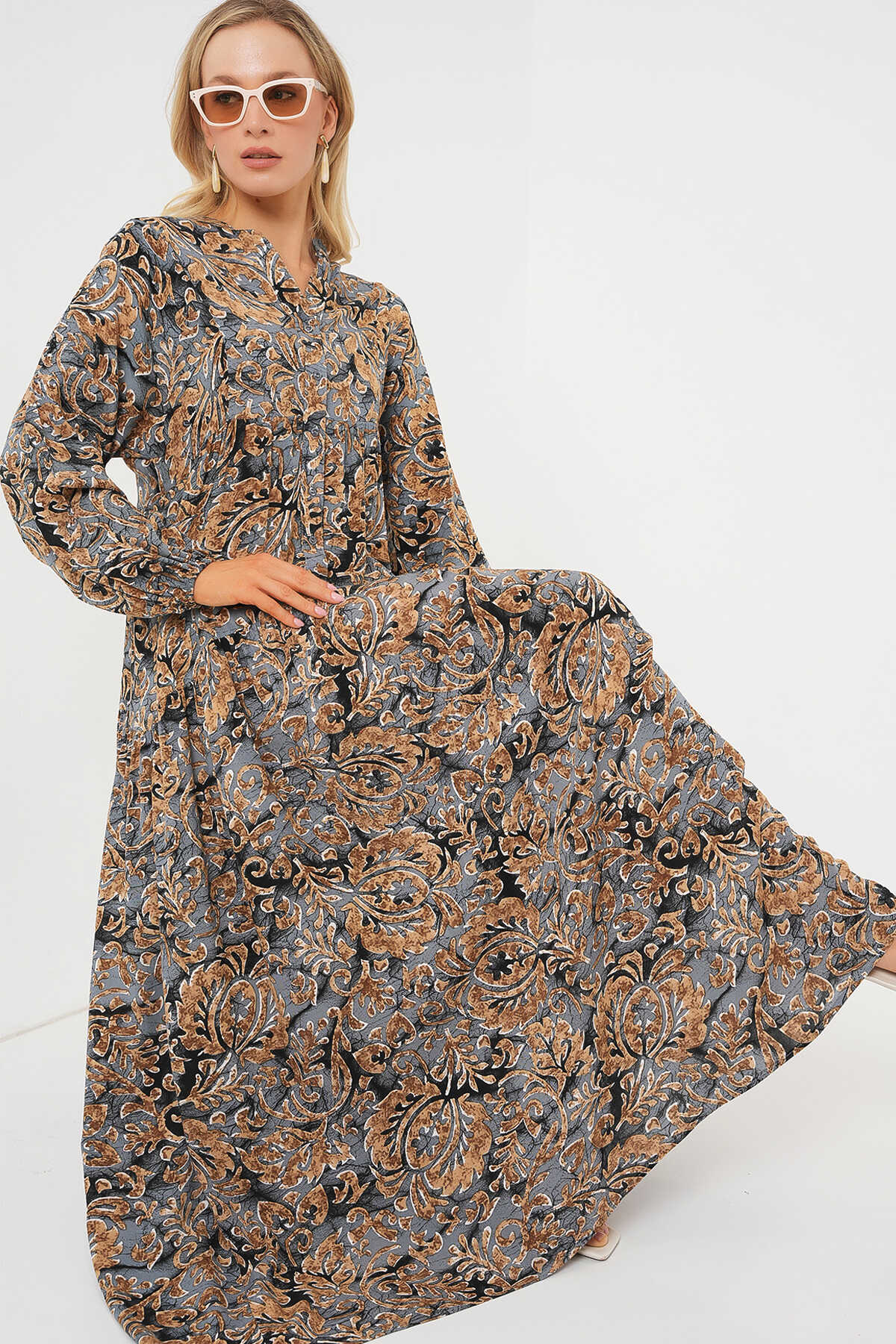 2423 Otantik Desenli Tesettür Elbise - A.Gri - Kombin