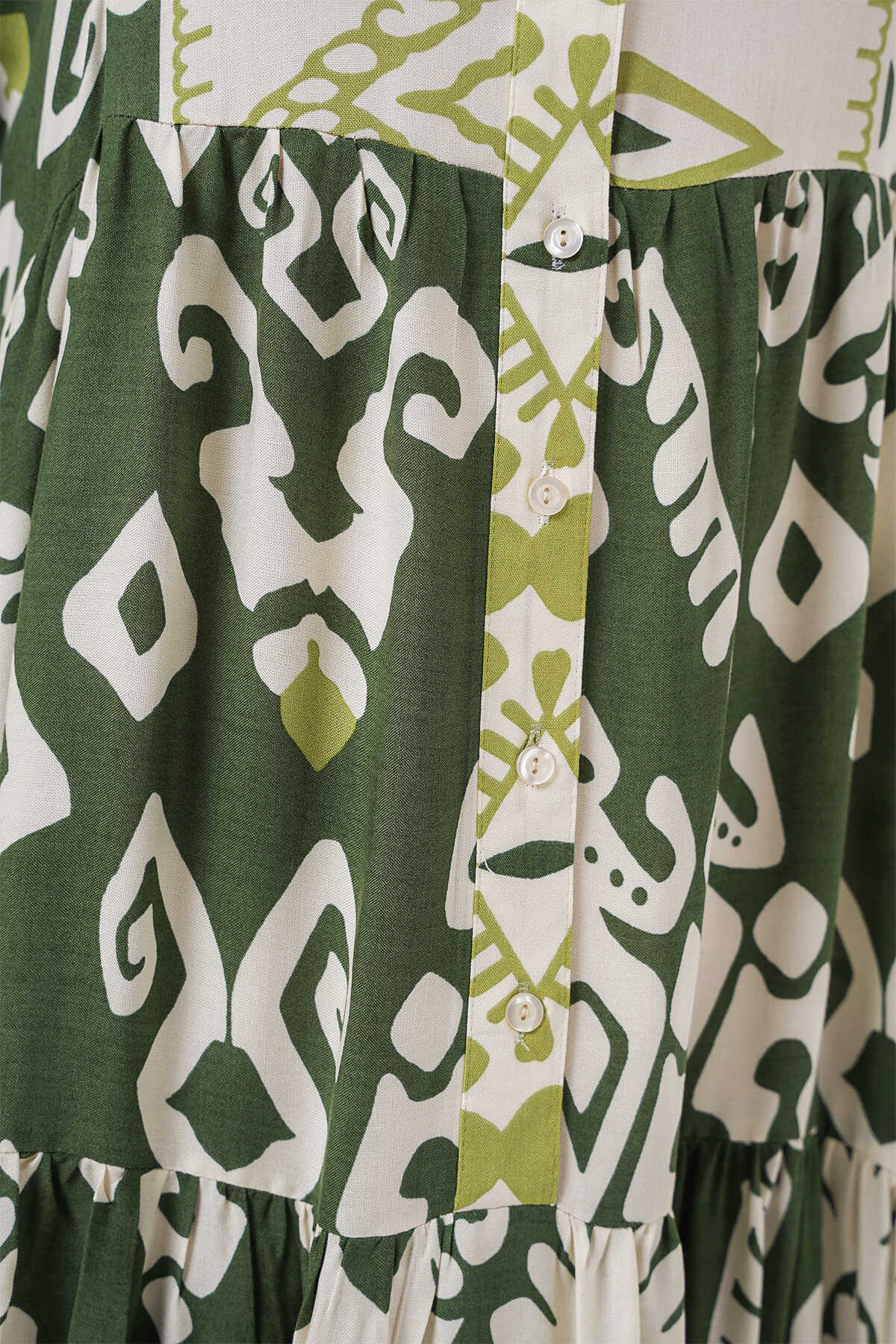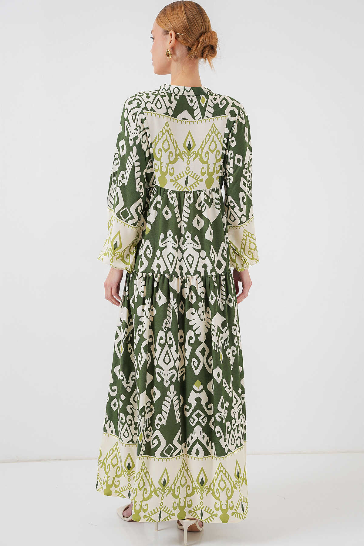 2423 Otantik Desenli Tesettür Elbise - B. Haki