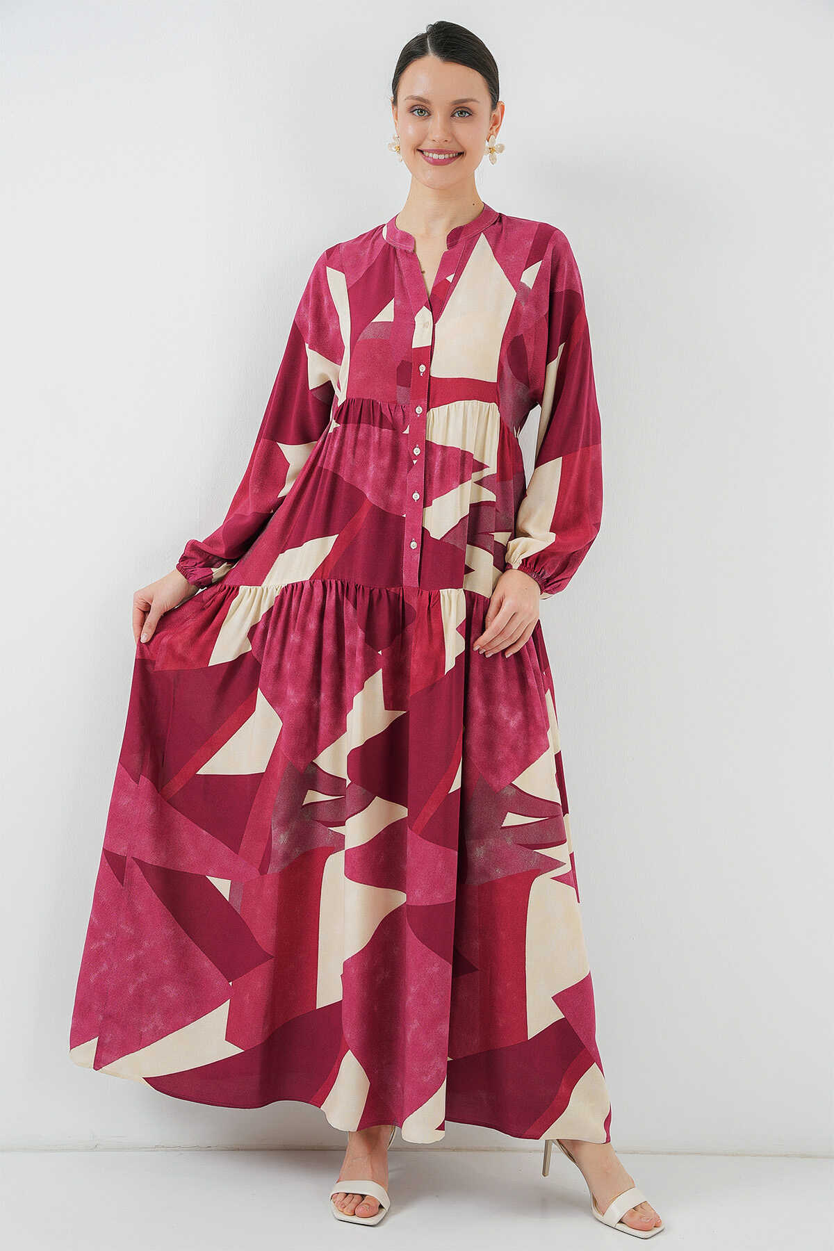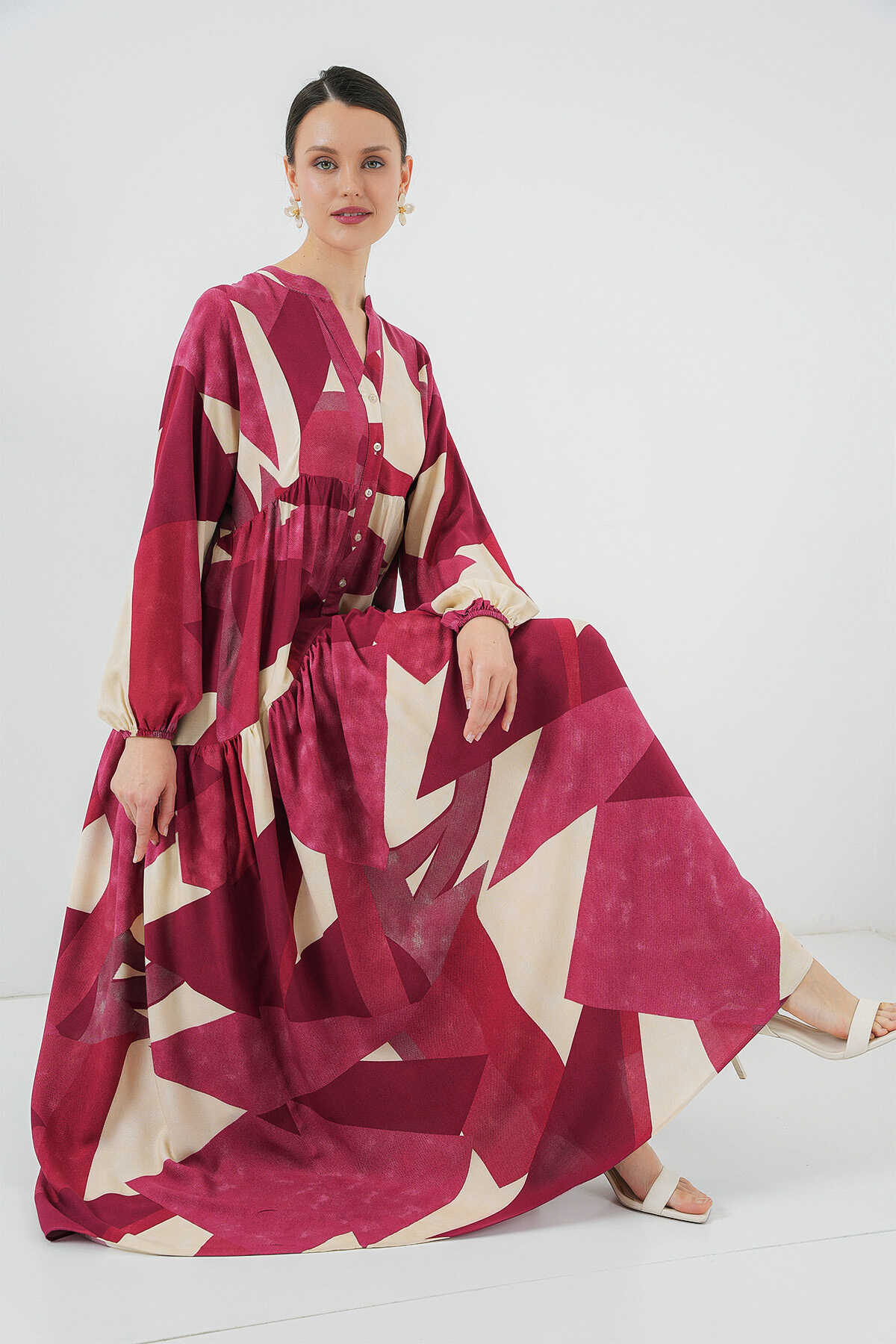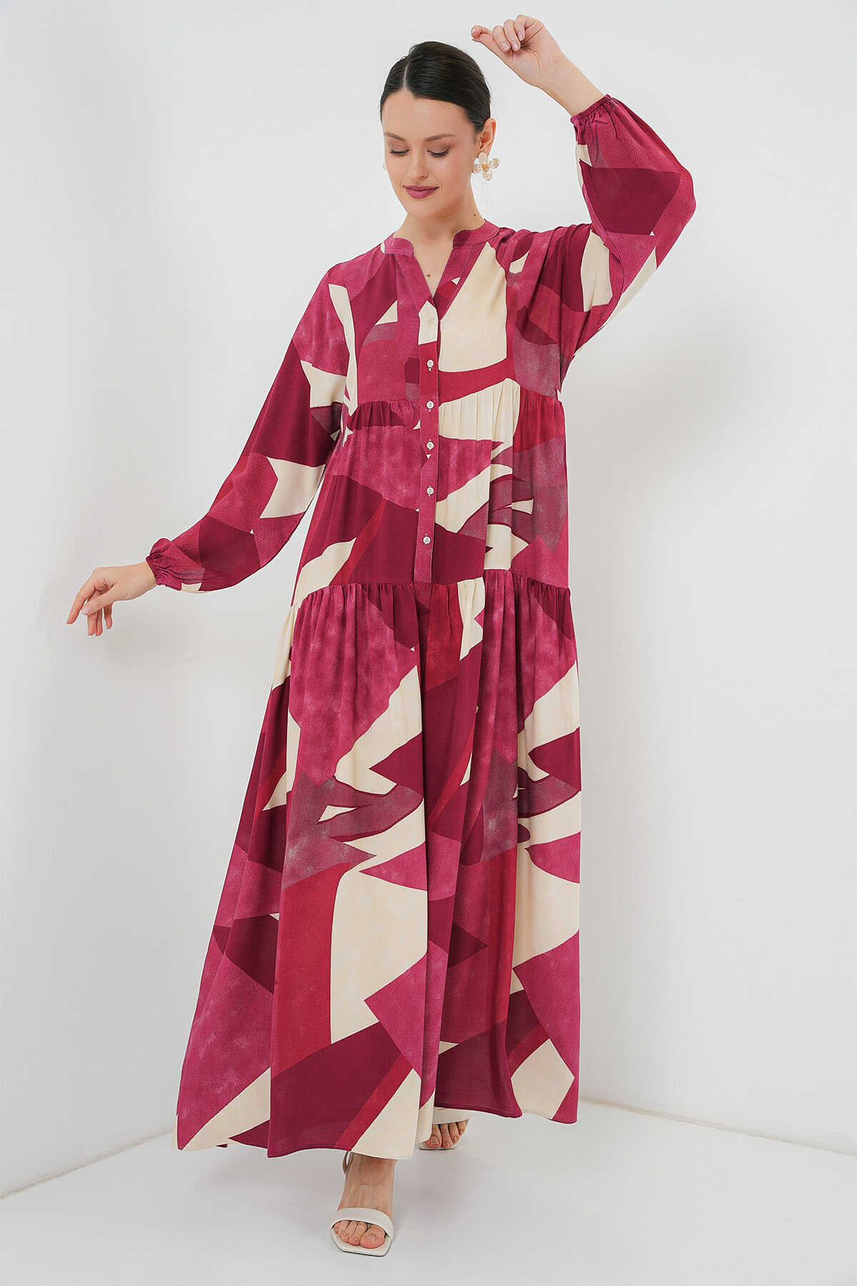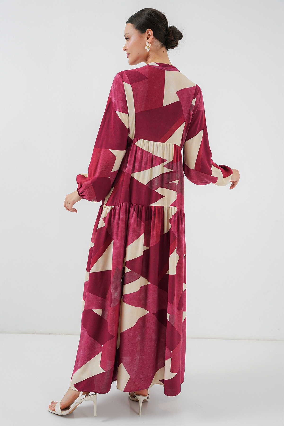 2423 Otantik Desenli Tesettür Elbise - B. Bordo