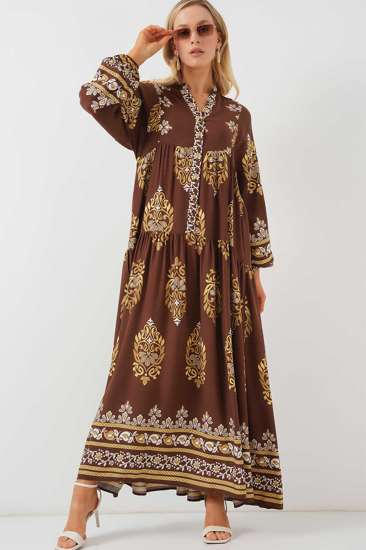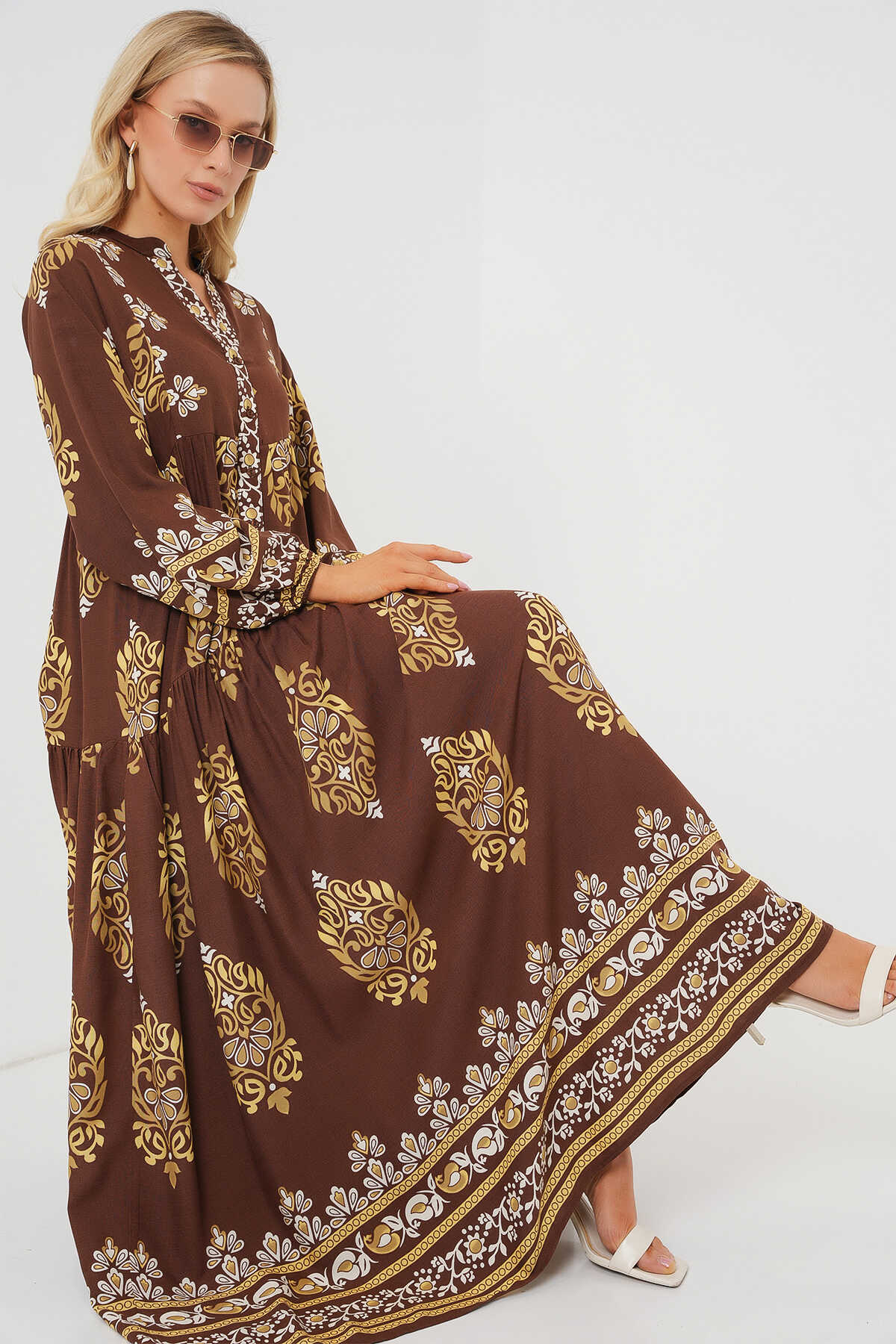 2423 Otantik Desenli Tesettür Elbise - Beyaz - Kahve