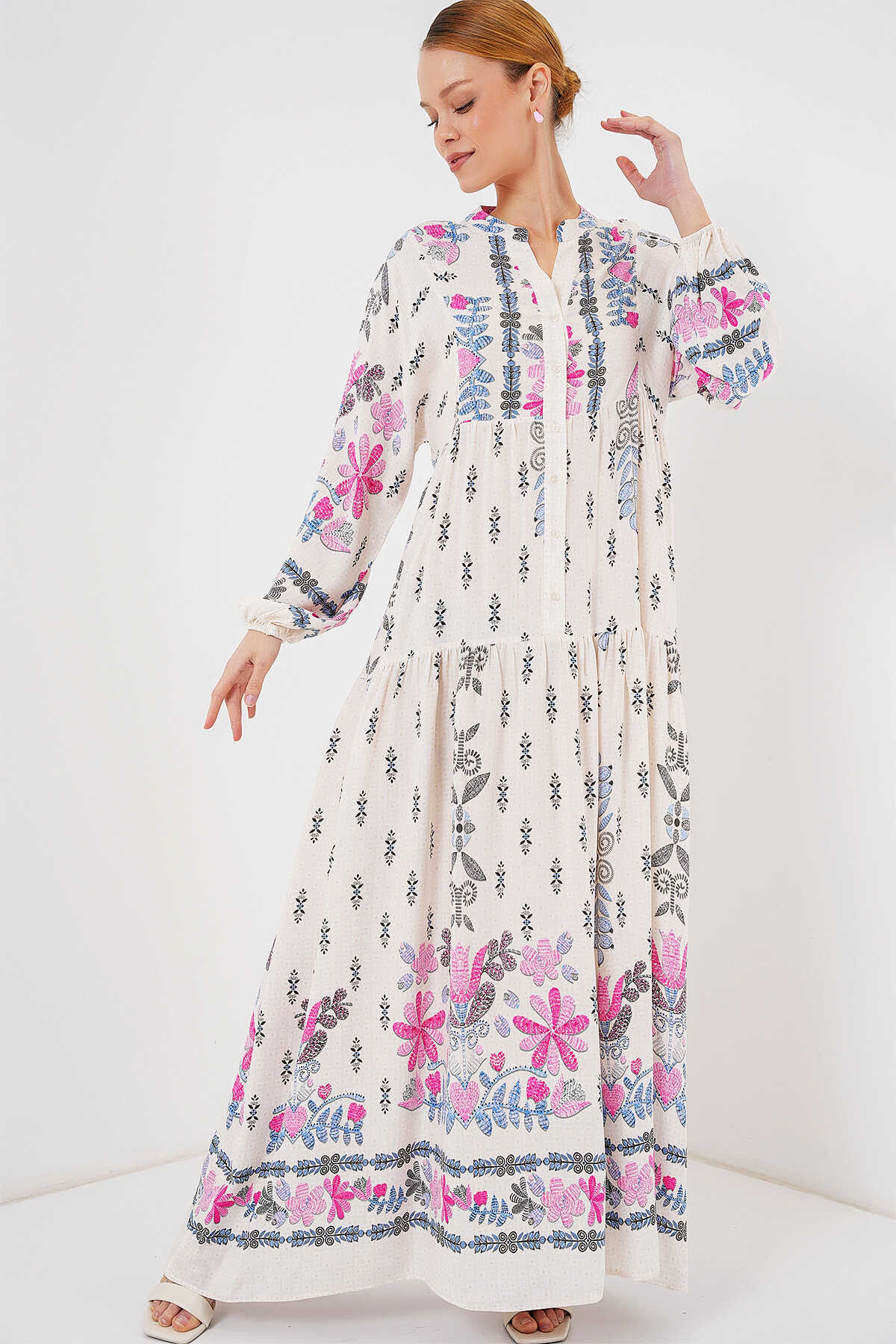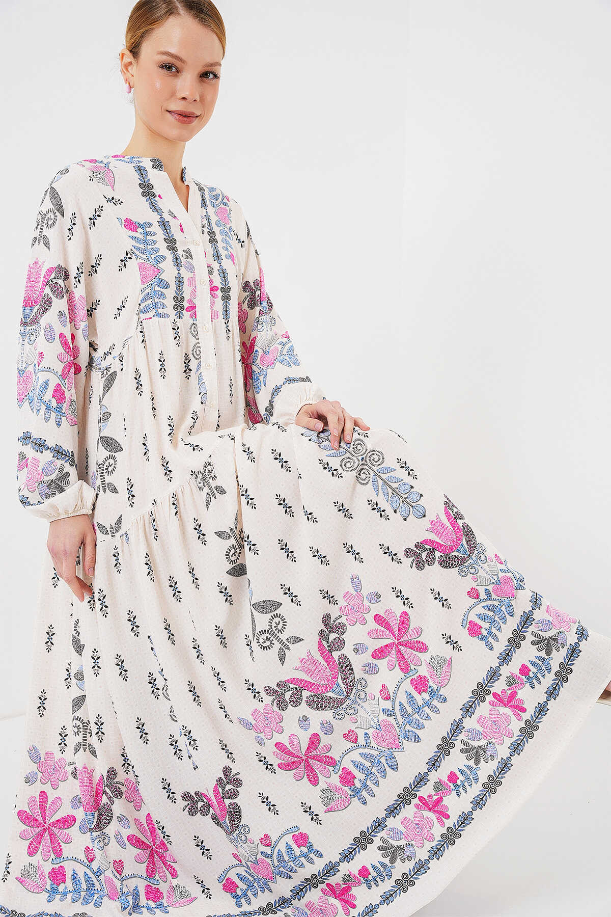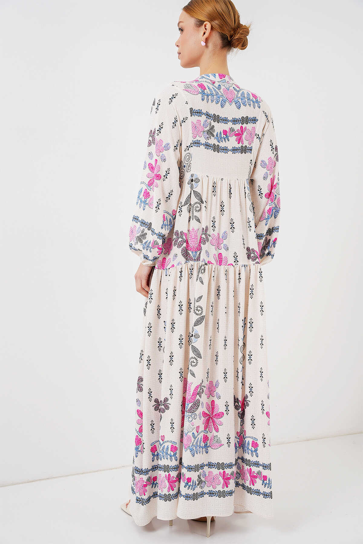 2423 Otantik Desenli Tesettür Elbise - C. Pembe