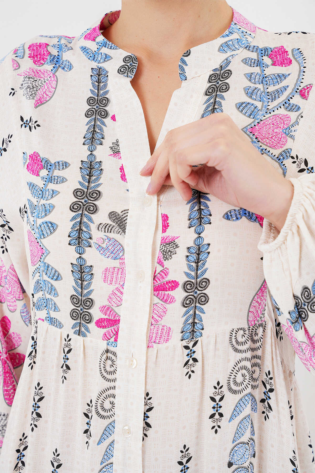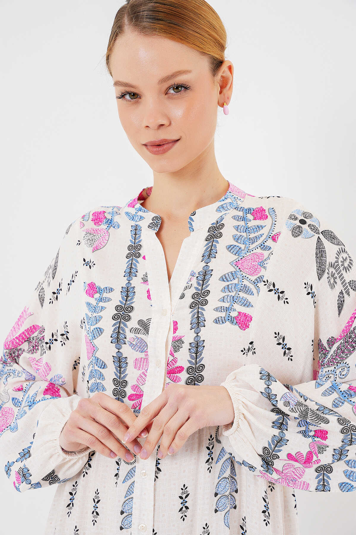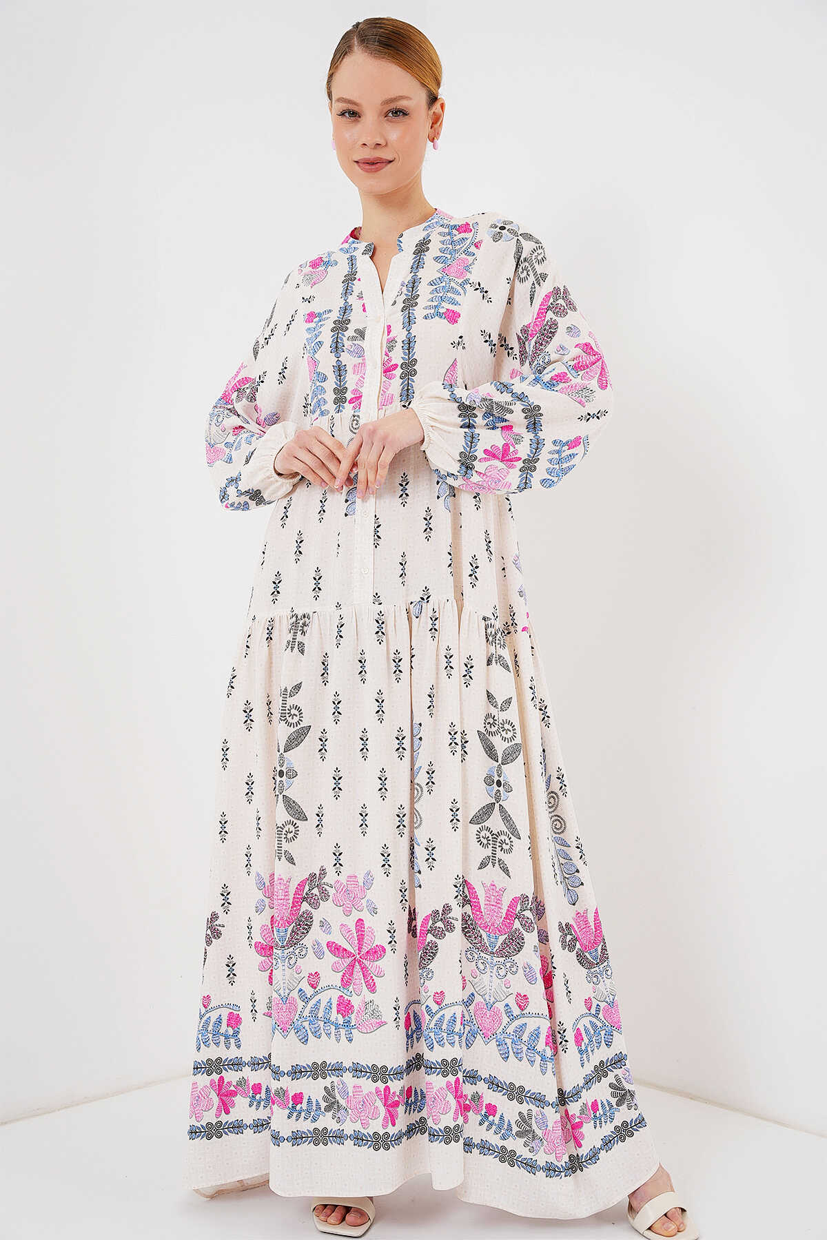 2423 Otantik Desenli Tesettür Elbise - C. Pembe