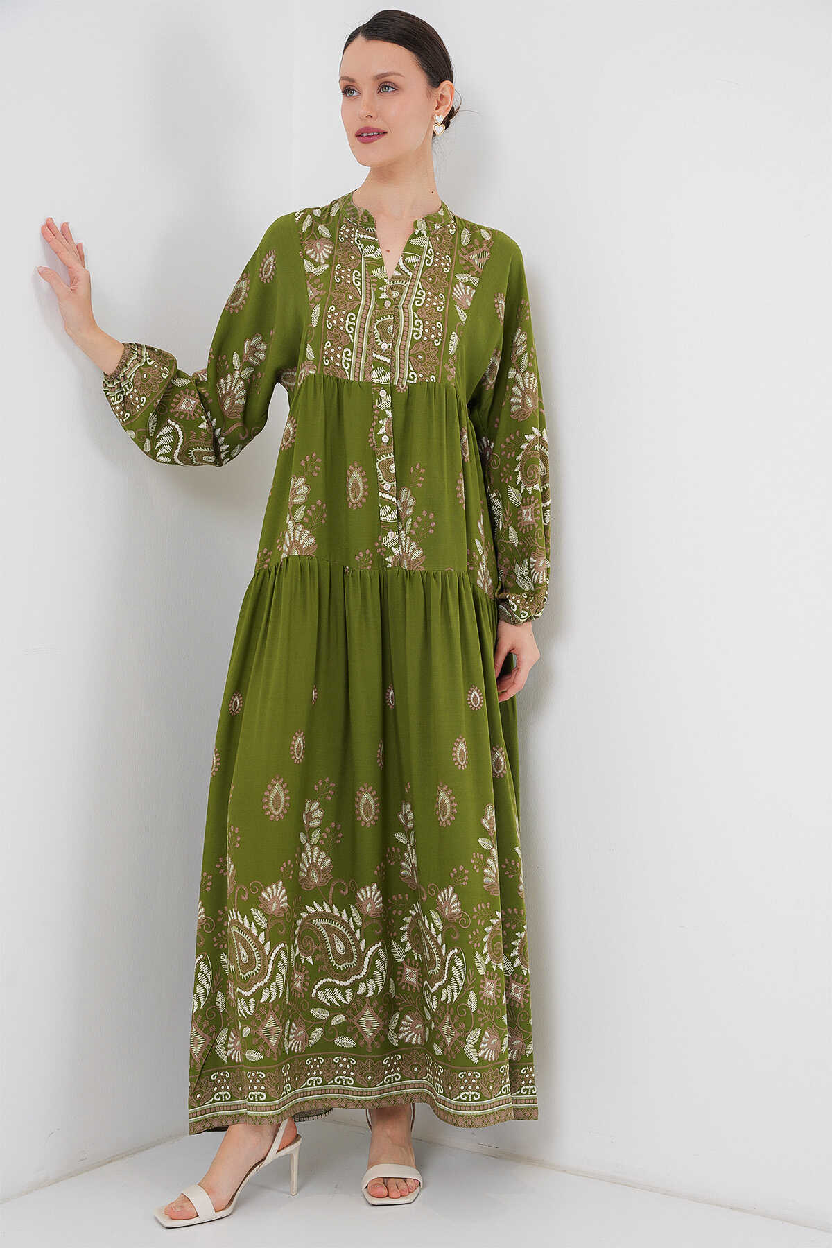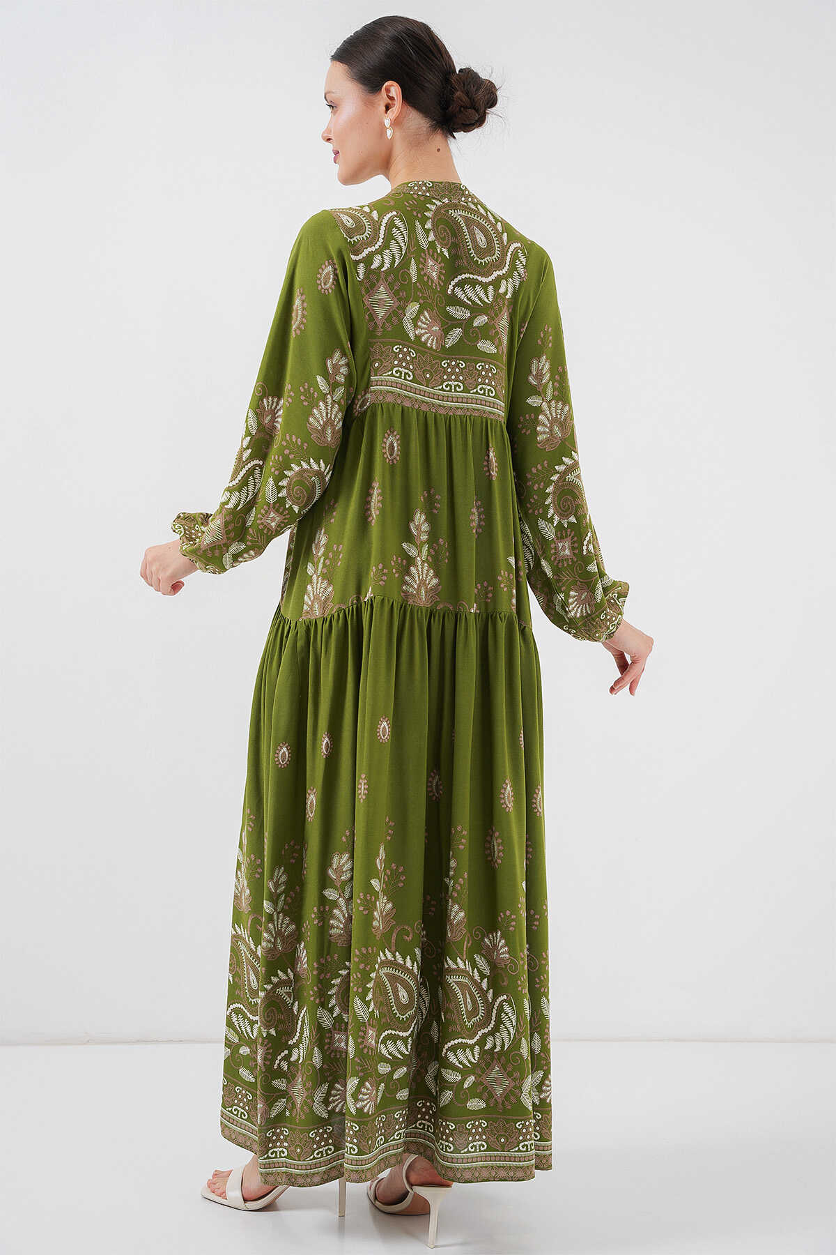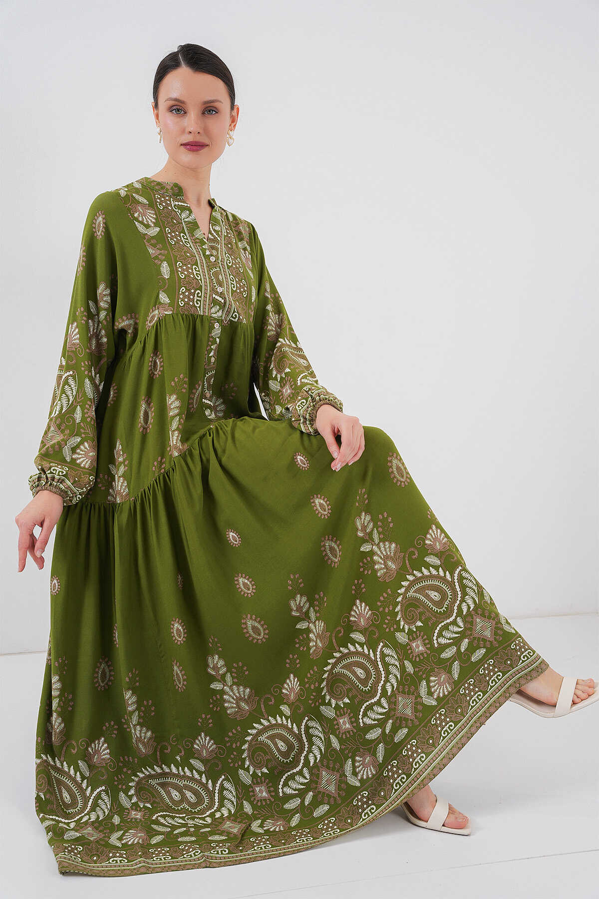 2423 Otantik Desenli Tesettür Elbise - D.Haki
