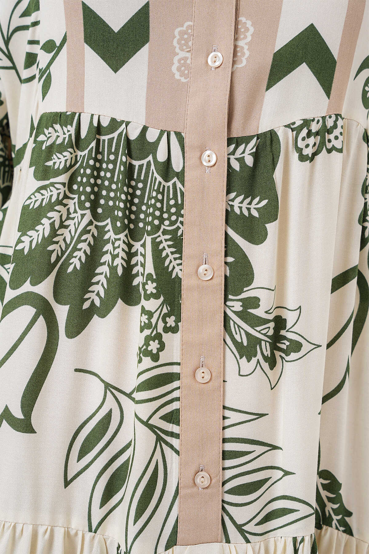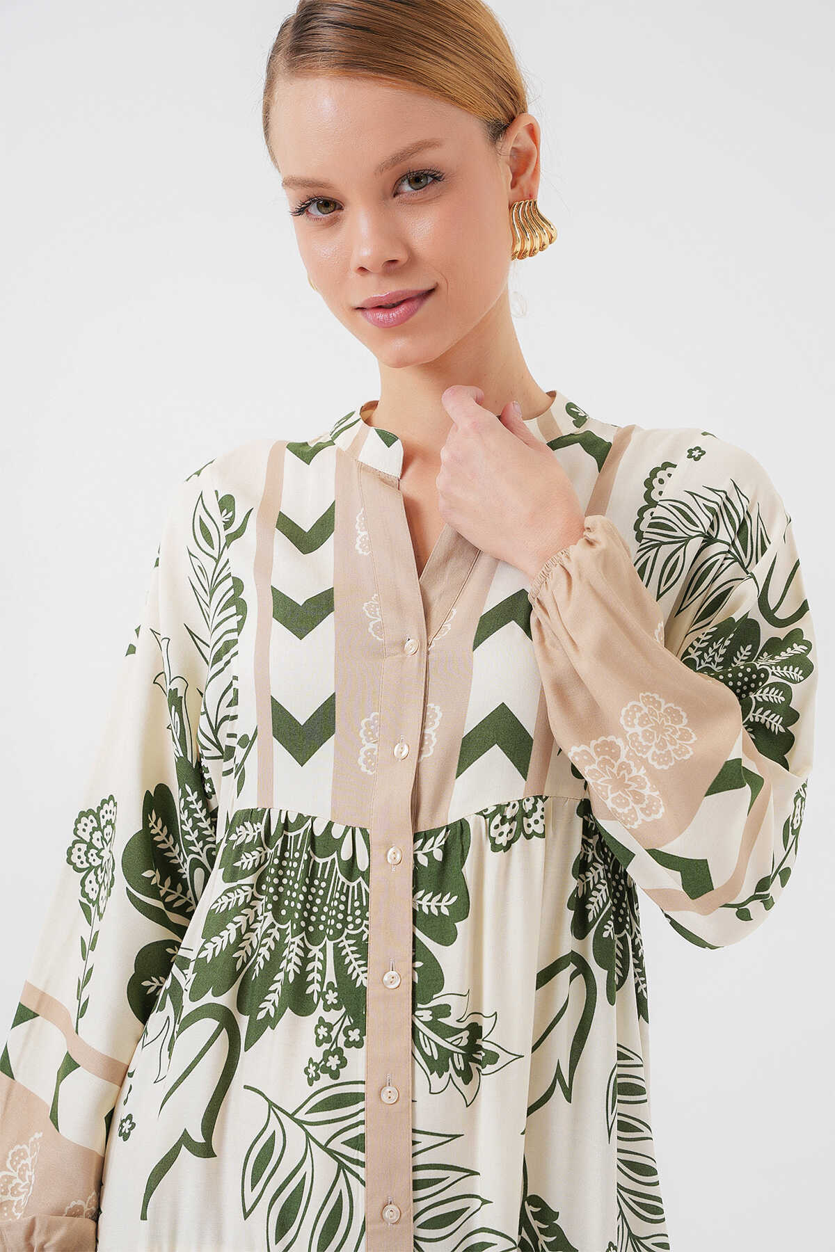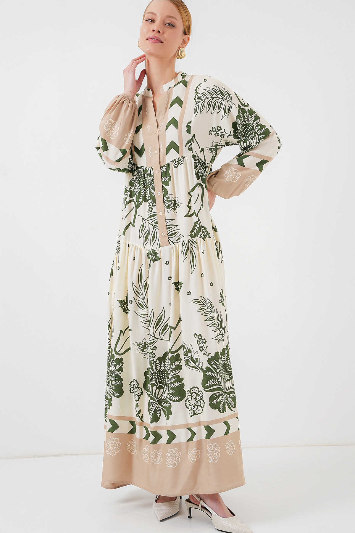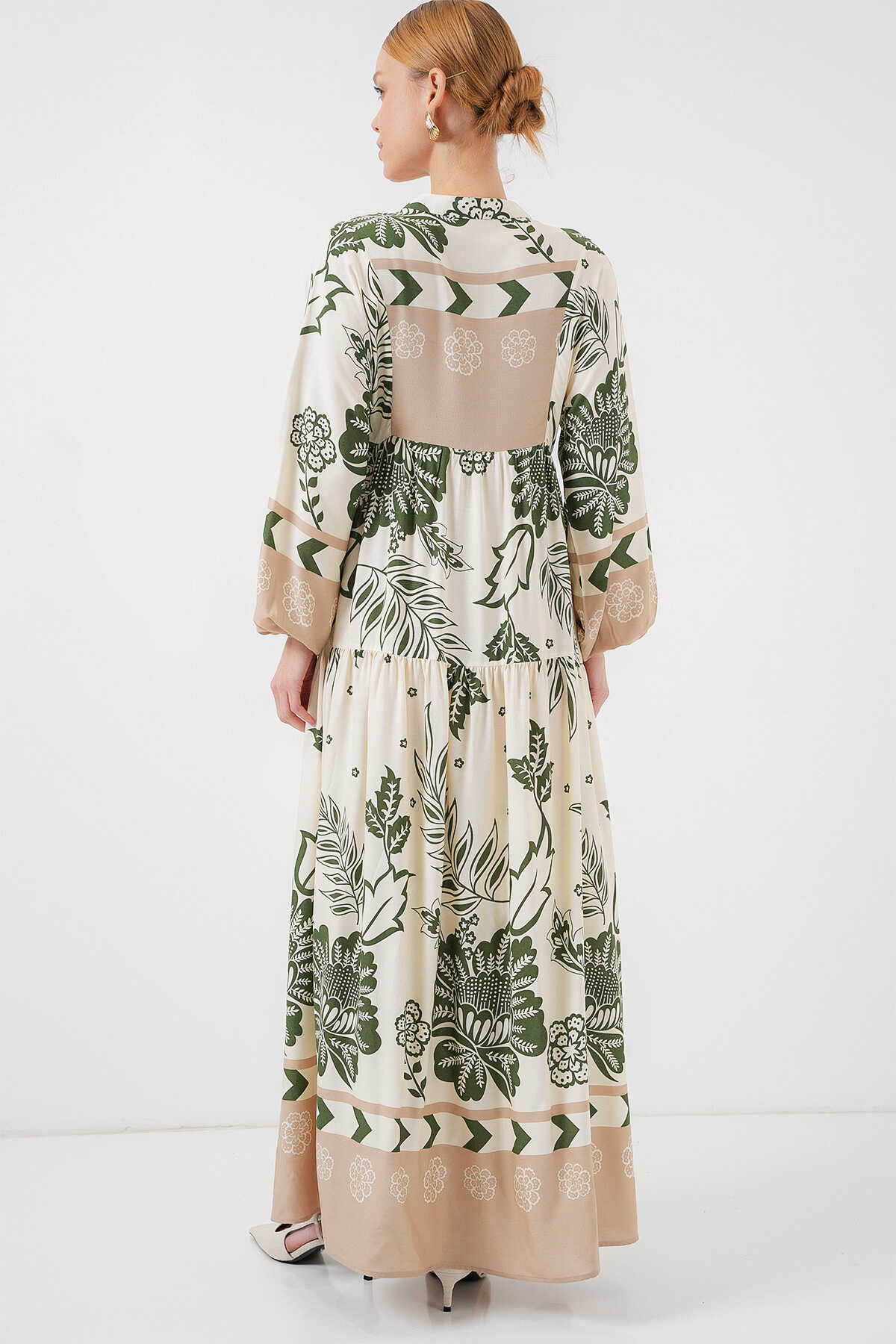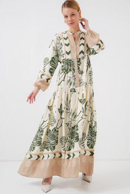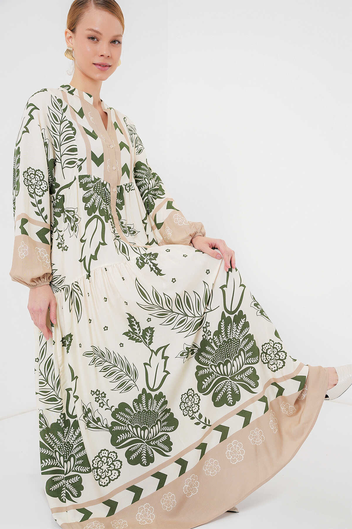2423 Otantik Desenli Tesettür Elbise - E.Haki