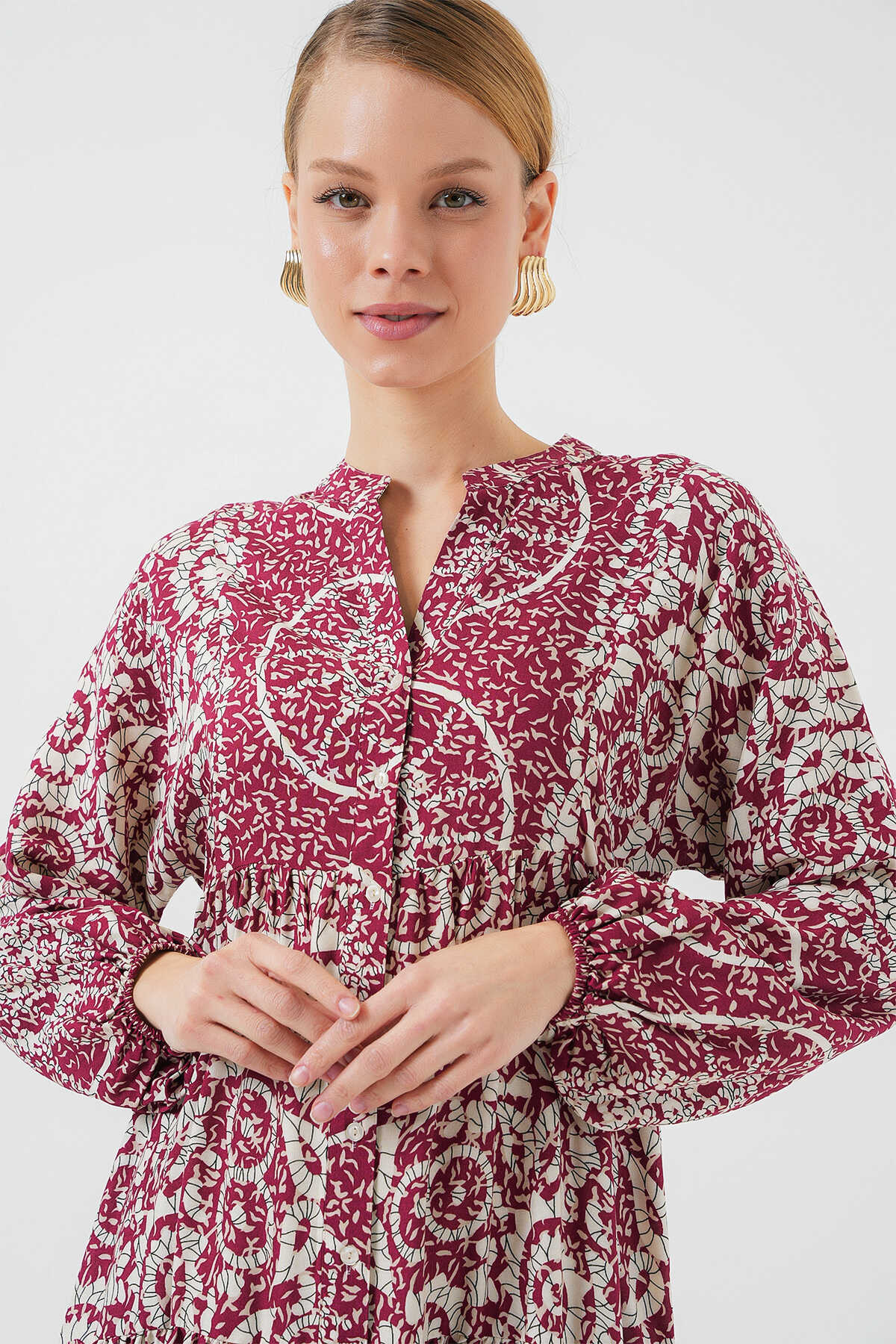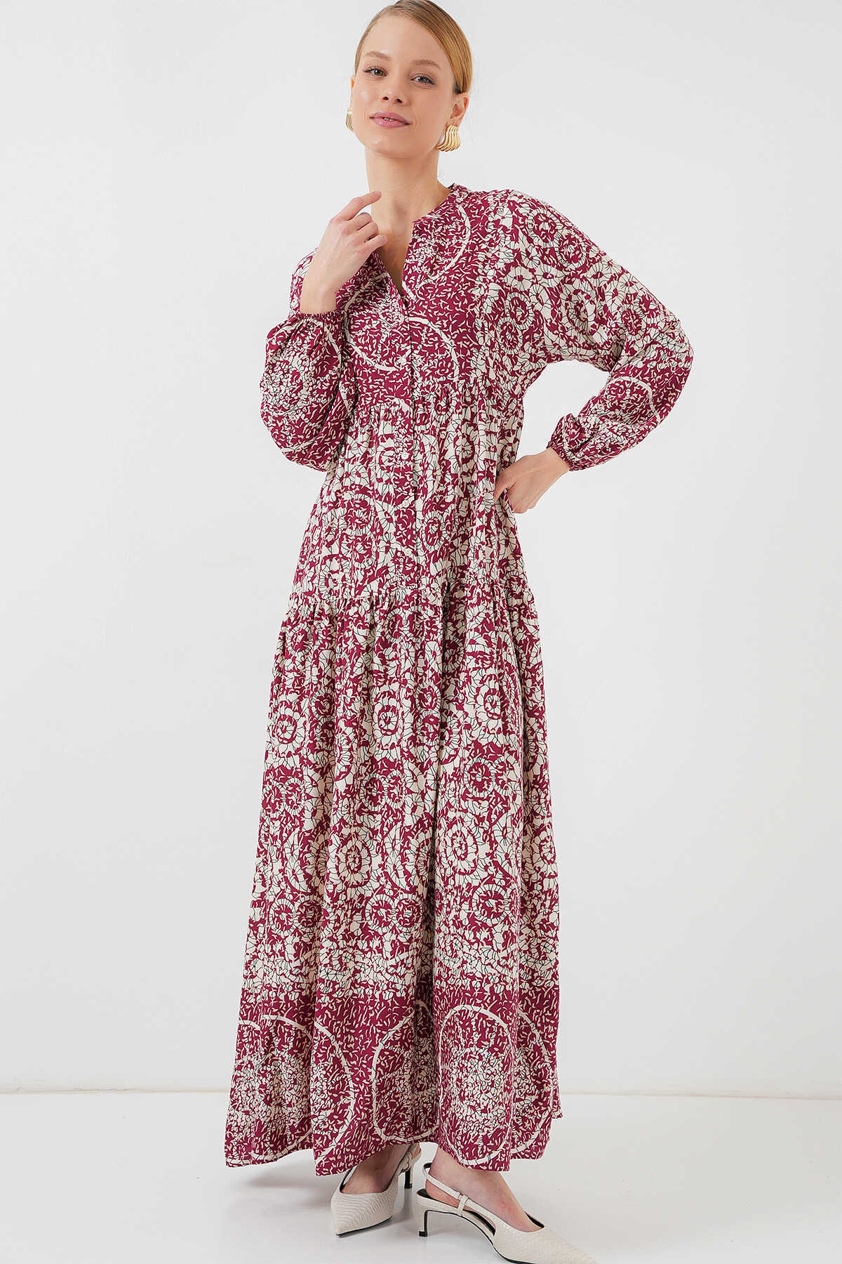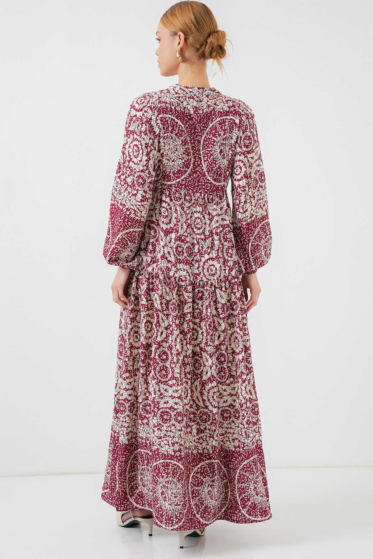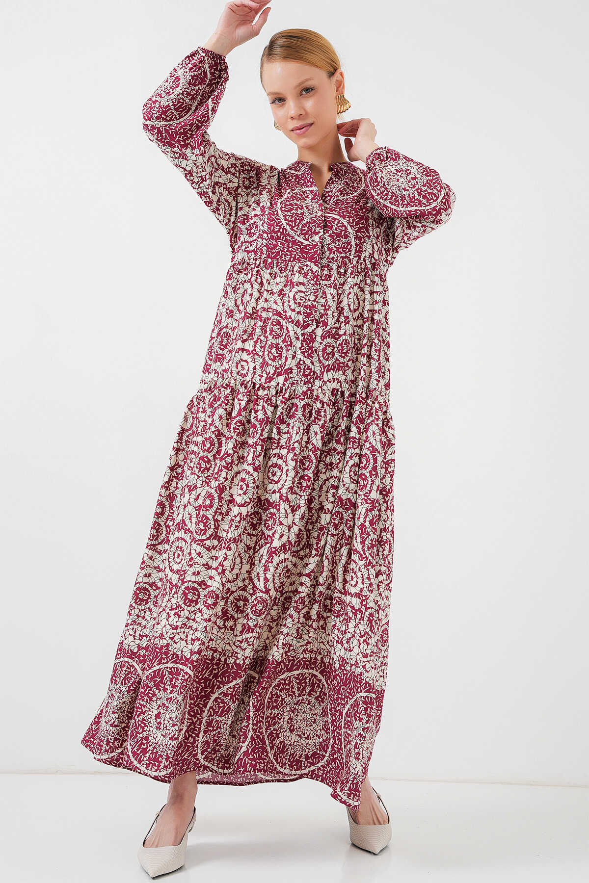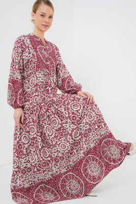 2423 Otantik Desenli Tesettür Elbise - E. Fuşya