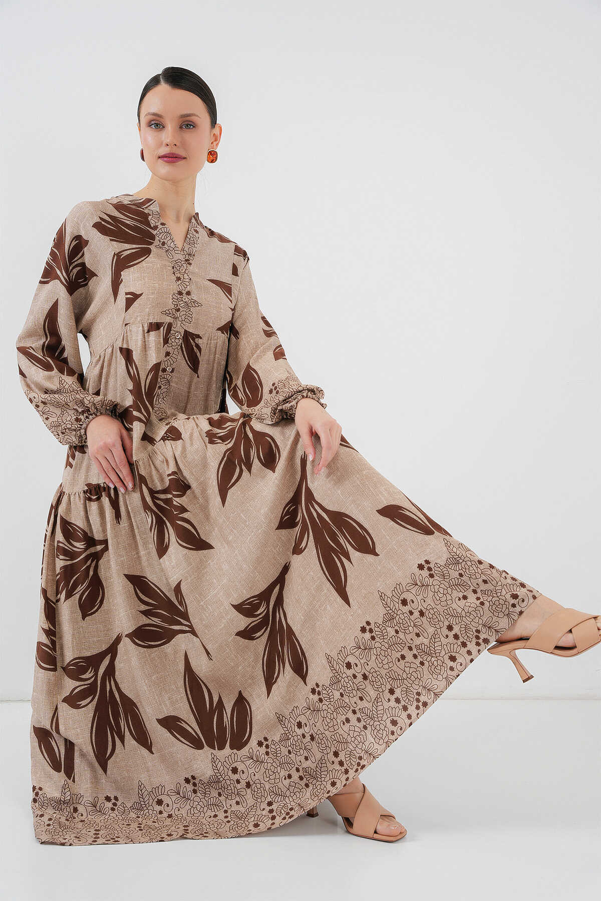 2423 Otantik Desenli Tesettür Elbise - F.Bej