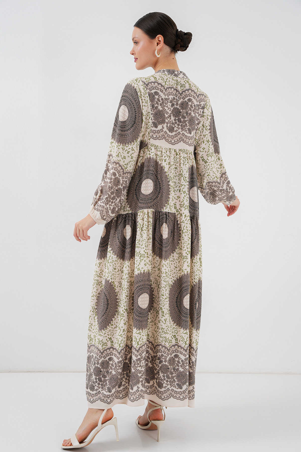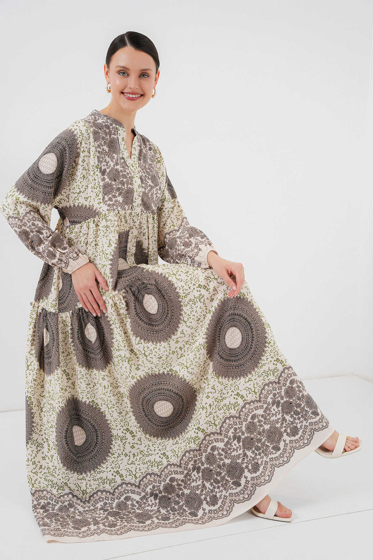 2423 Otantik Desenli Tesettür Elbise - F.KAHVE