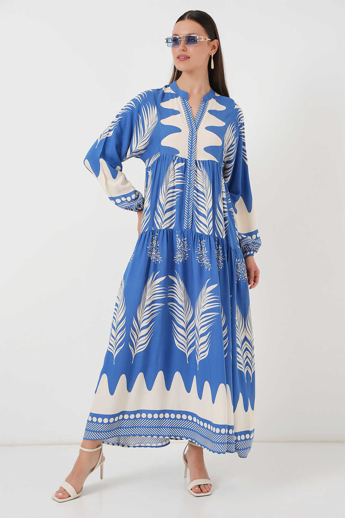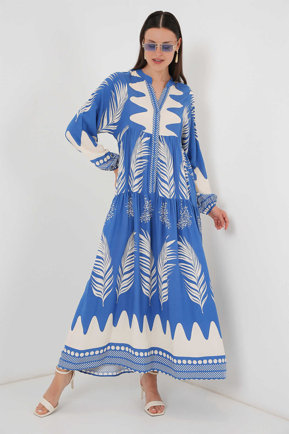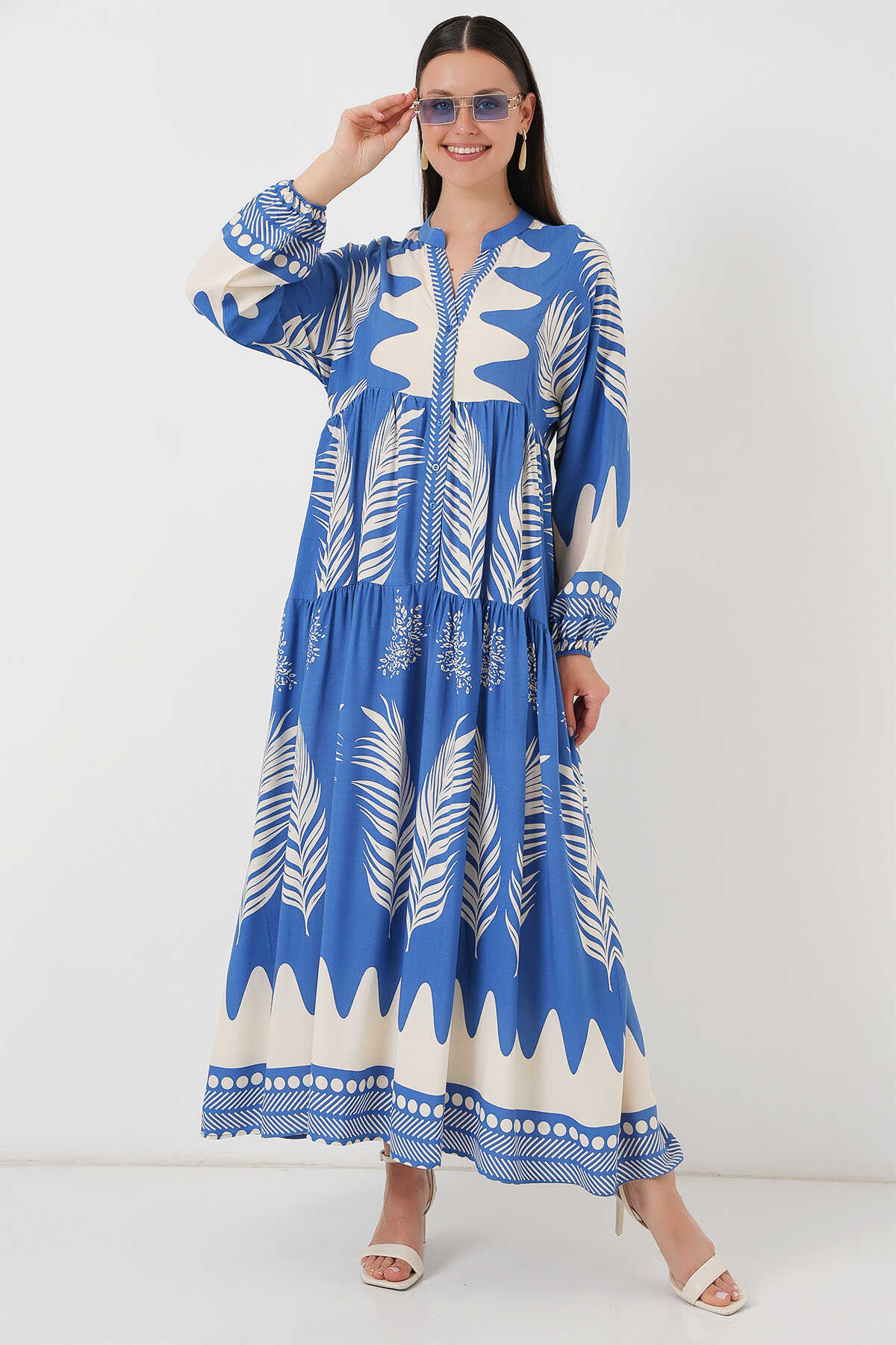 2423 Otantik Desenli Tesettür Elbise - H. İndigo