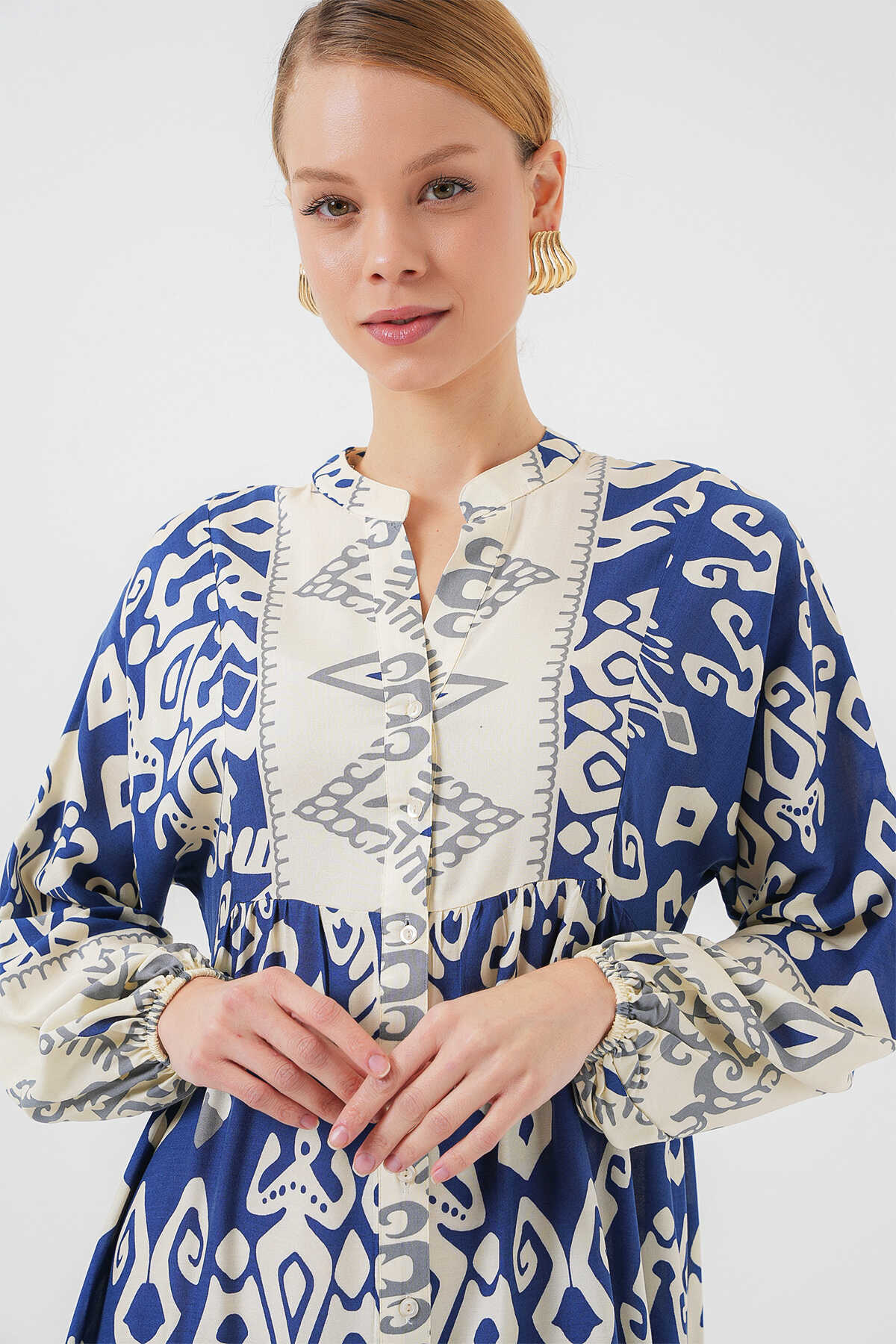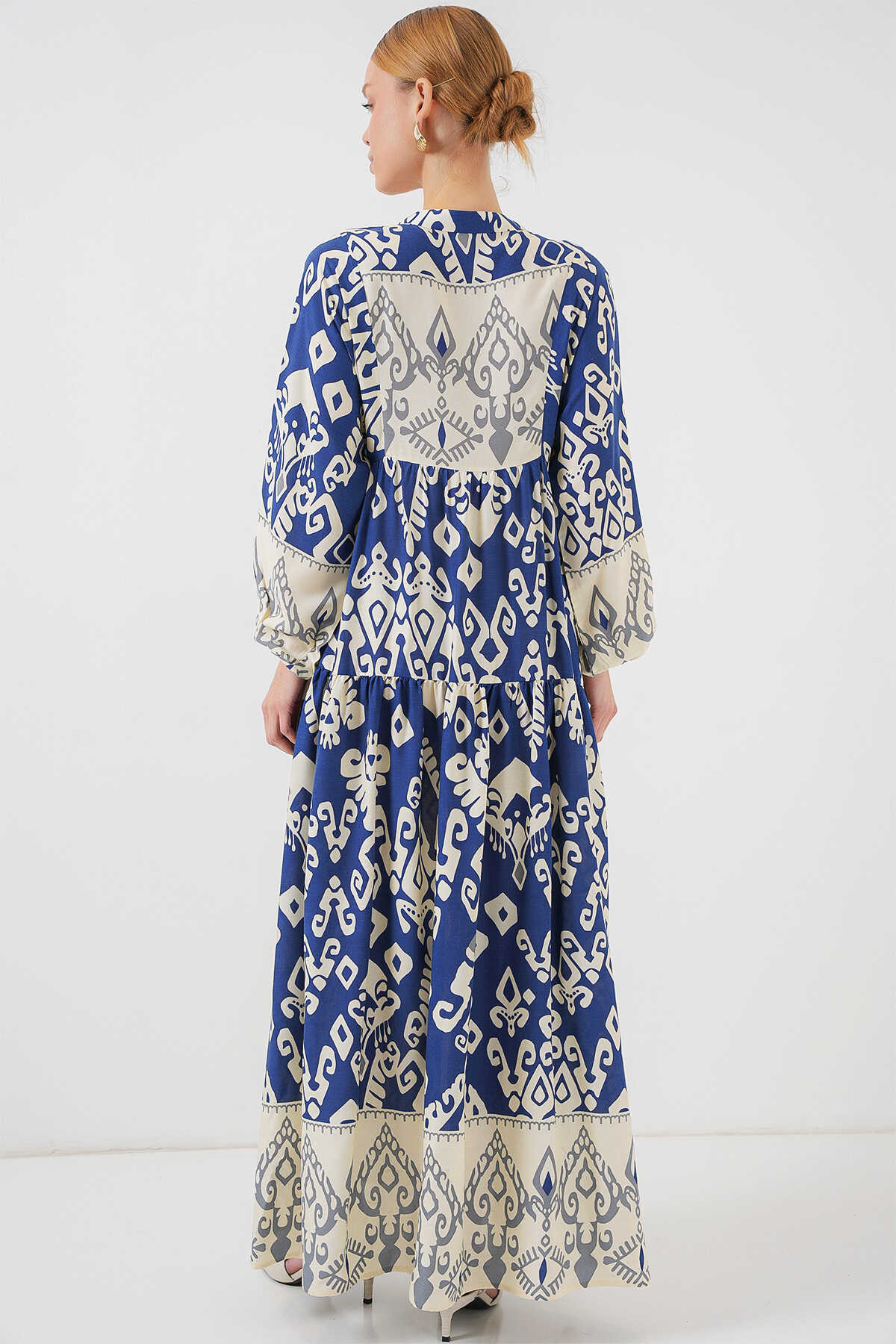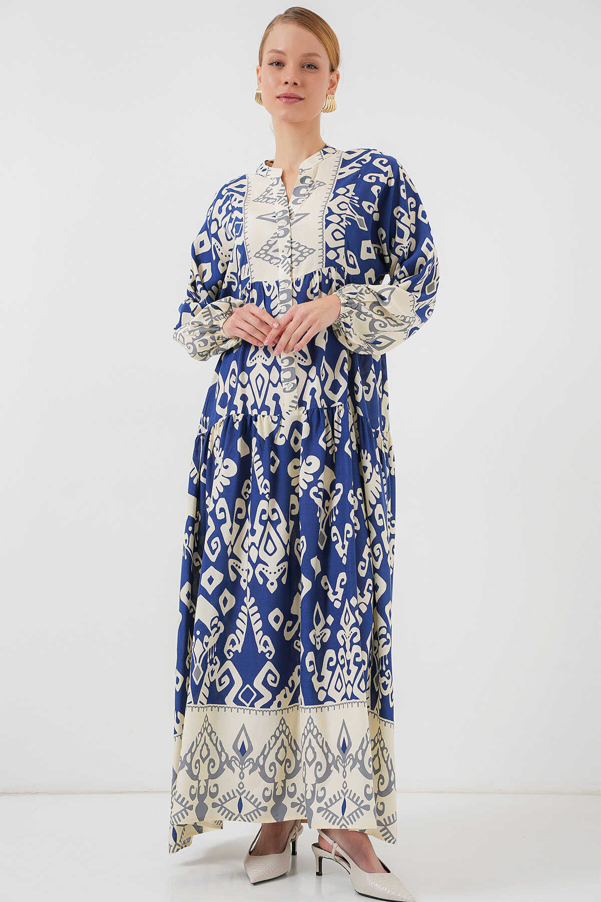2423 Otantik Desenli Tesettür Elbise - İndigo 1