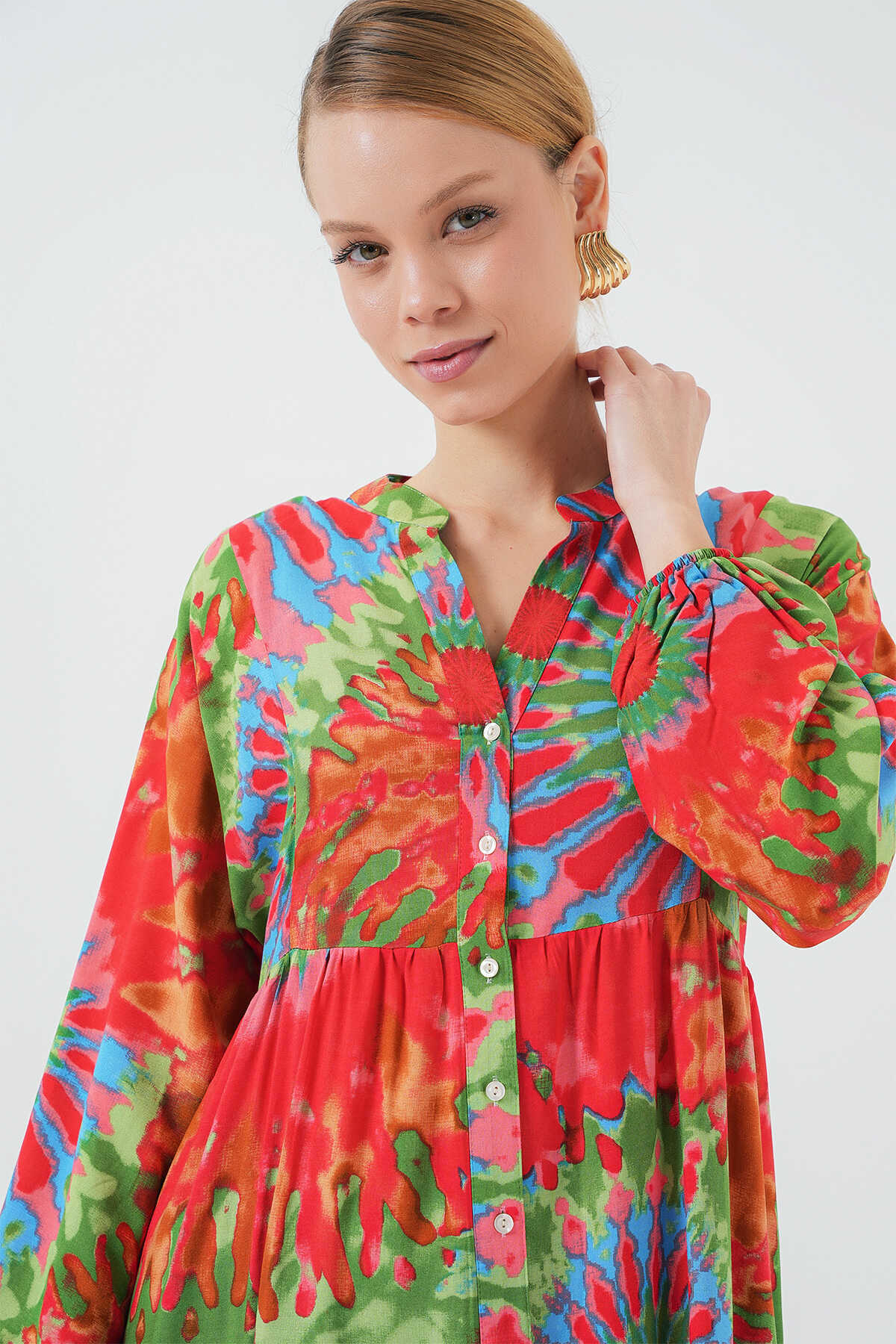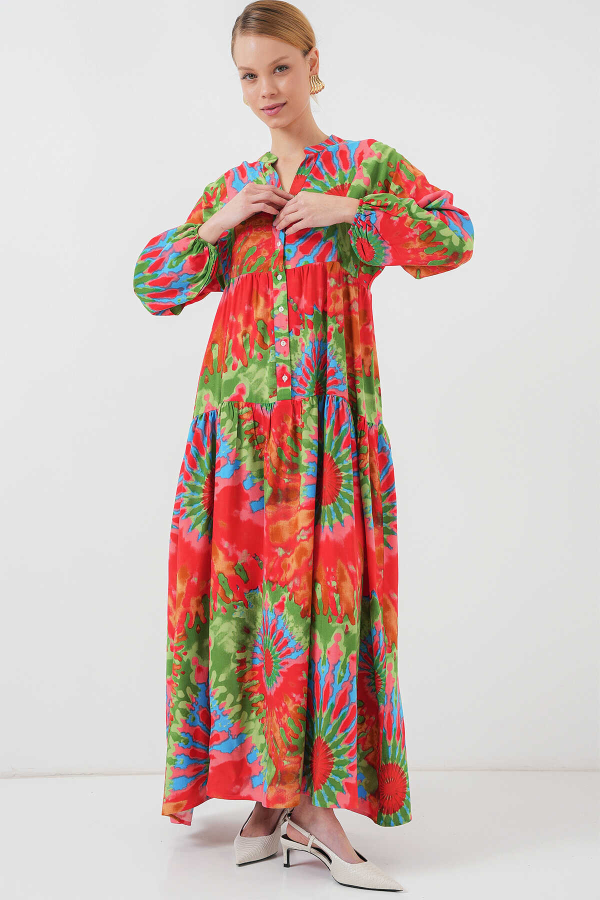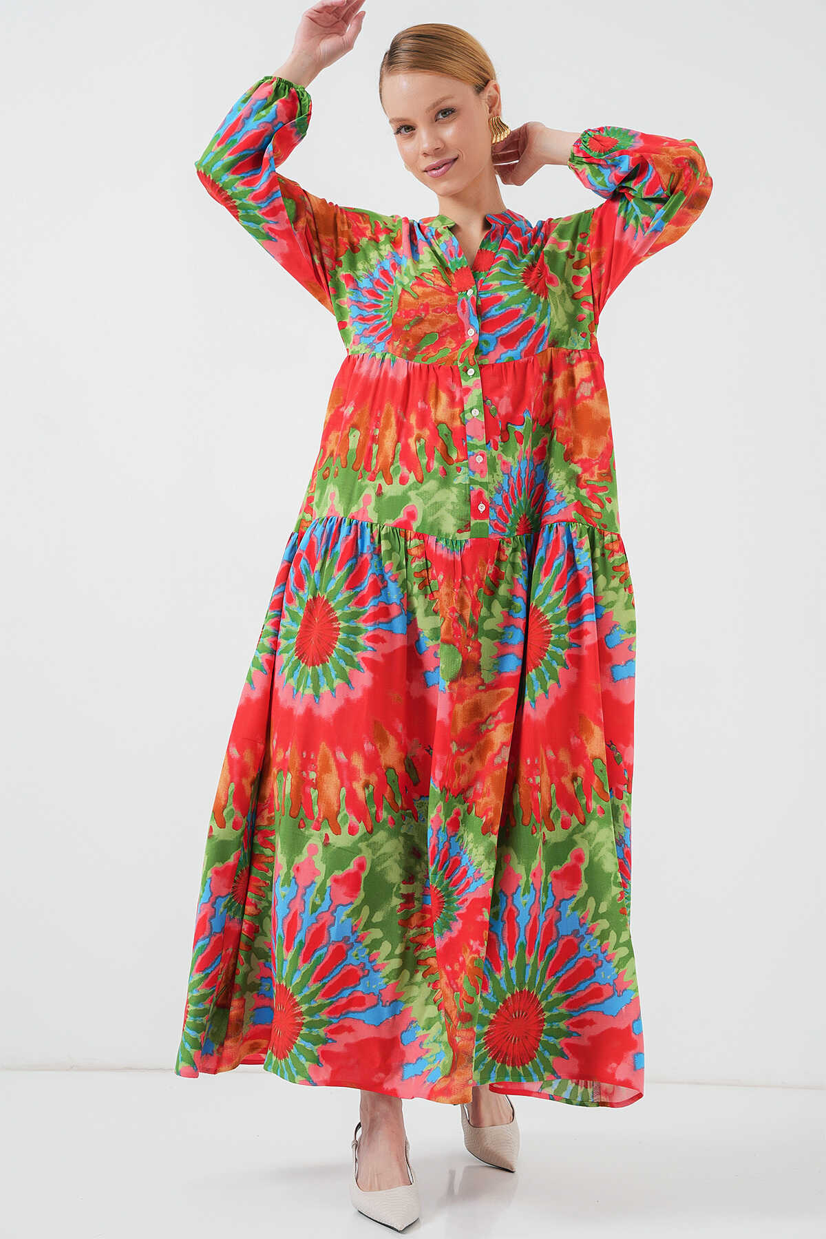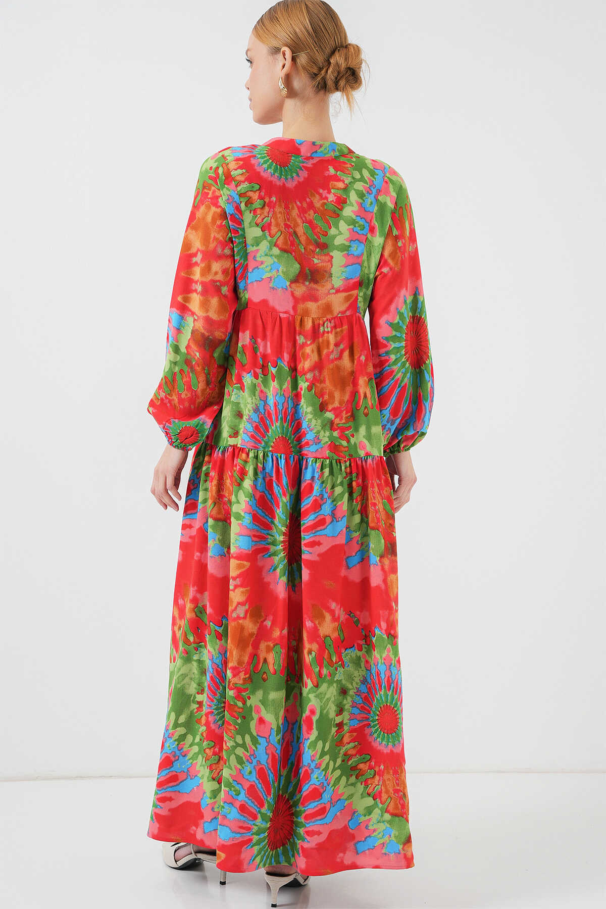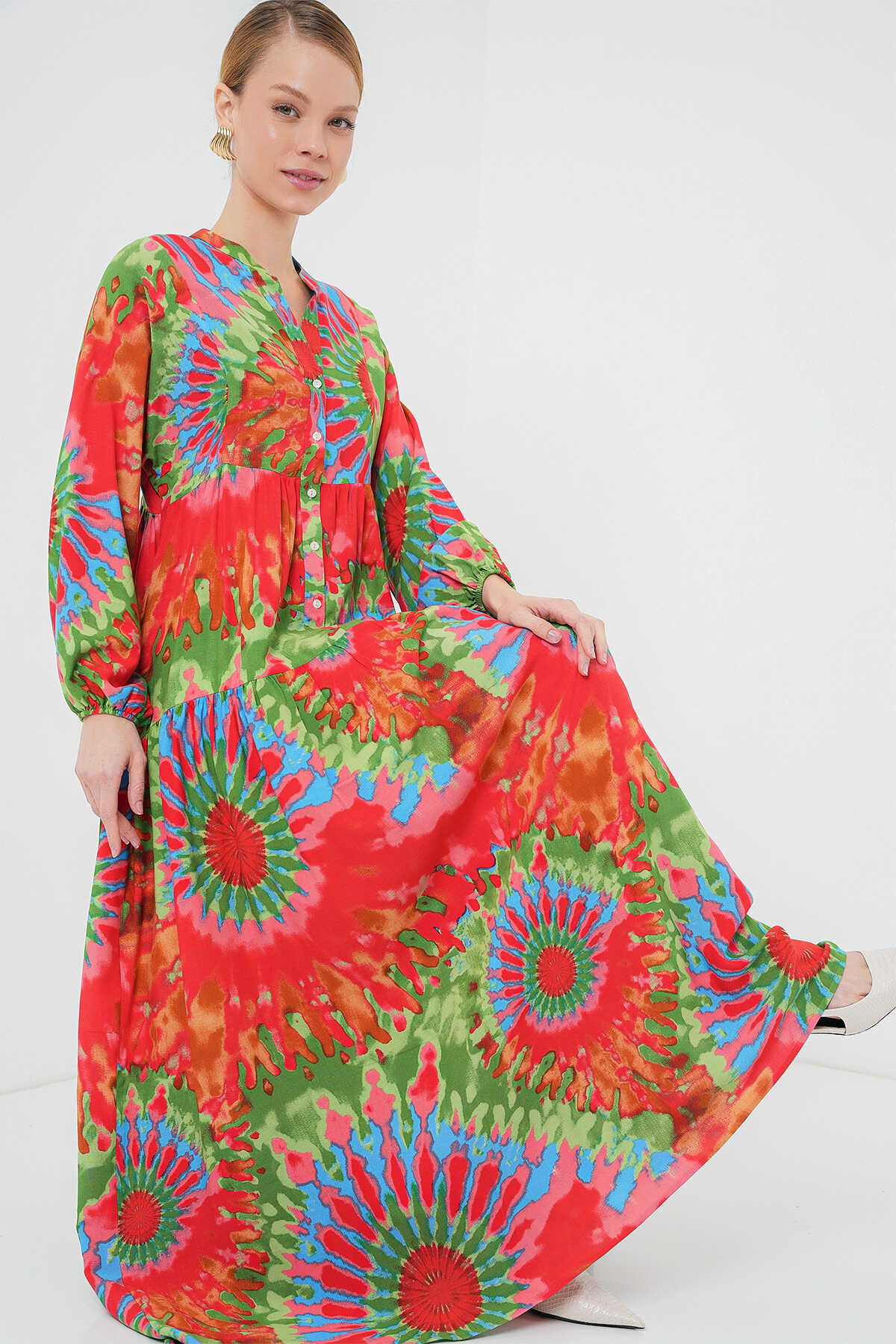 2423 Otantik Desenli Tesettür Elbise - L. Kırmızı