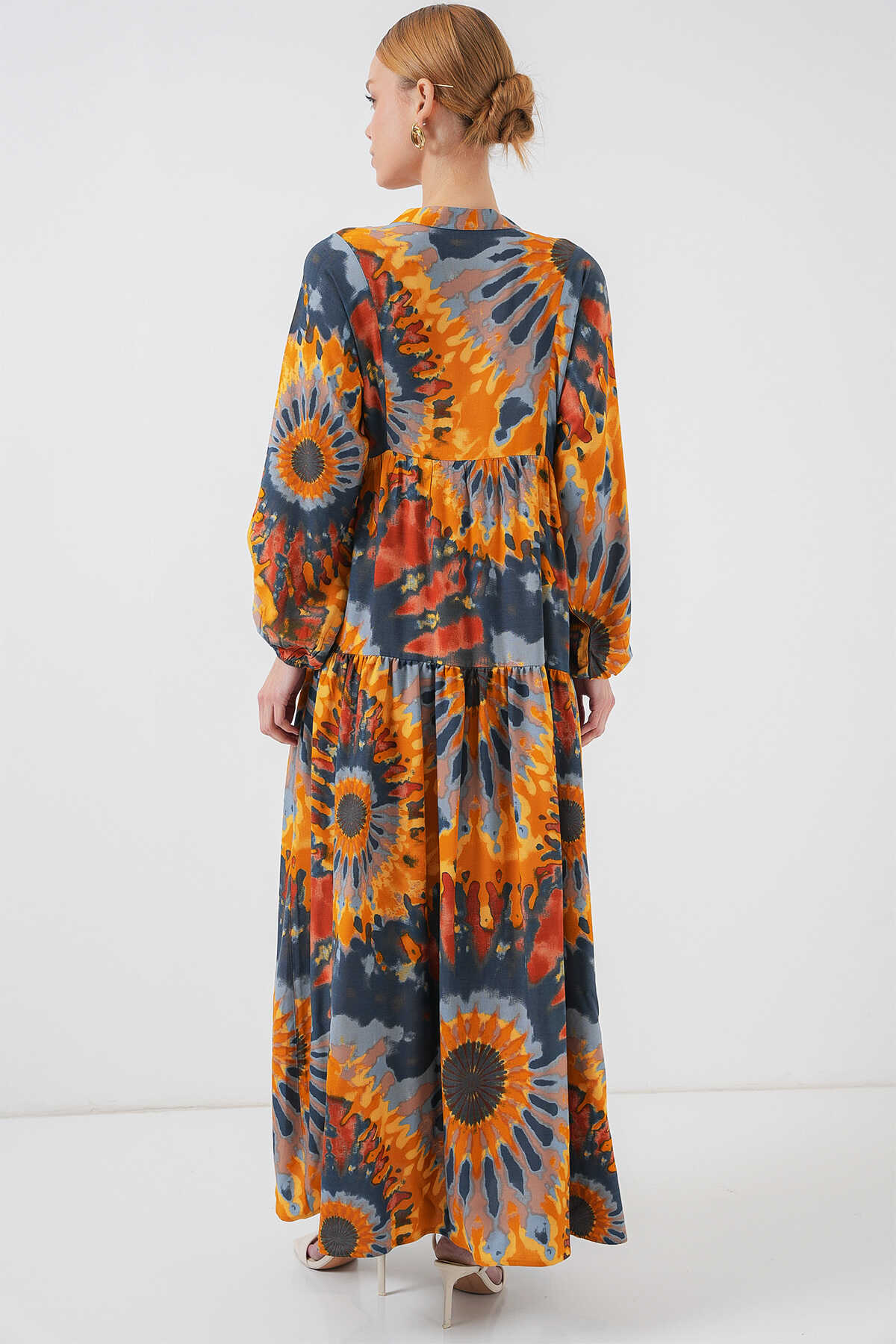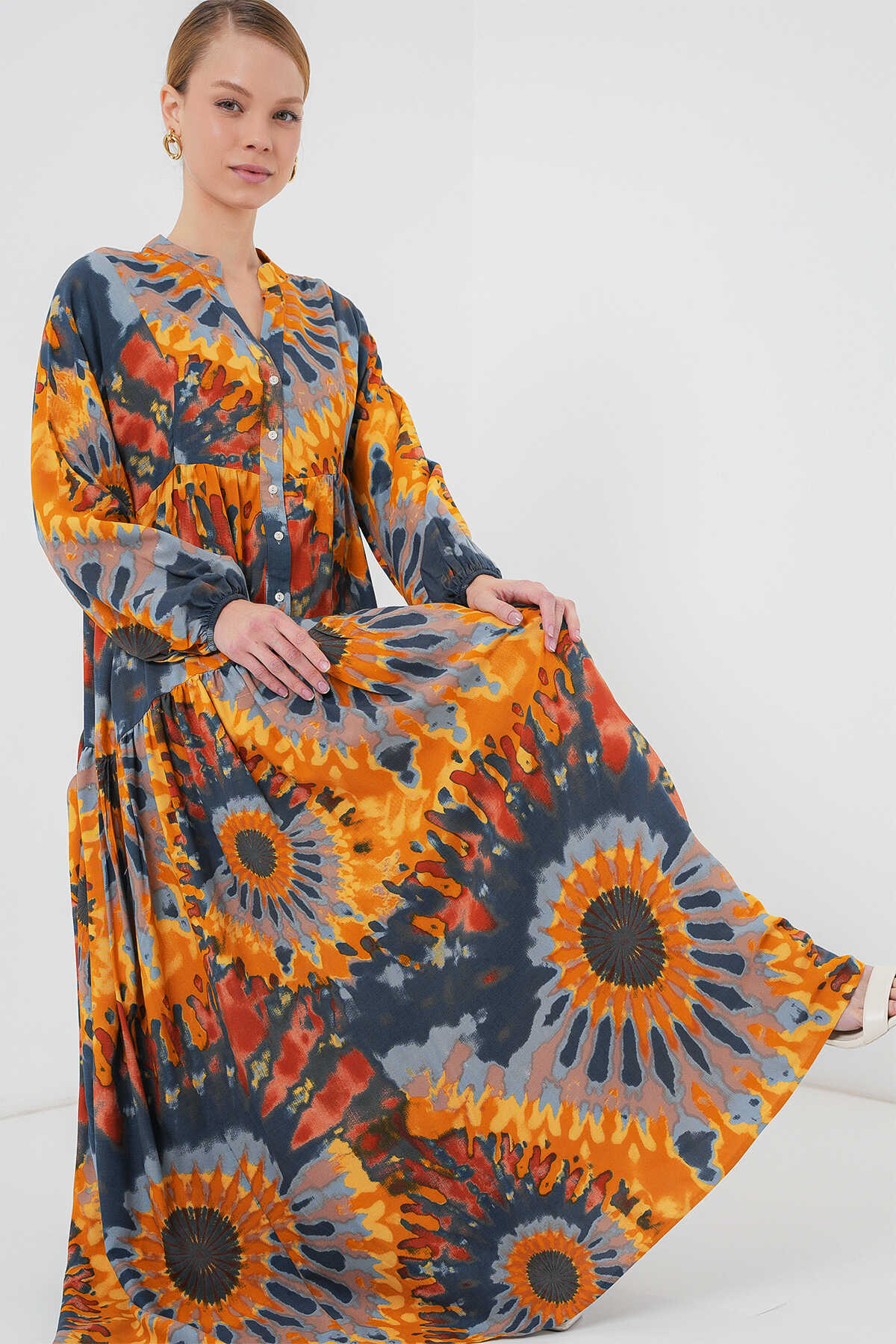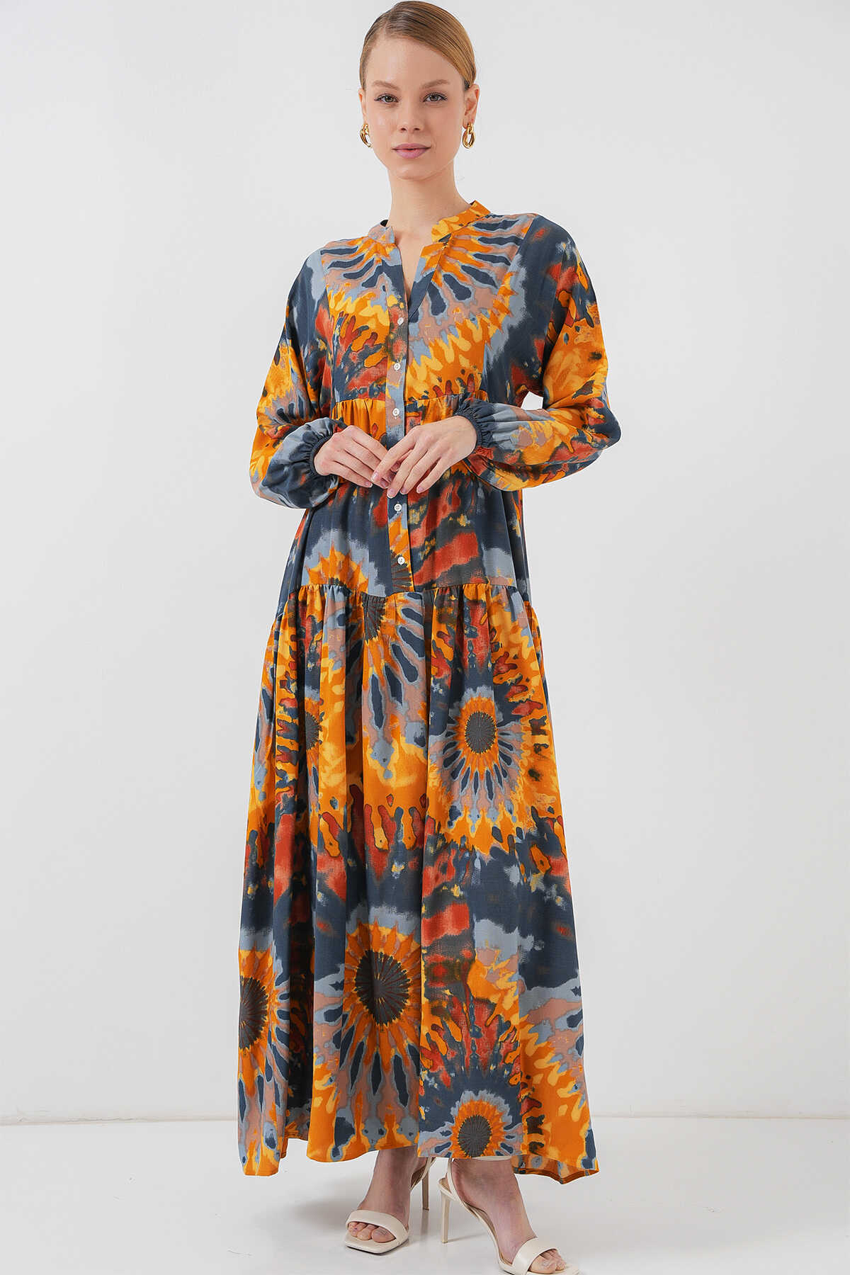 2423 Otantik Desenli Tesettür Elbise - L. Turuncu