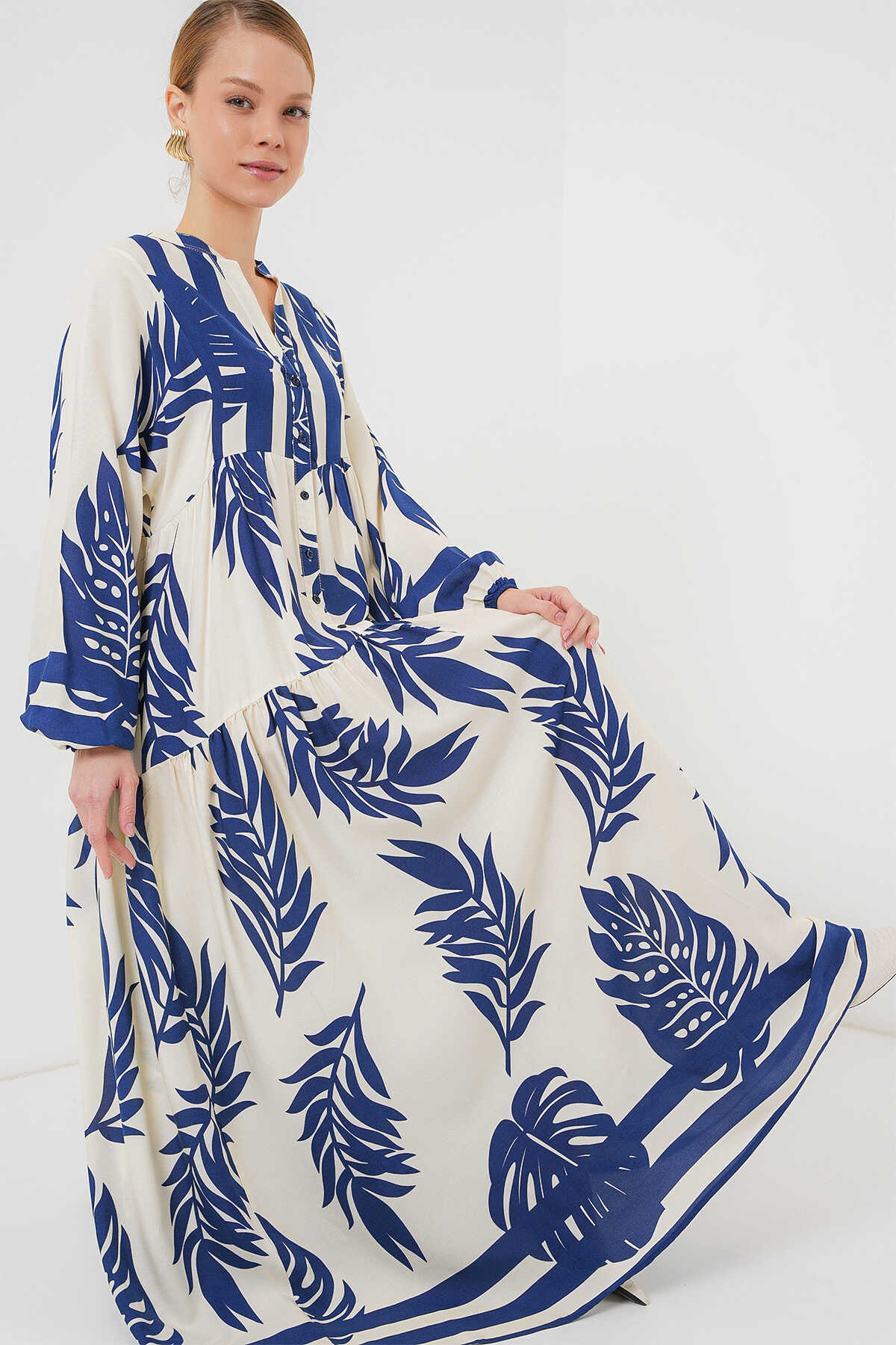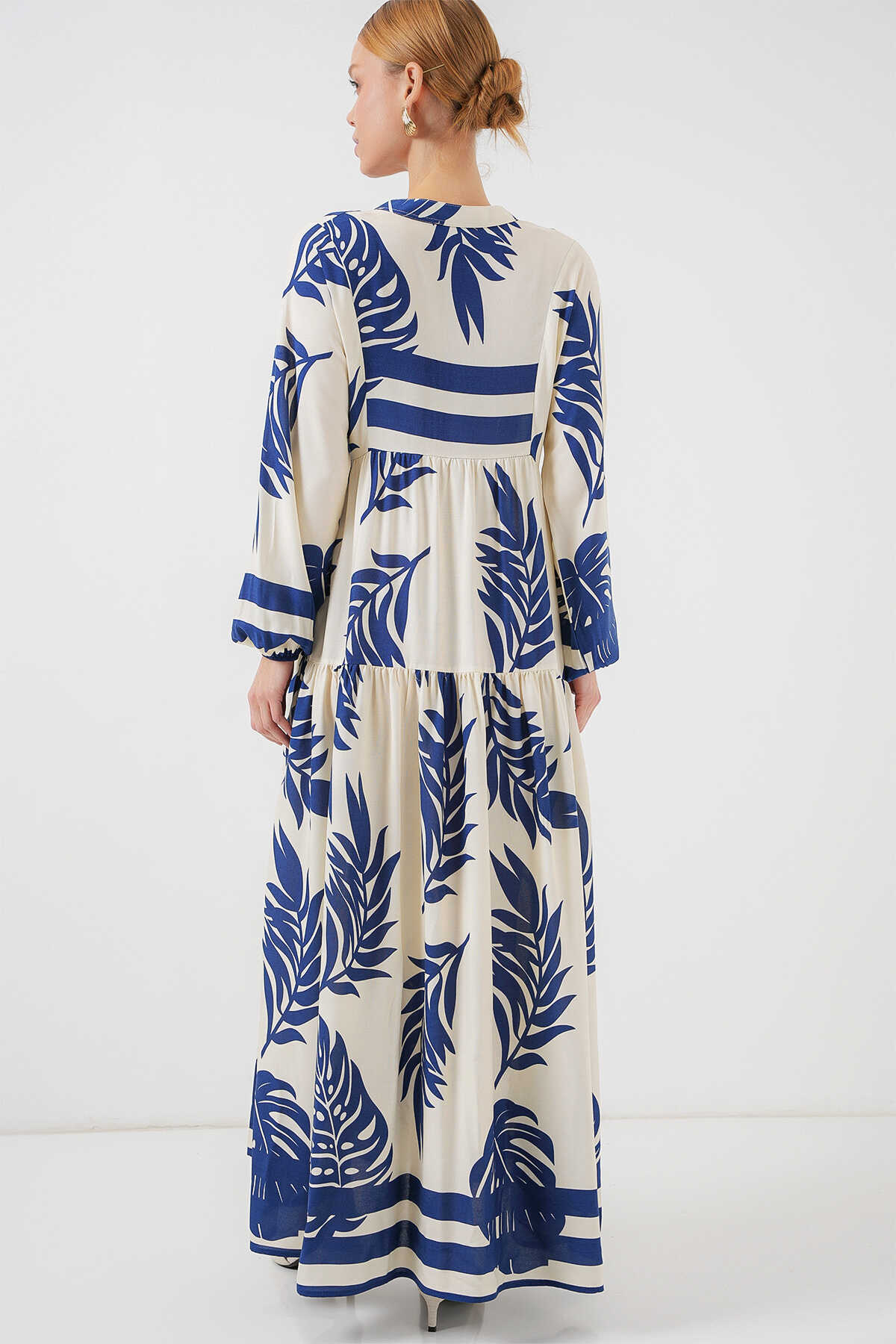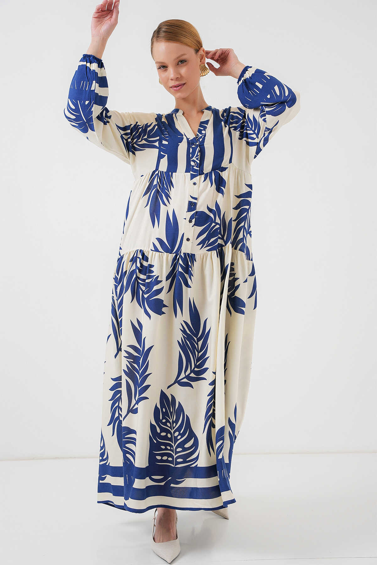 2423 Otantik Desenli Tesettür Elbise - Lacivert 0