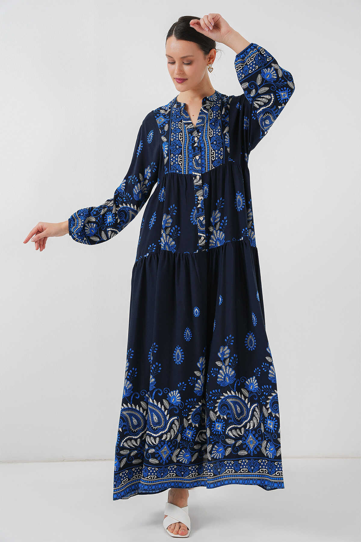 2423 Otantik Desenli Tesettür Elbise - Lacivert 1