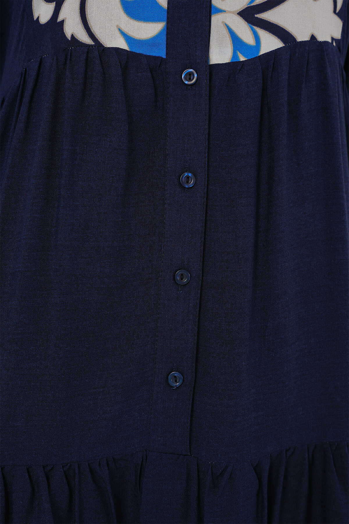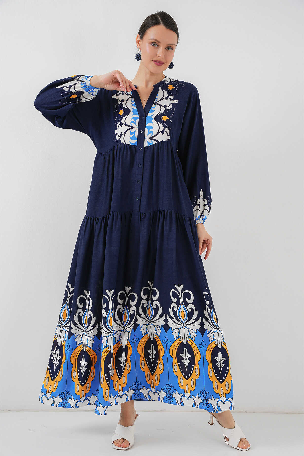 2423 Otantik Desenli Tesettür Elbise - Lacivert 4