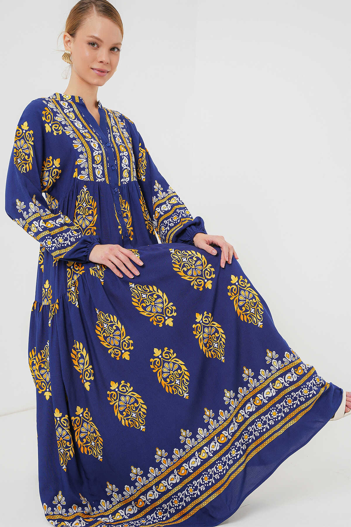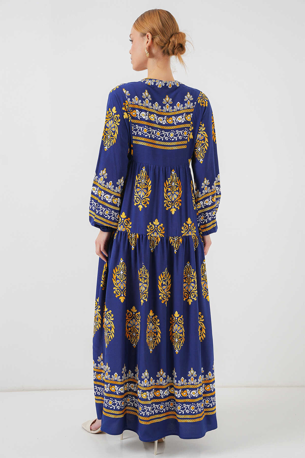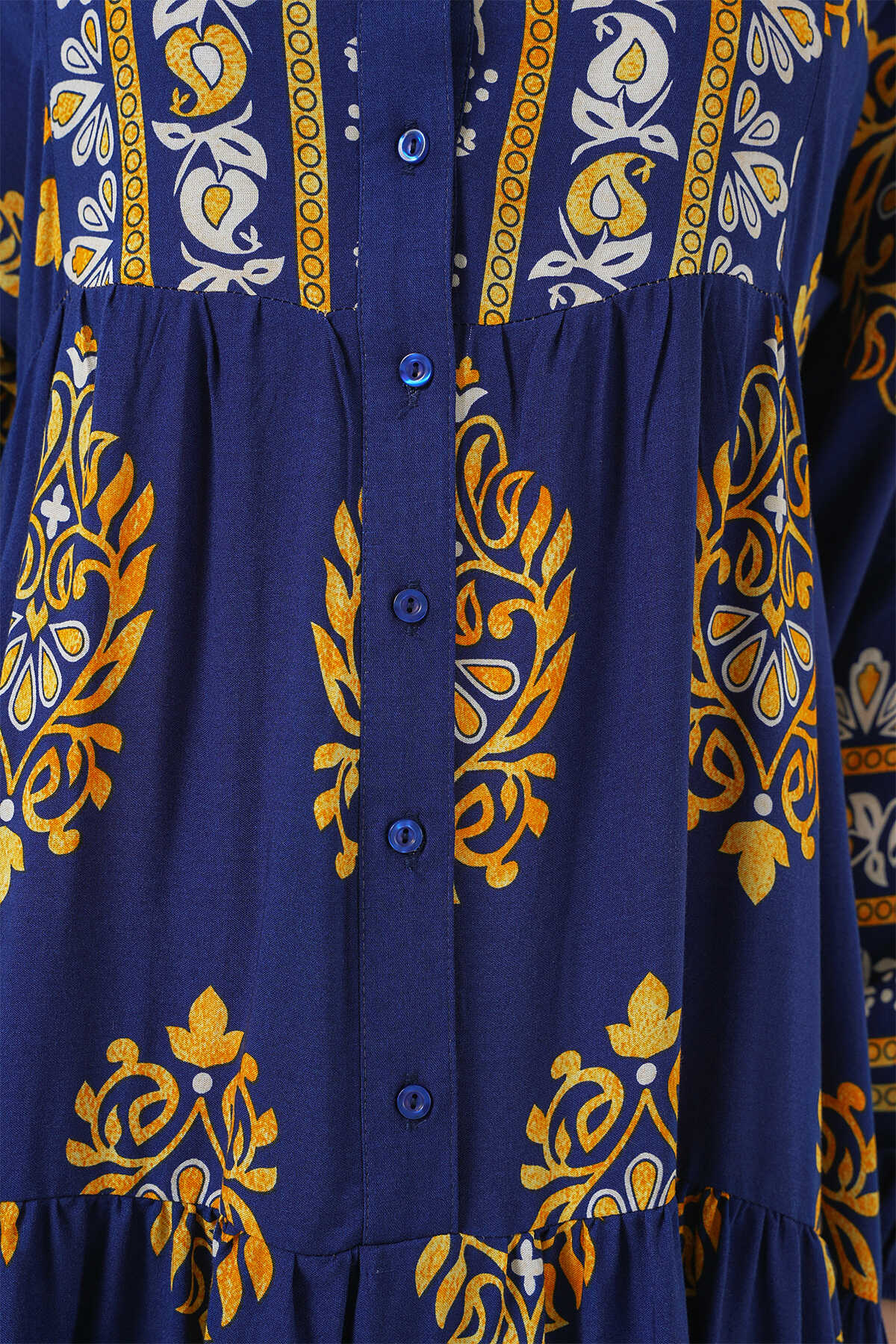 2423 Otantik Desenli Tesettür Elbise - Lacivert 6