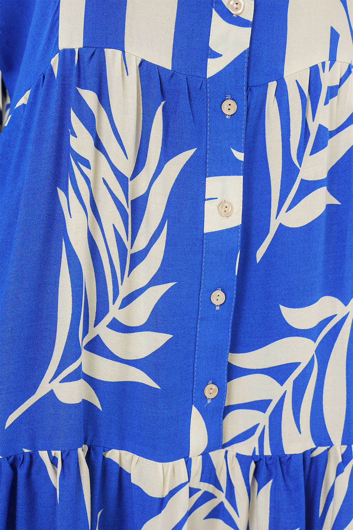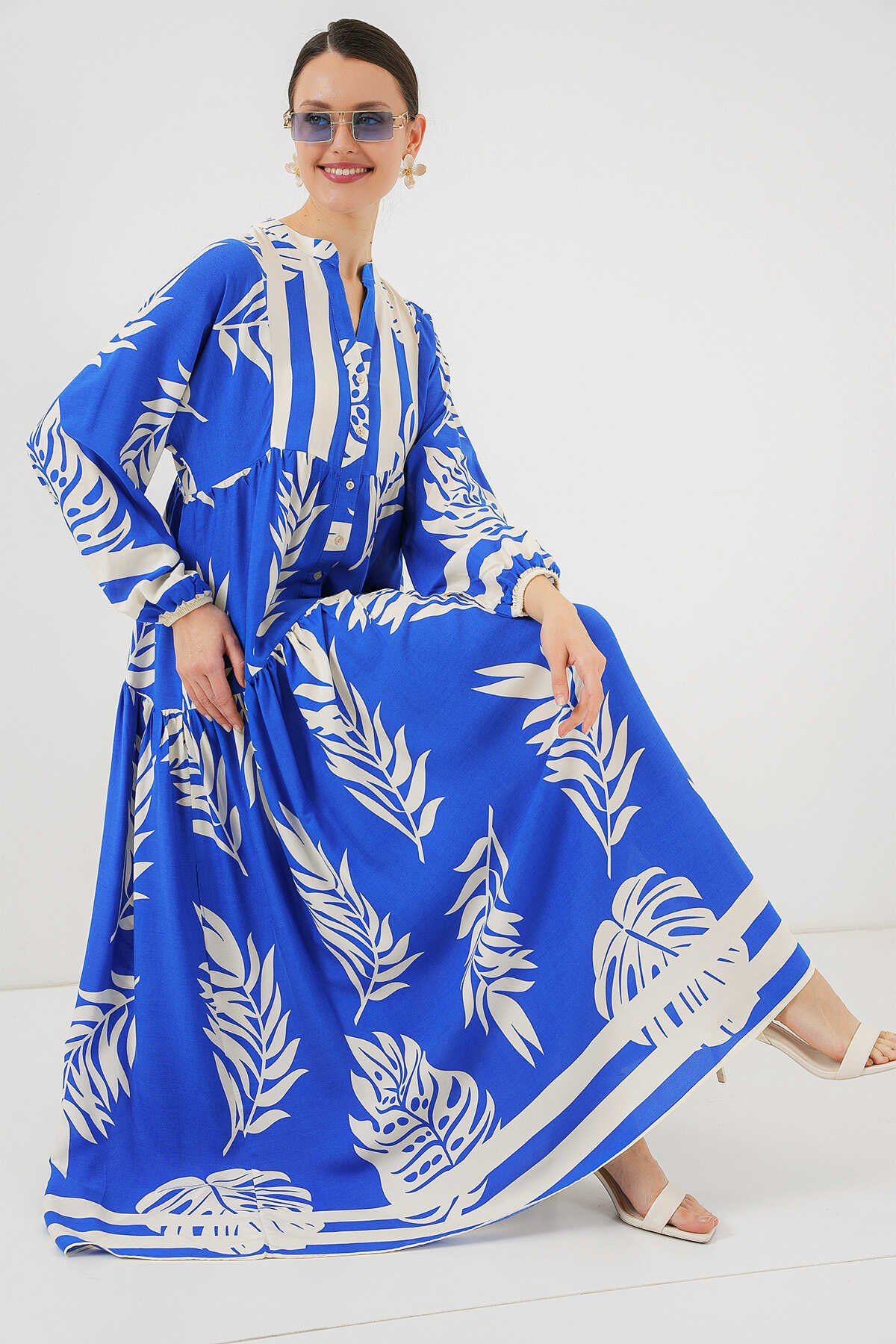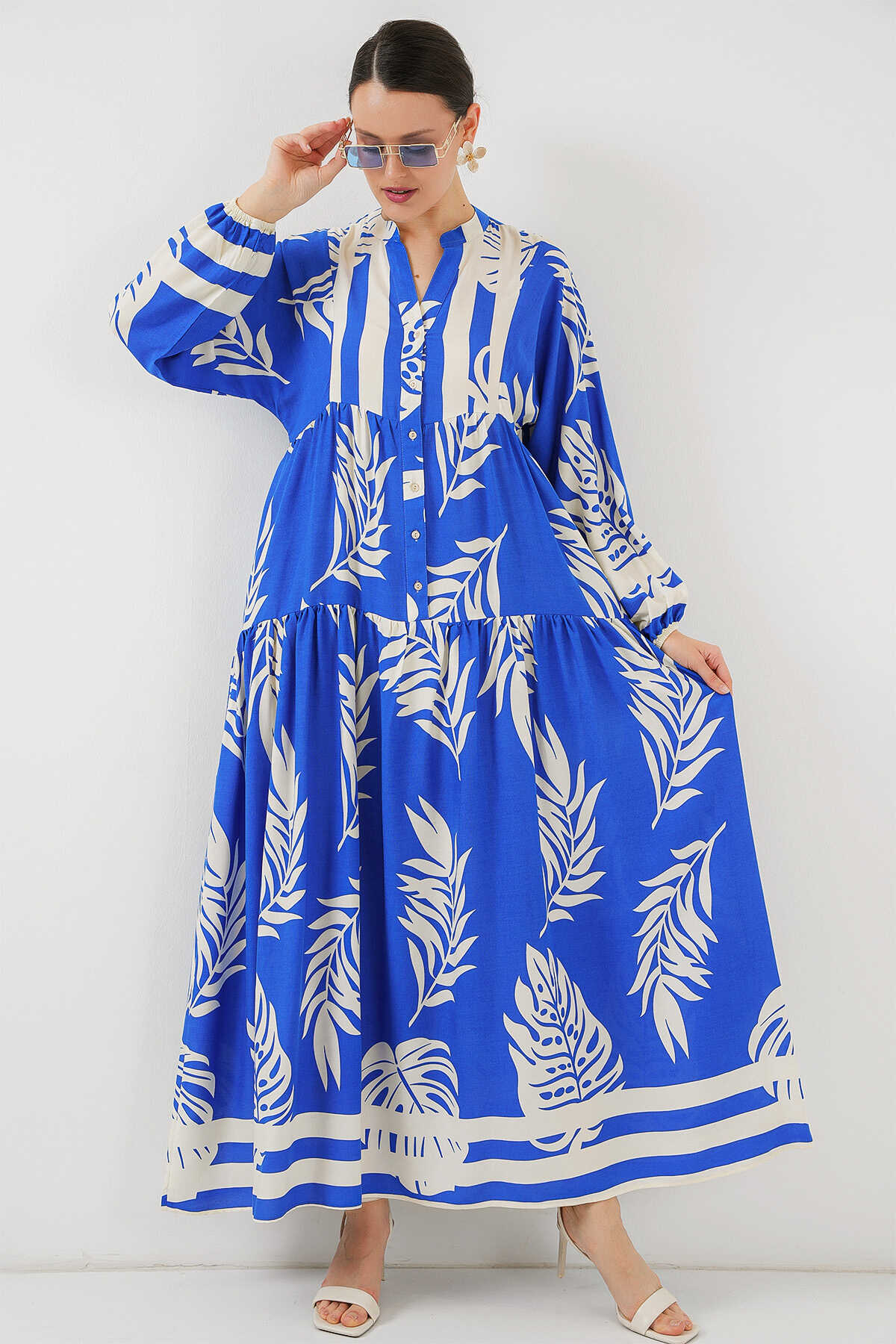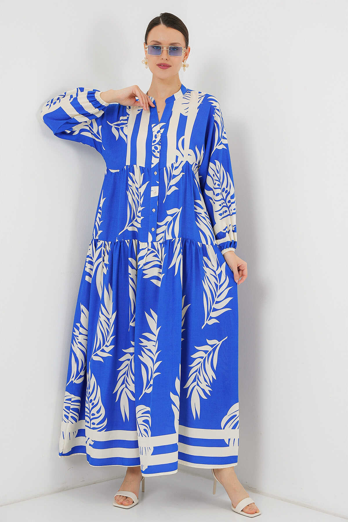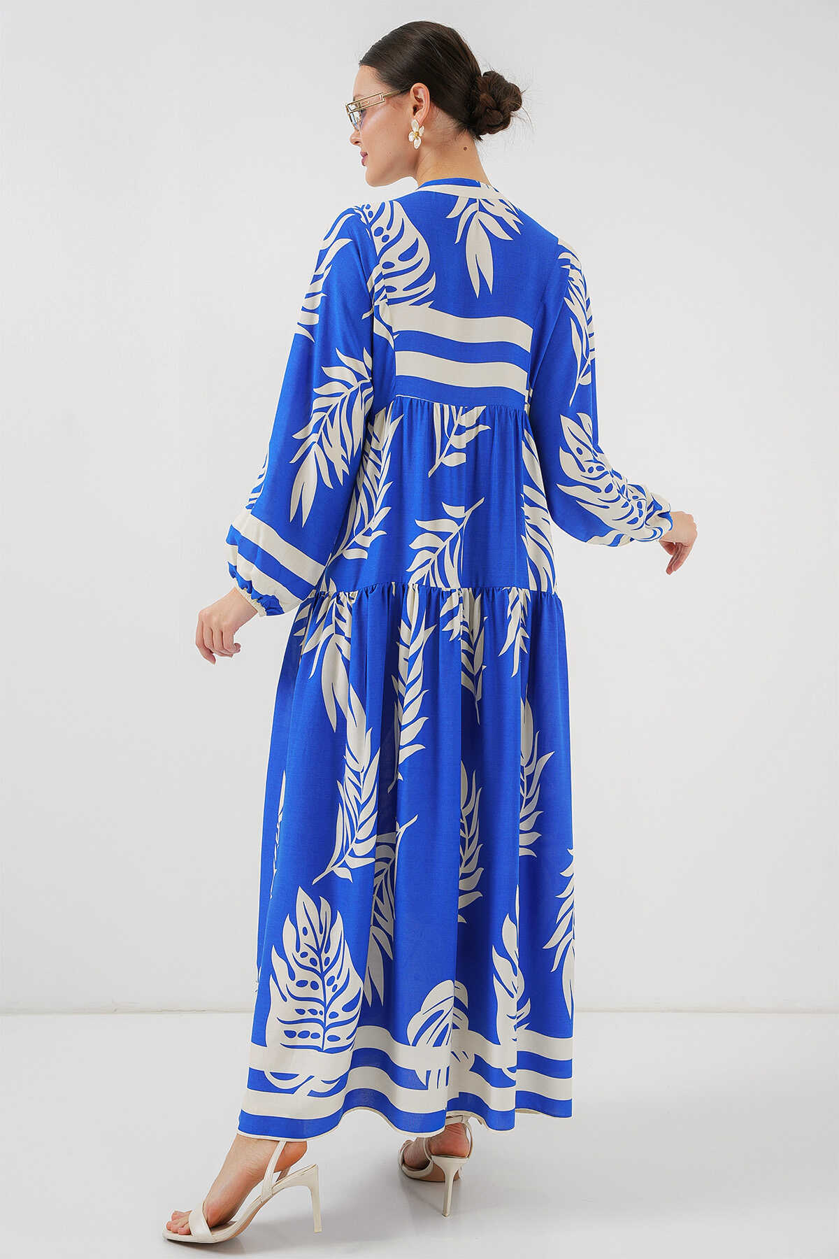 2423 Otantik Desenli Tesettür Elbise - Saks 3