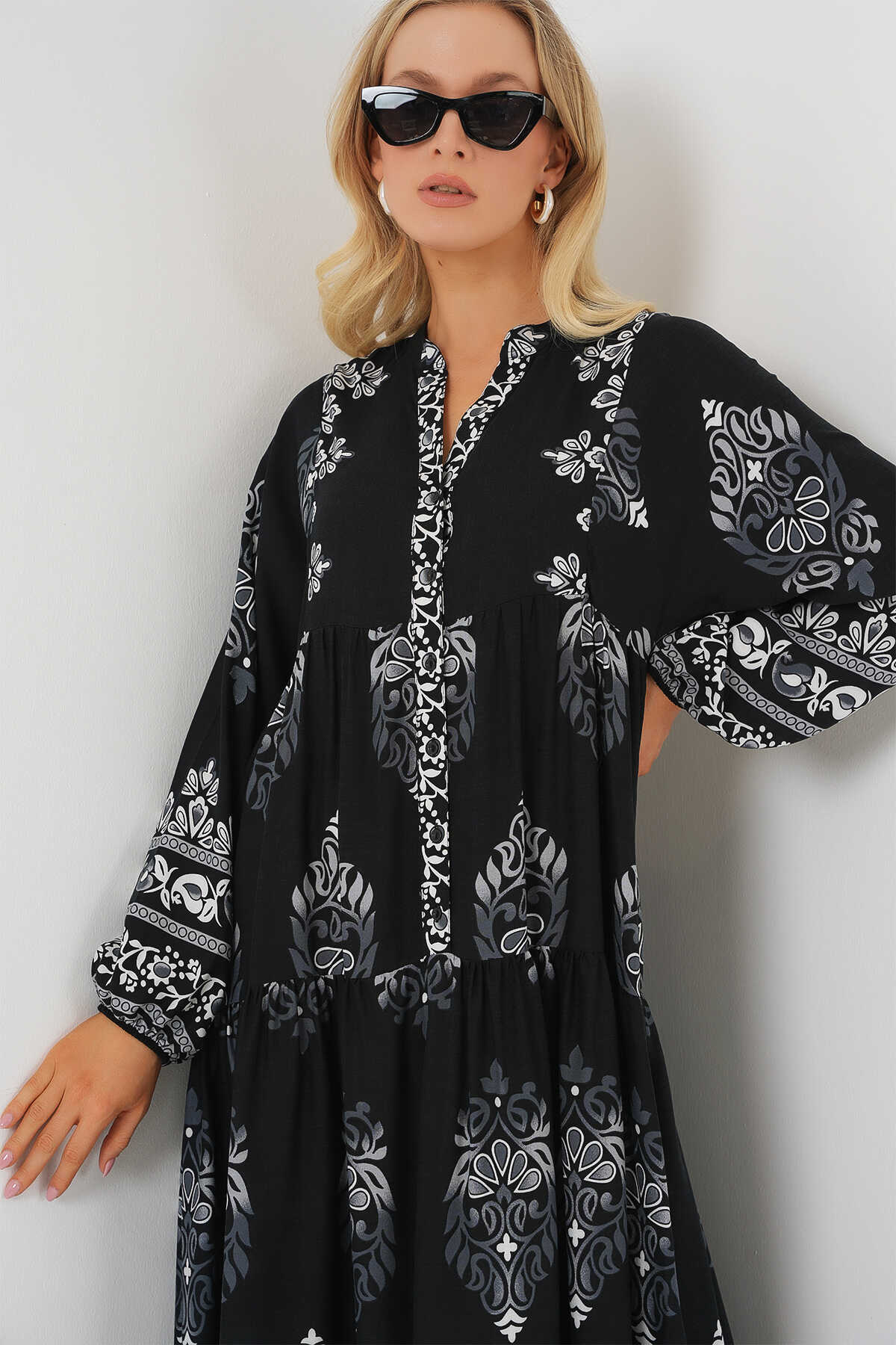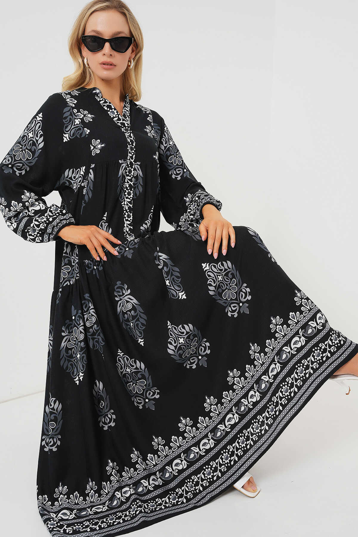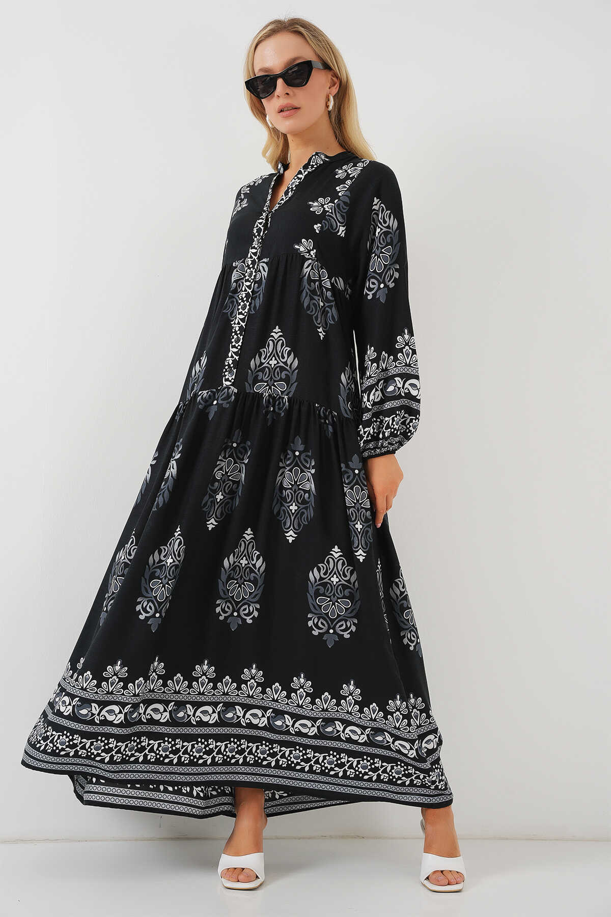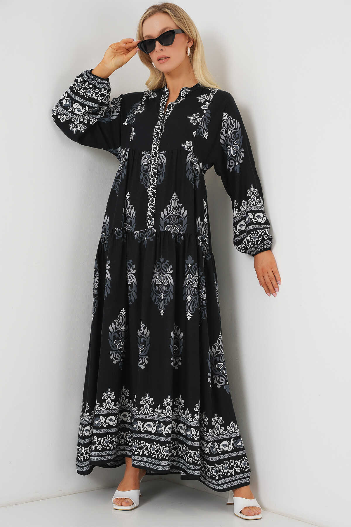 2423 Otantik Desenli Tesettür Elbise - Siyah 11 - Kombin