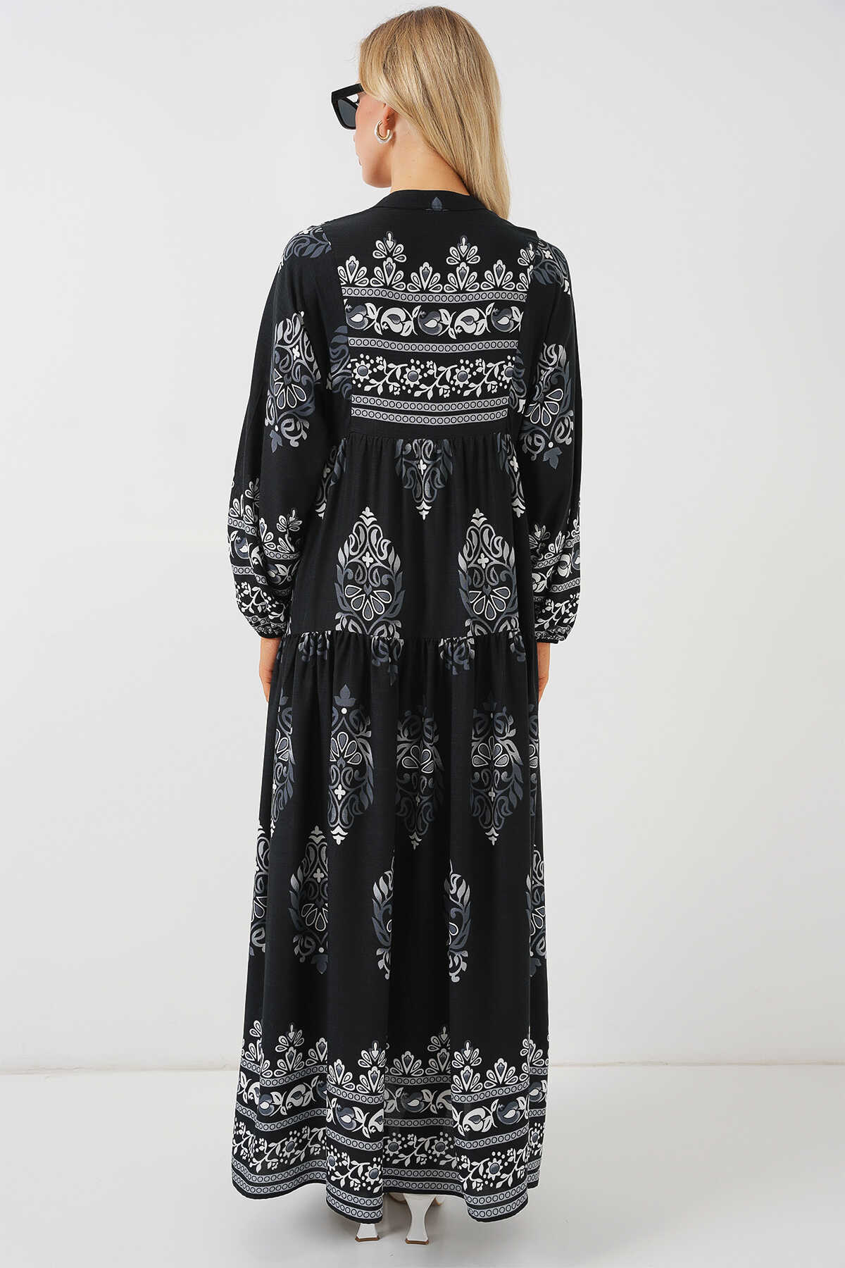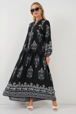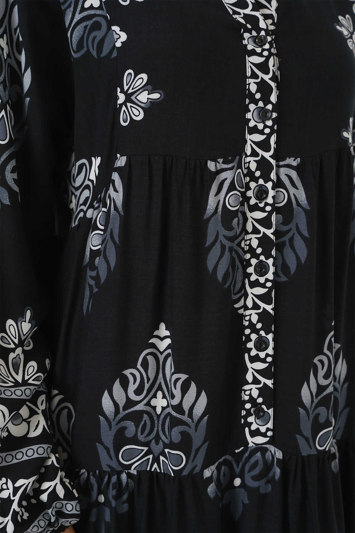 2423 Otantik Desenli Tesettür Elbise - Siyah 11