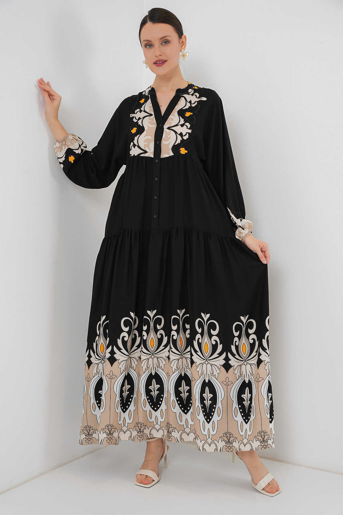 2423 Otantik Desenli Tesettür Elbise - Siyah 6 - Kombin