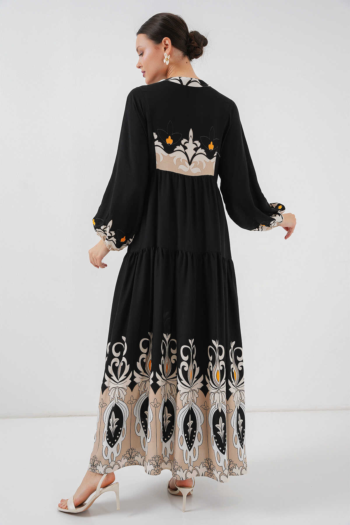 2423 Otantik Desenli Tesettür Elbise - Siyah 6