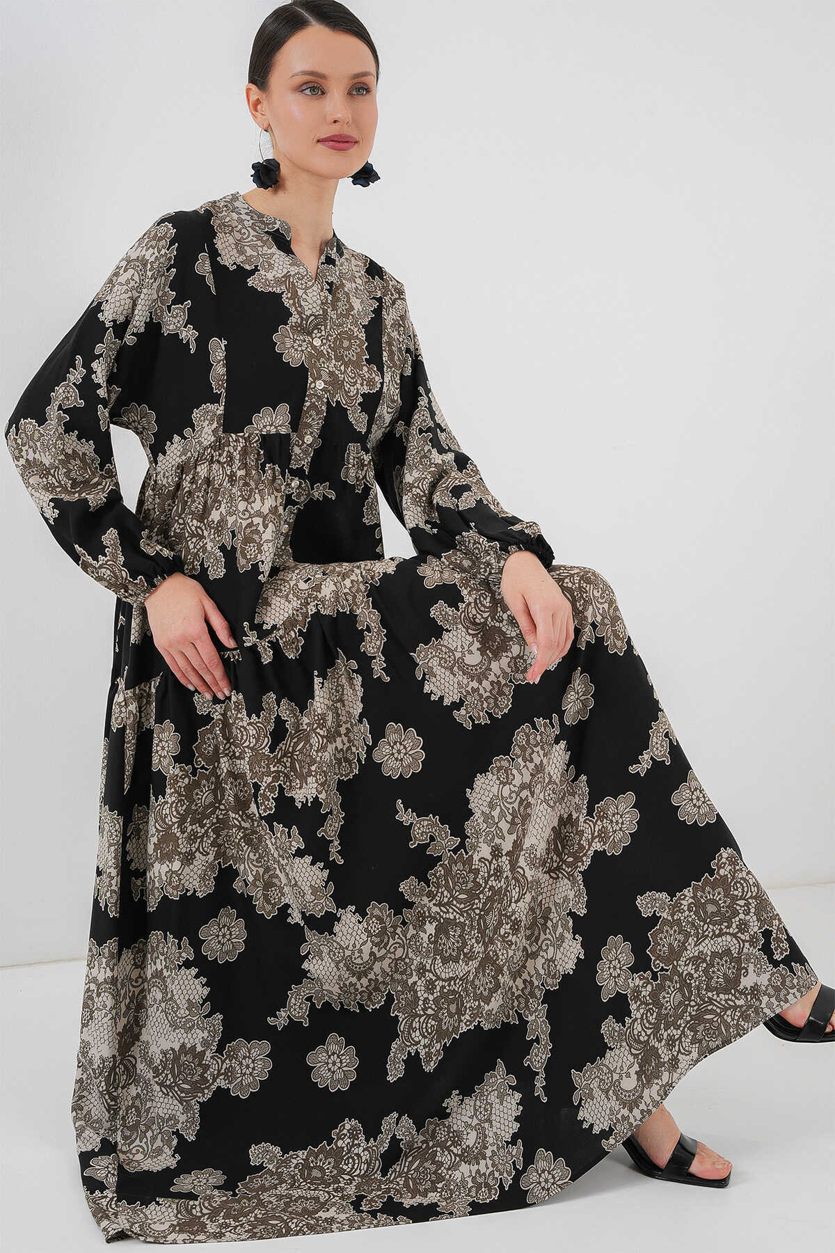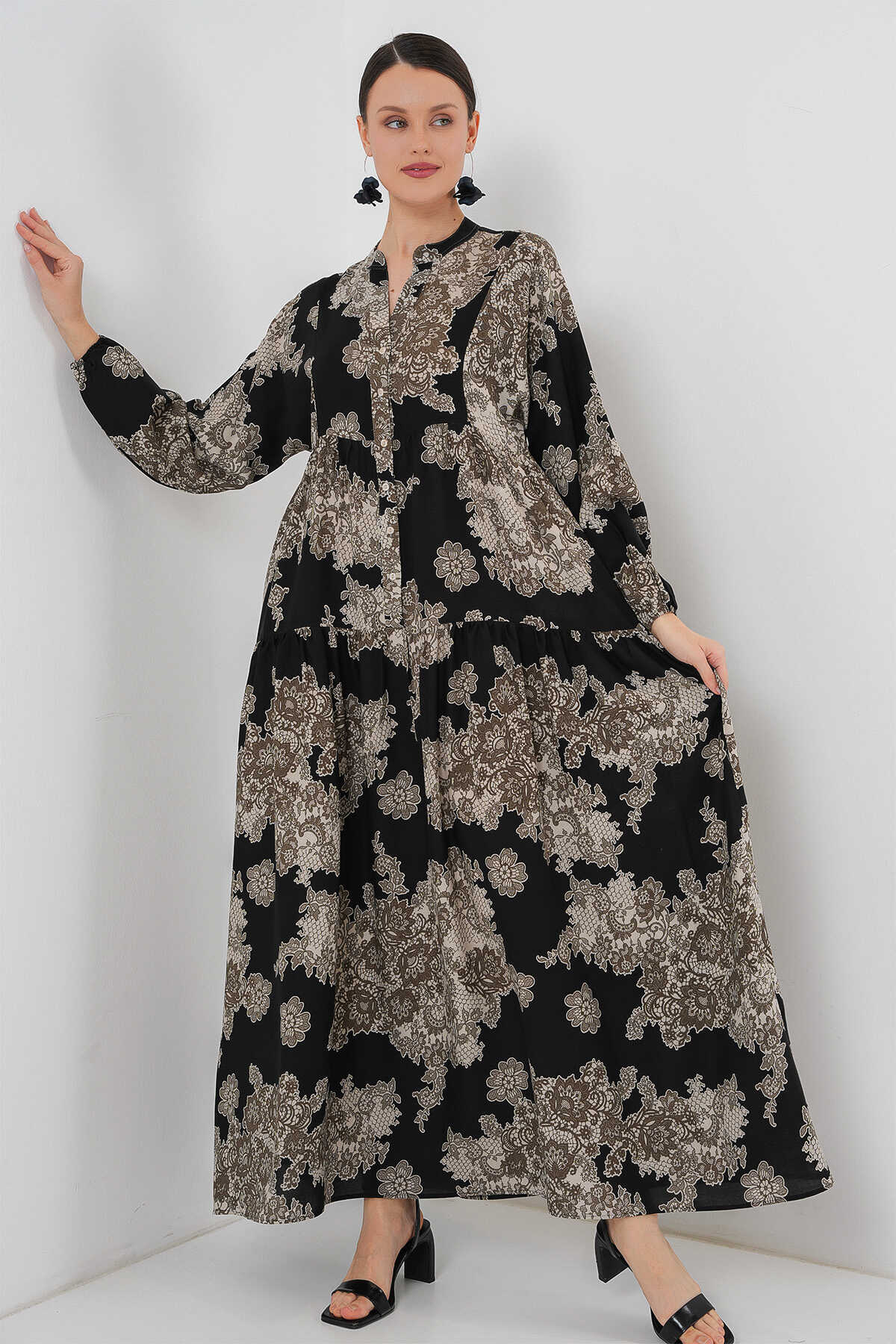2423 Otantik Desenli Tesettür Elbise - Siyah 7 - Kombin