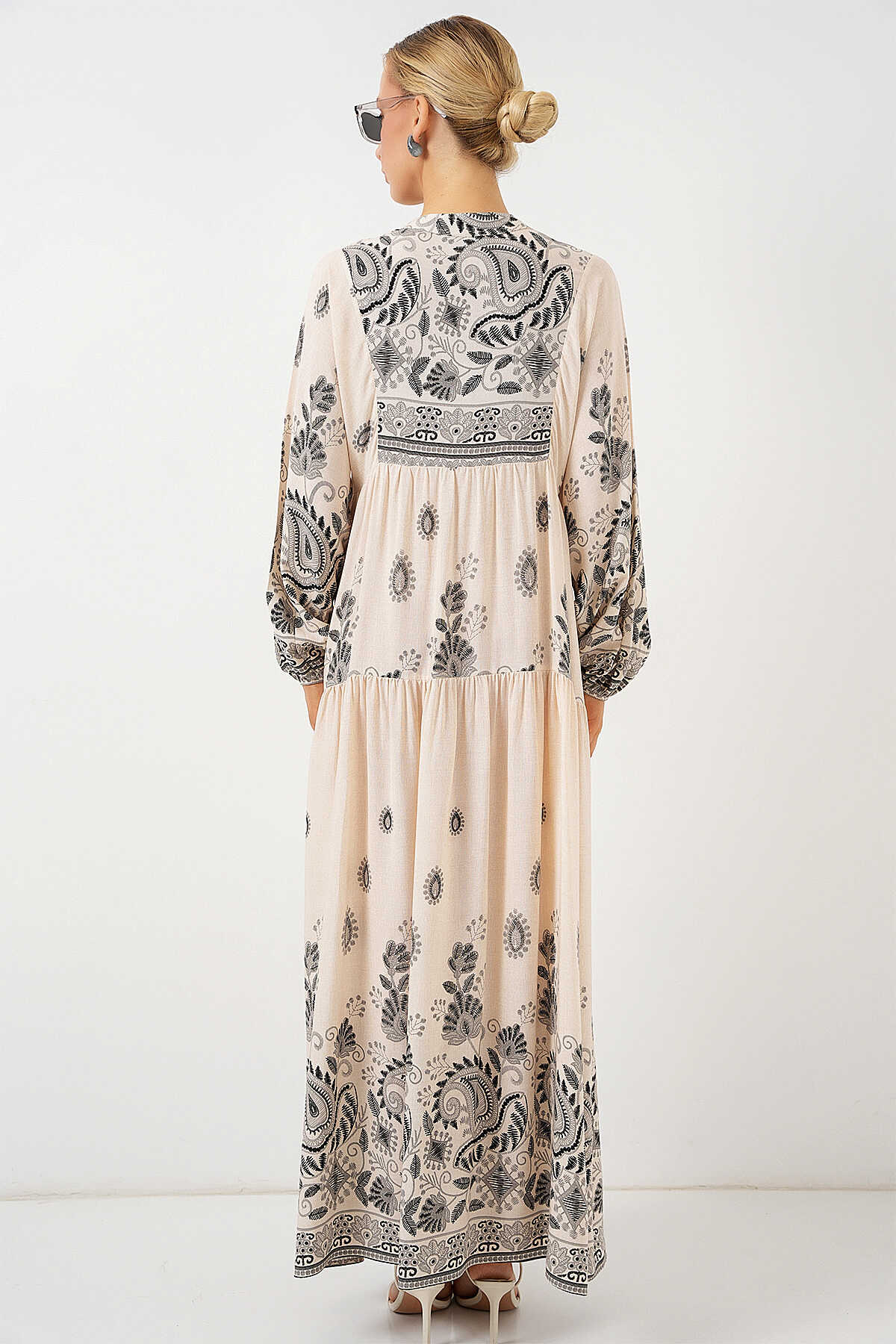 2423 Otantik Desenli Tesettür Elbise - Siyah - Krem