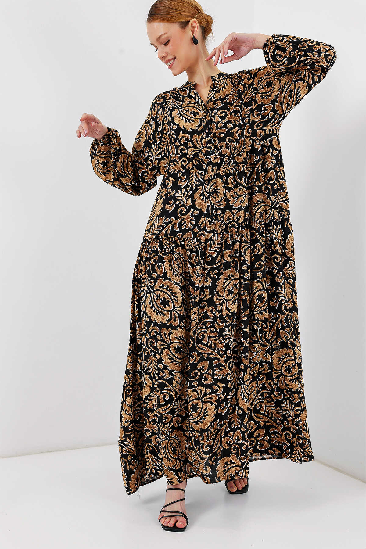 2423 Otantik Desenli Tesettür Elbise - Siyah10 - Kombin