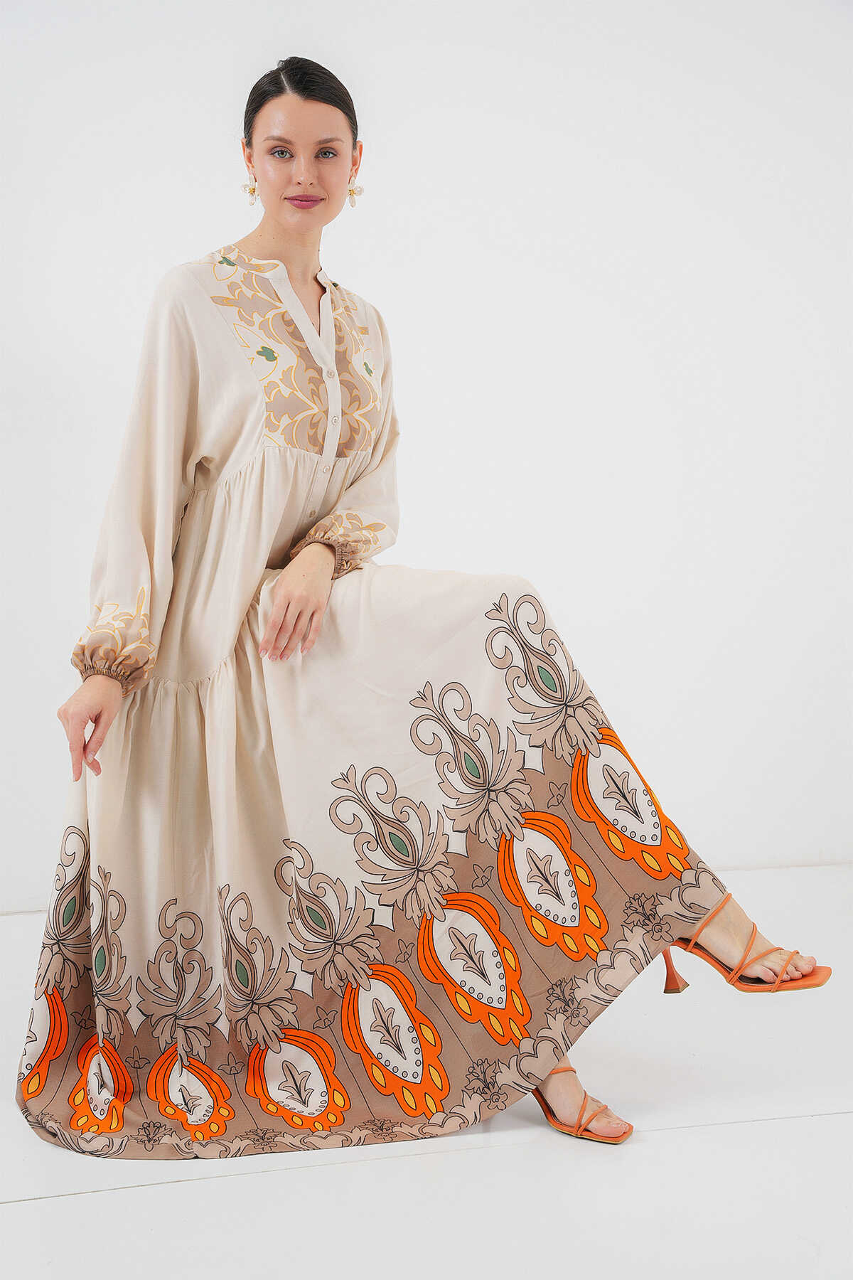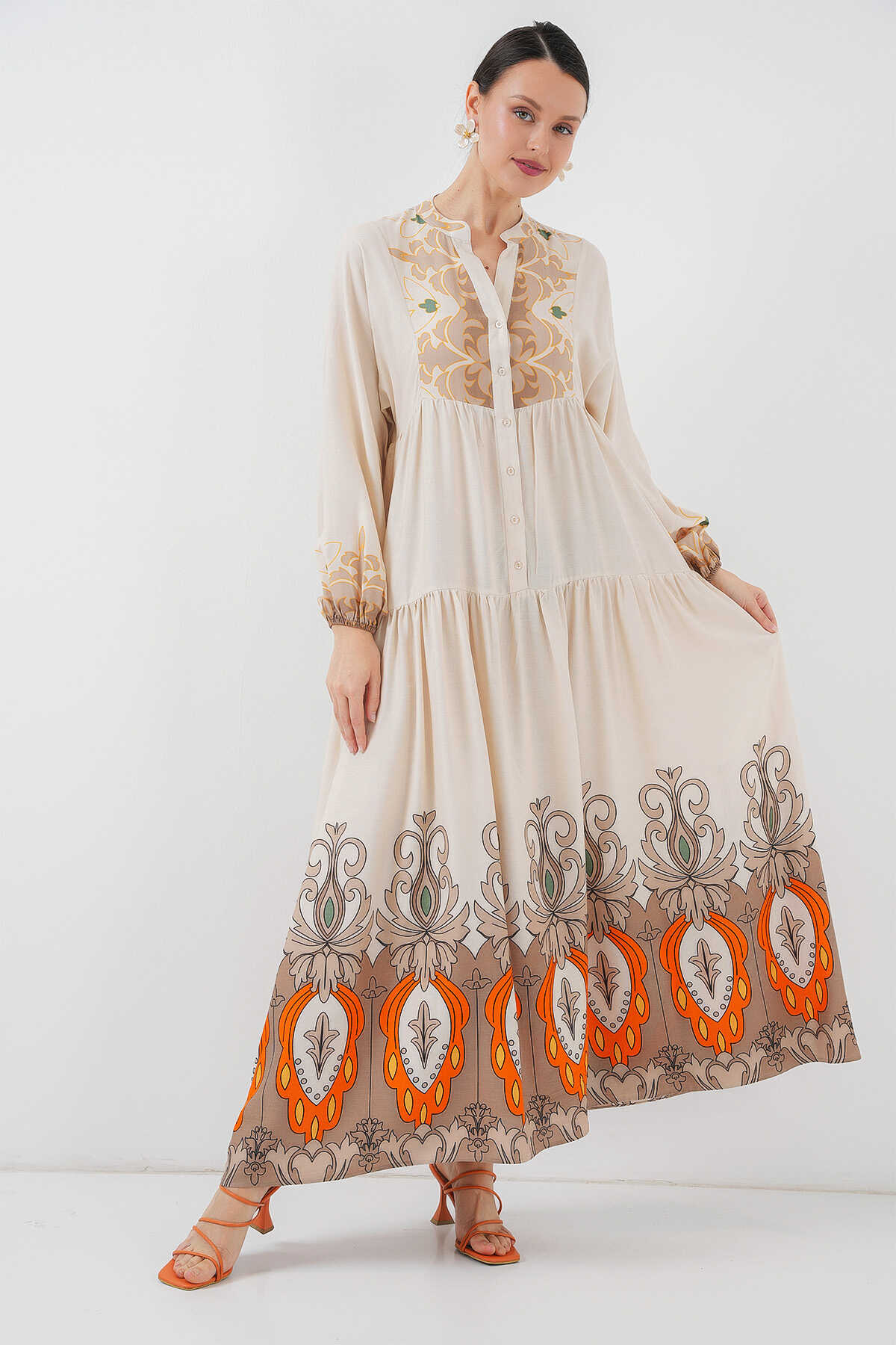 2423 Otantik Desenli Tesettür Elbise - T. Ekru