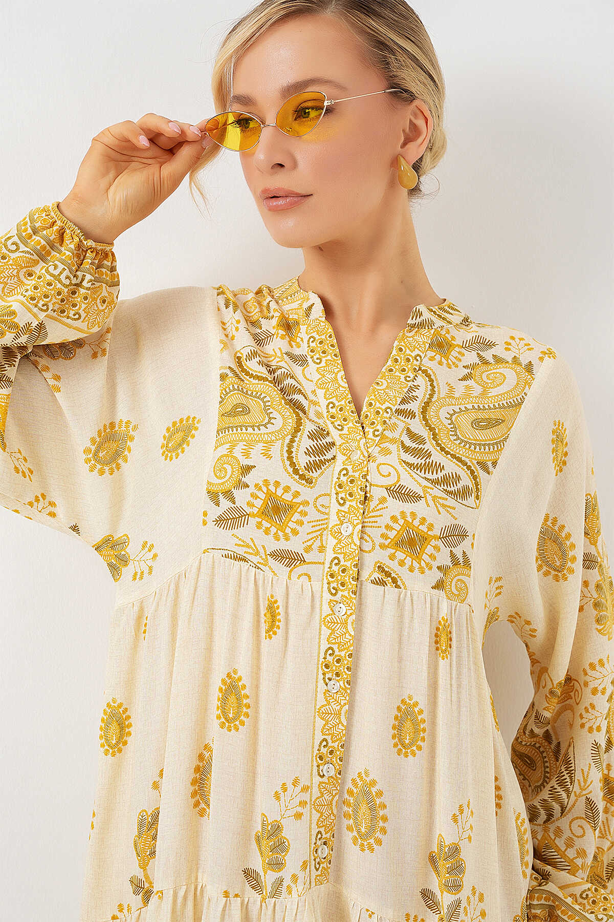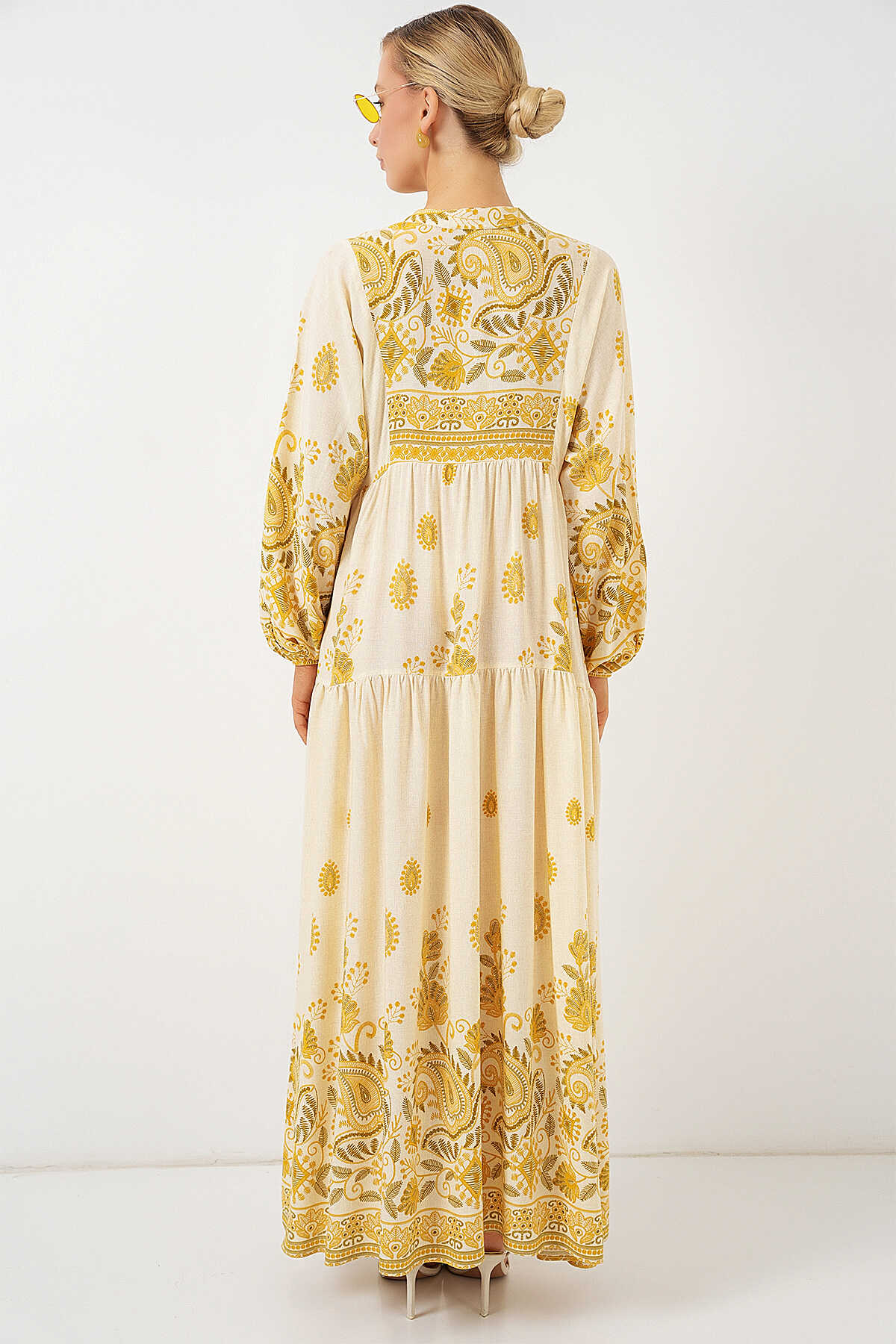 2423 Otantik Desenli Tesettür Elbise - Y.Sarı - Kombin