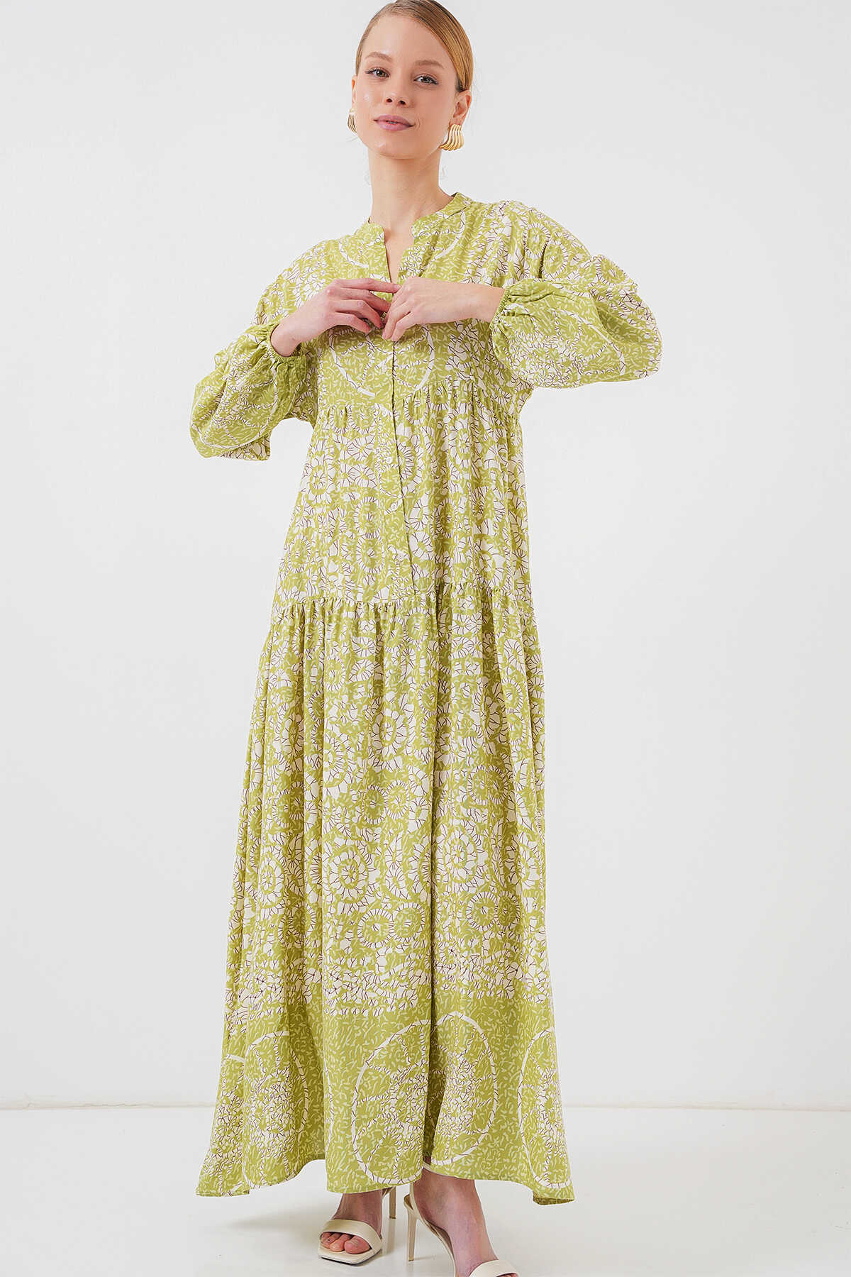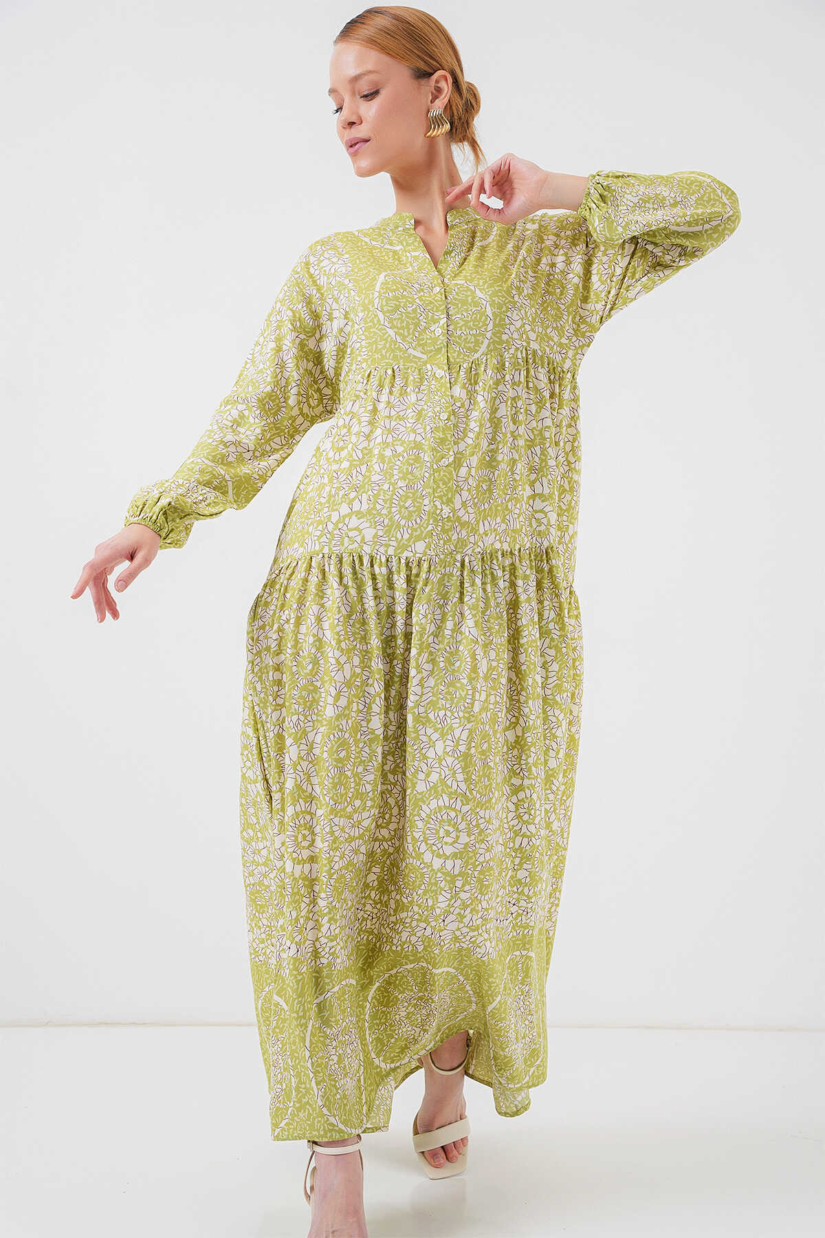 2423 Otantik Desenli Tesettür Elbise - Yeşil 8 - Kombin
