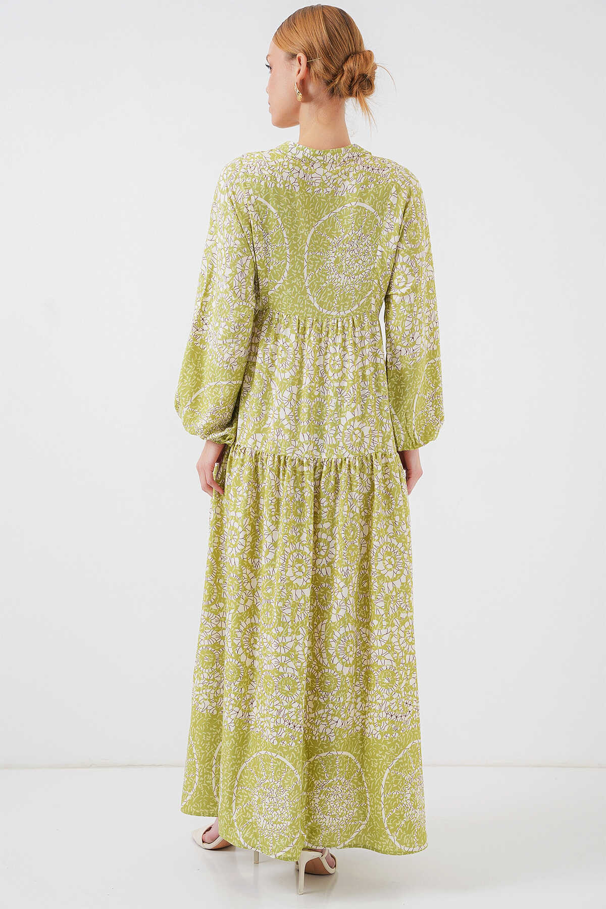 2423 Otantik Desenli Tesettür Elbise - Yeşil 8