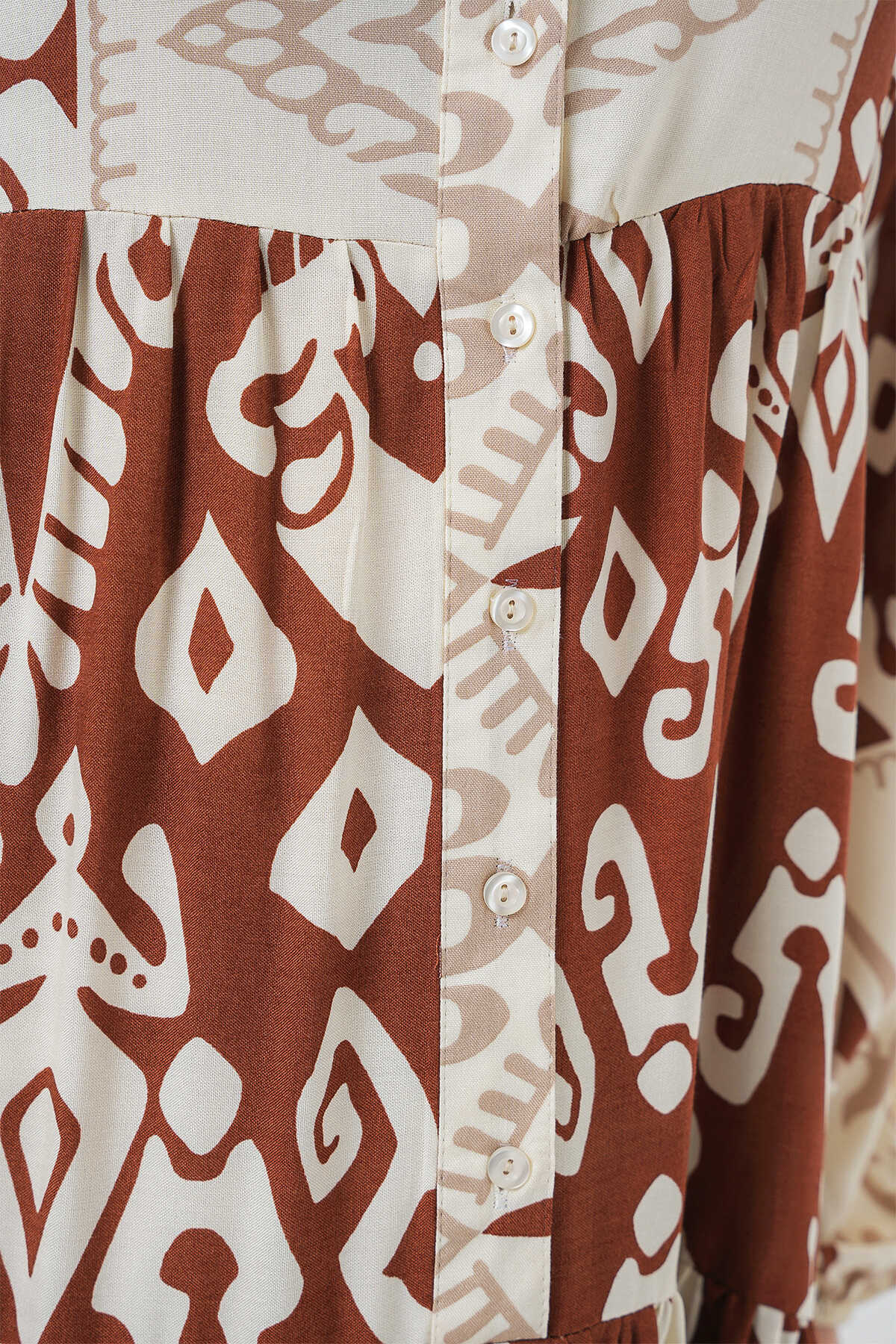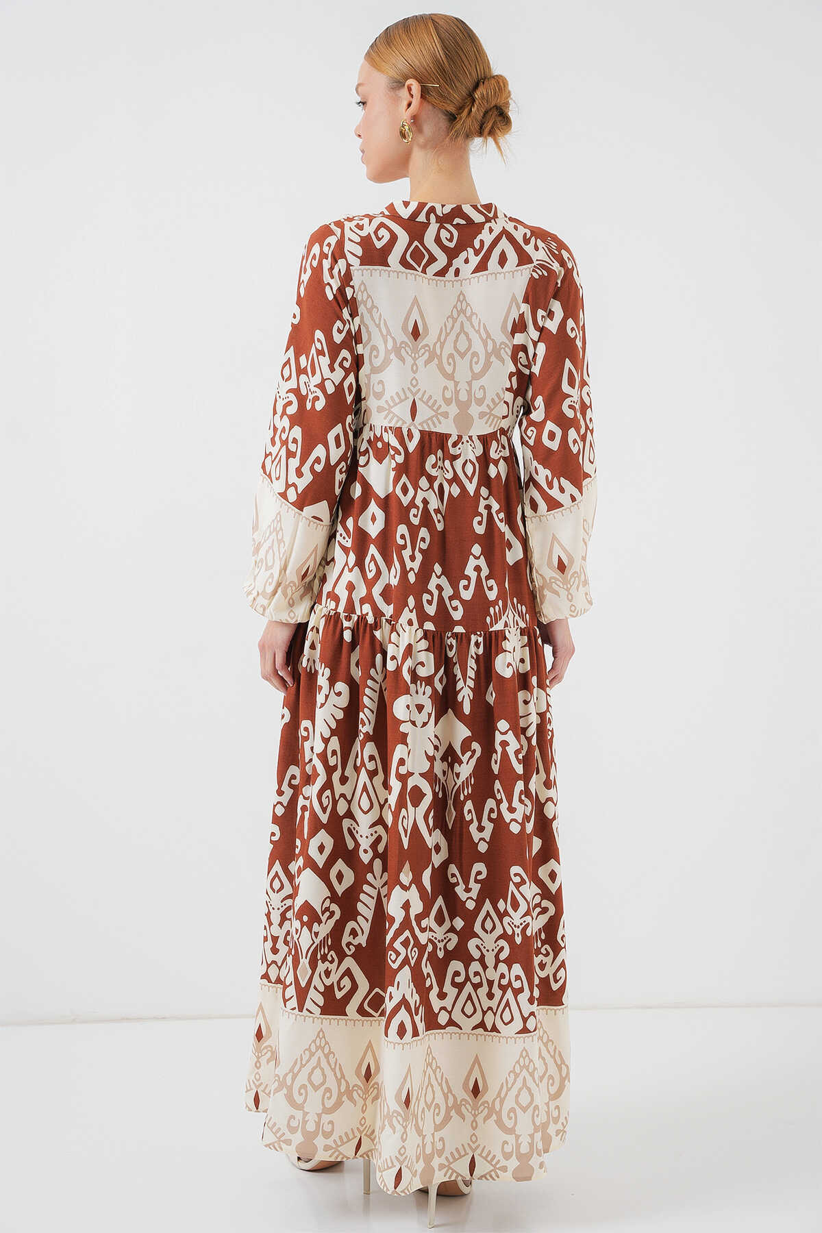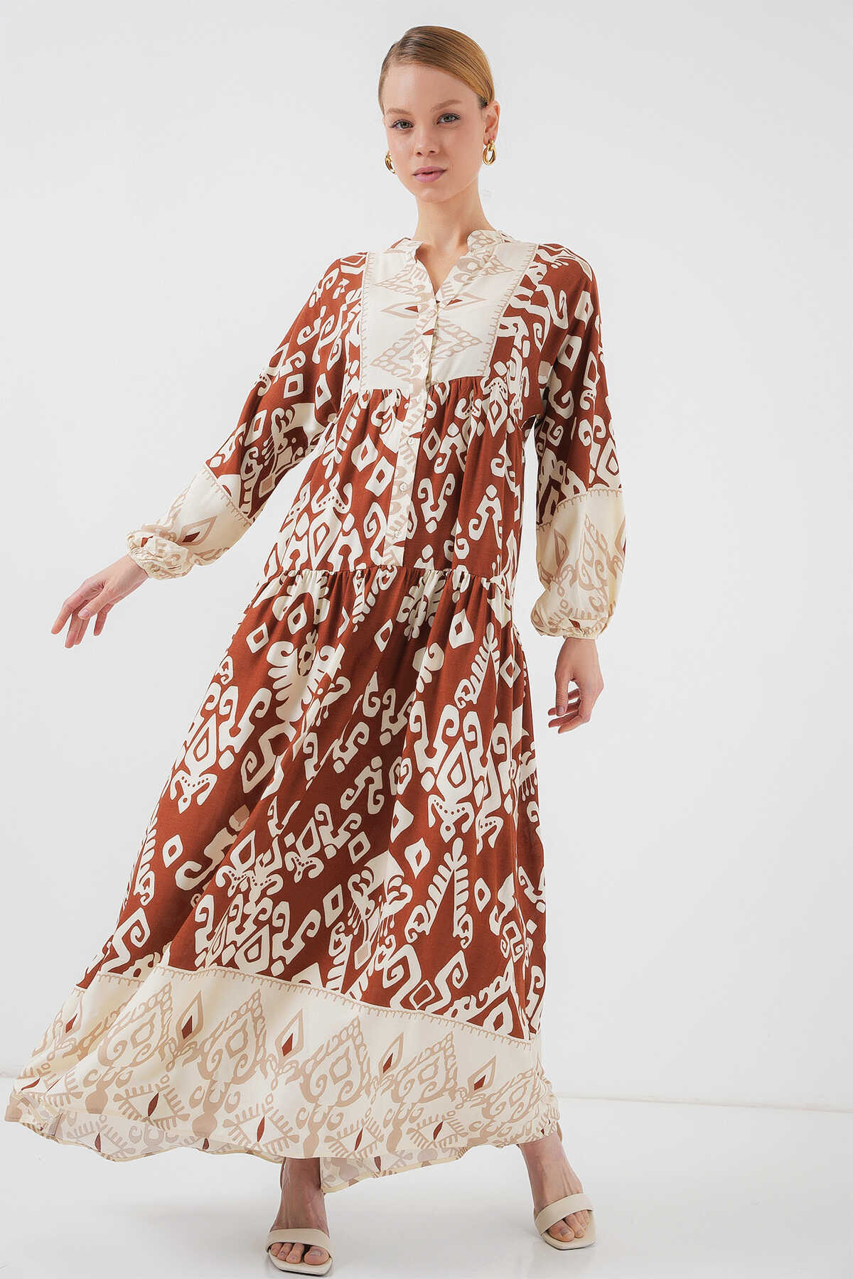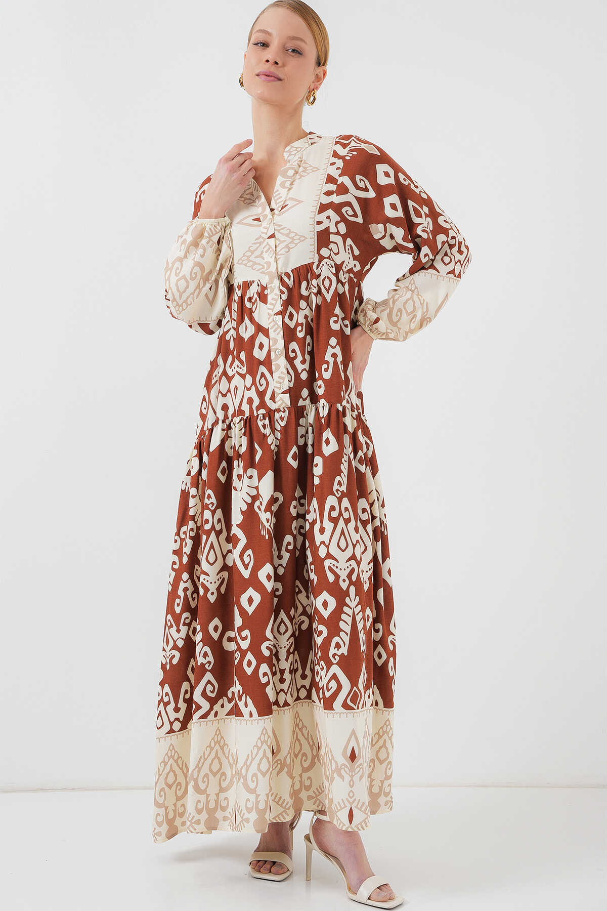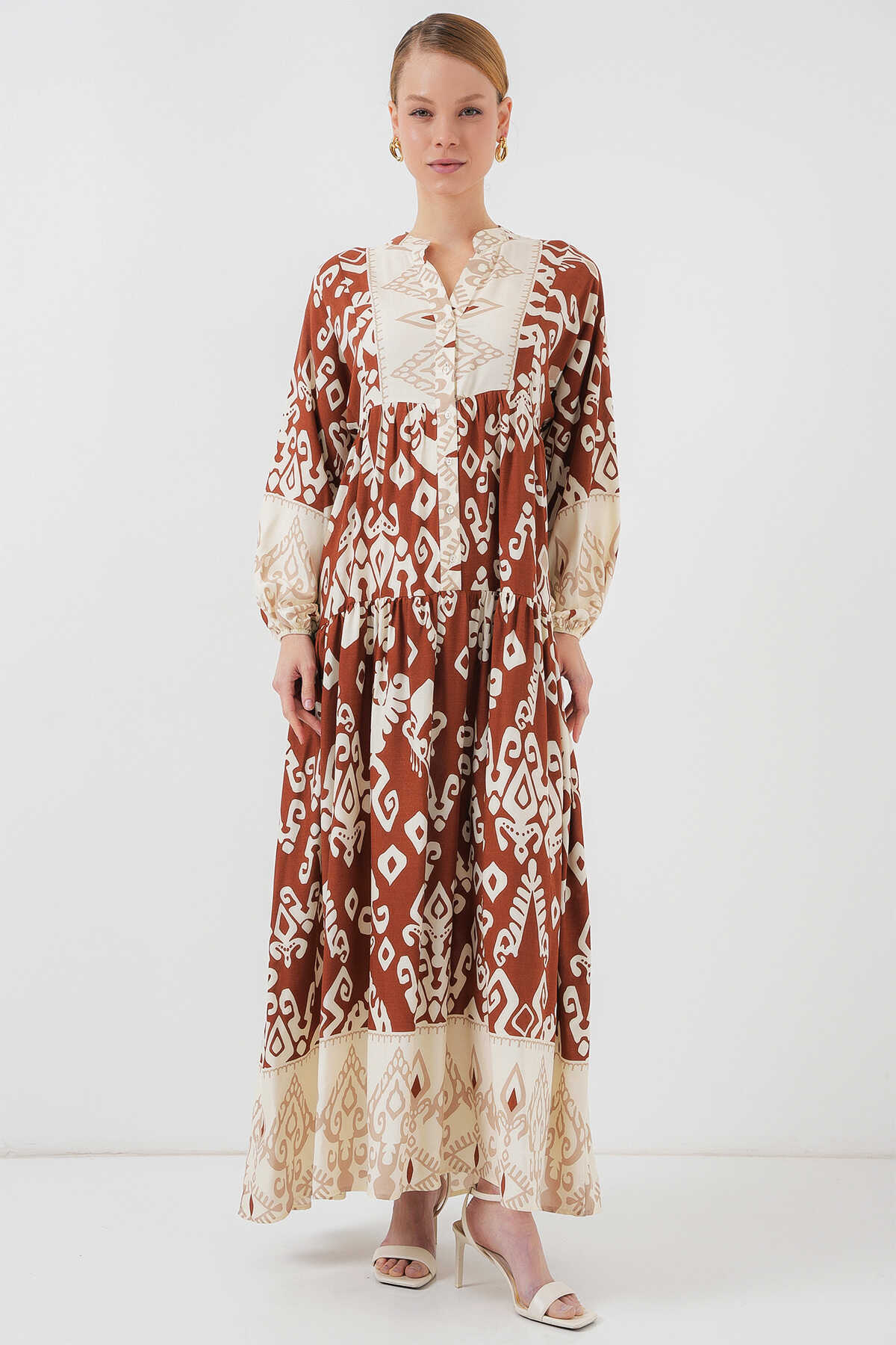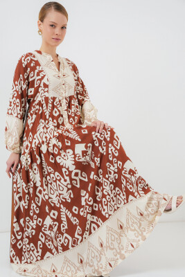 2423 Otantik Desenli Tesettür Elbise - Y.Kiremit