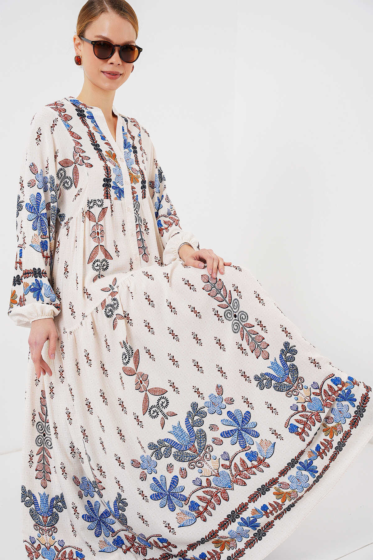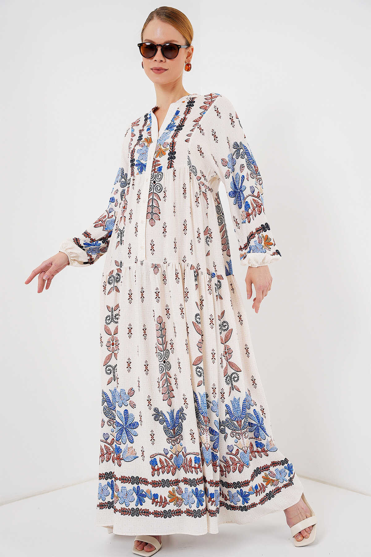 2423 Otantik Desenli Tesettür Elbise - Z. Mavi