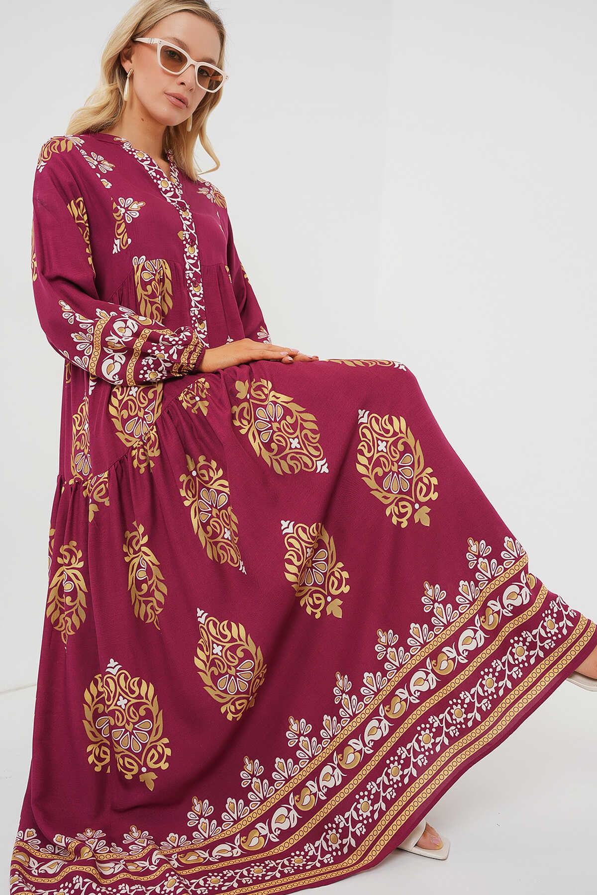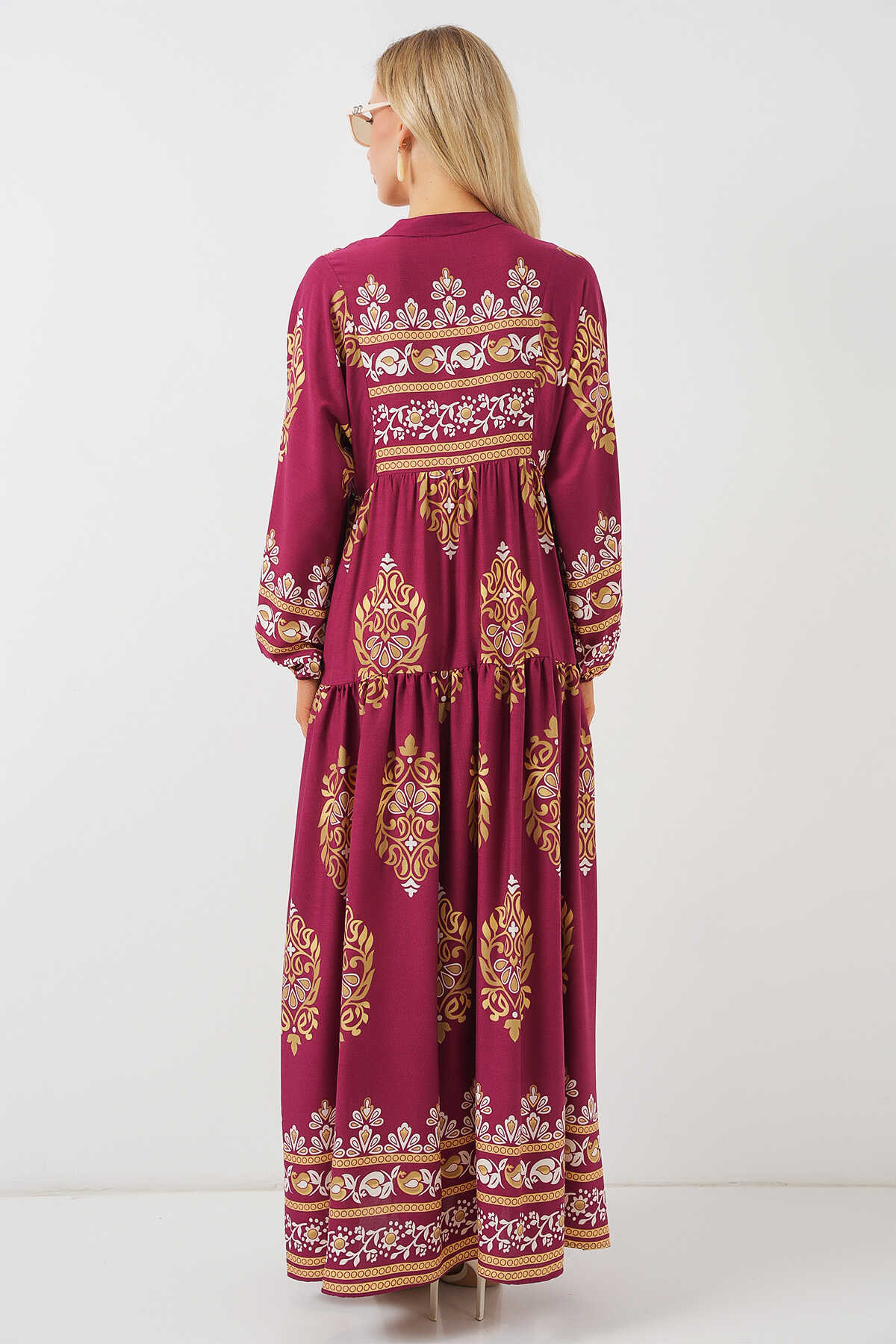 2423 Otantik Desenli Tesettür Elbise - Z.Bordo