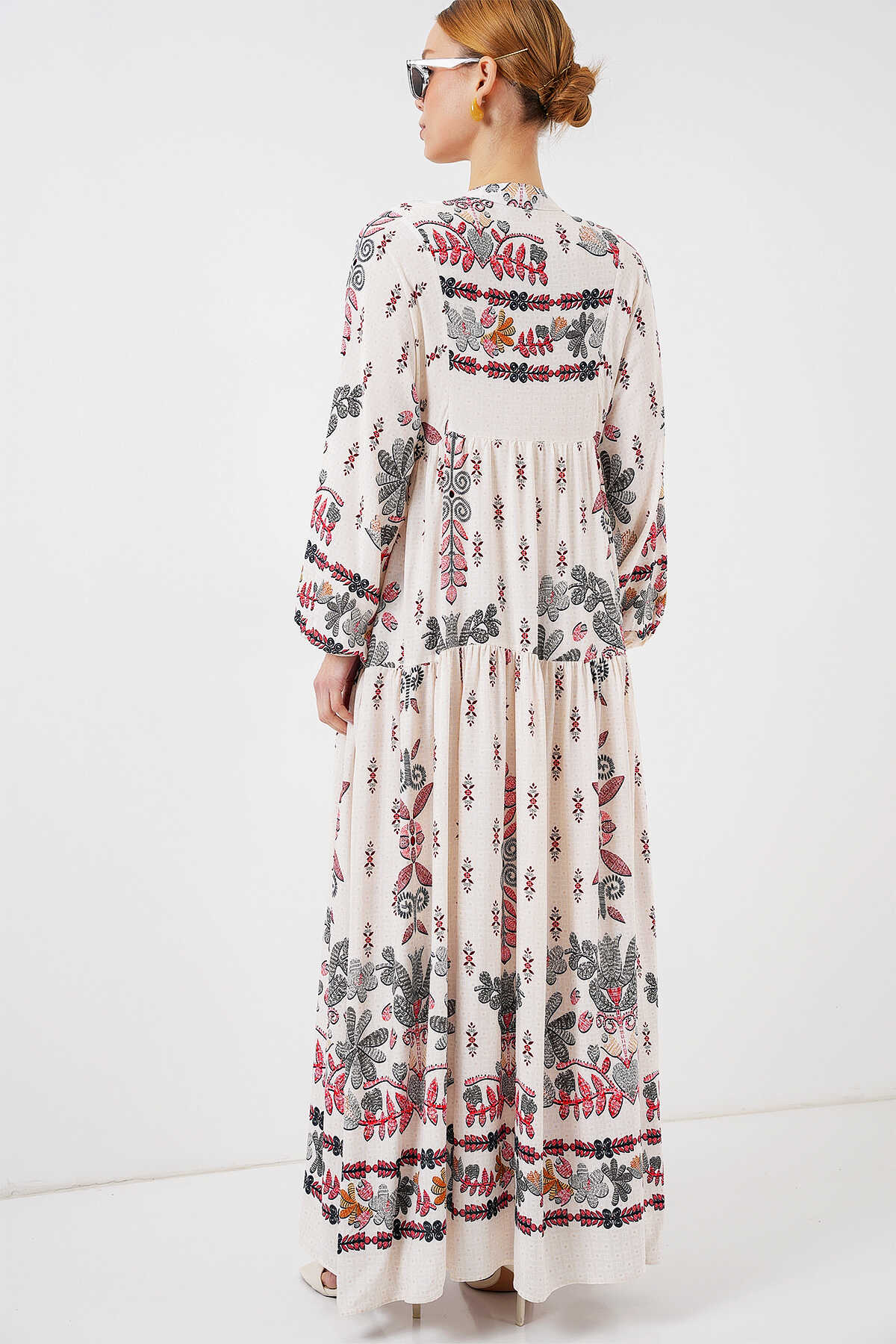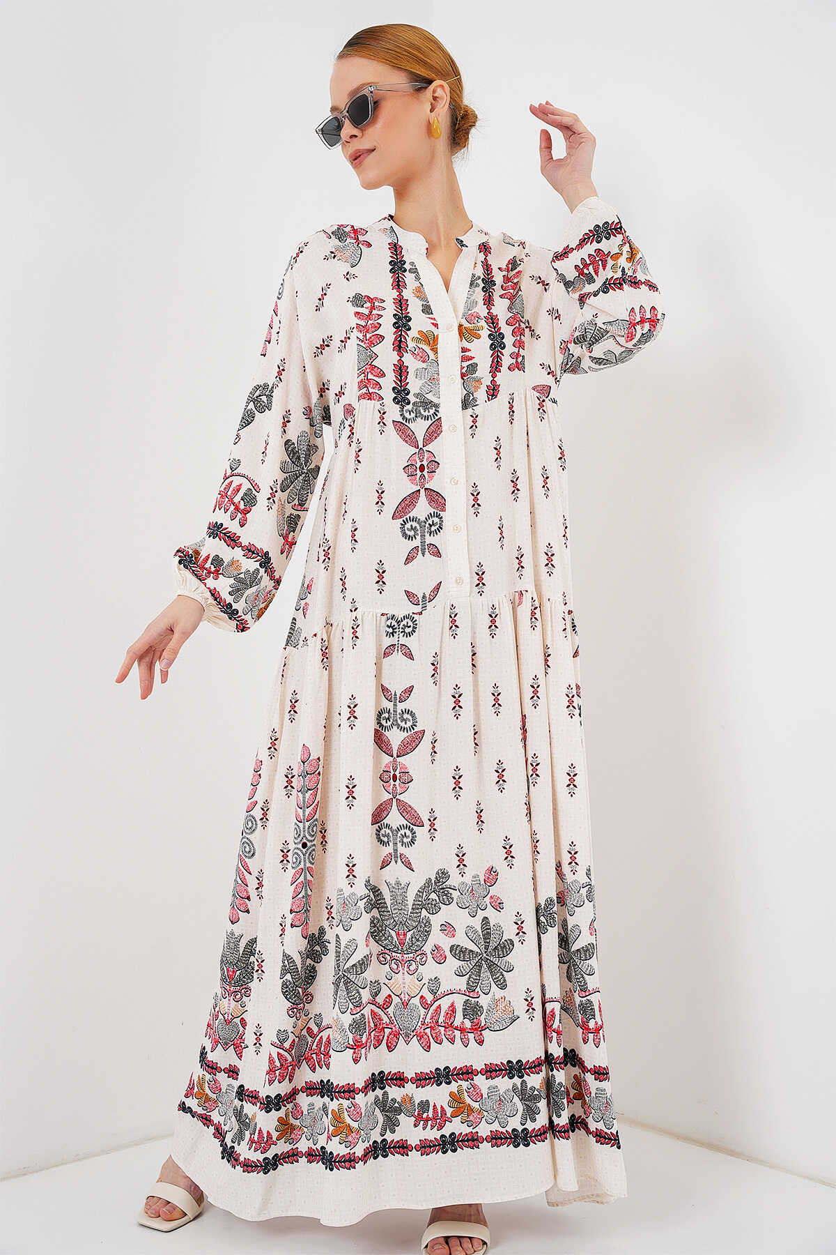 2423 Otantik Desenli Tesettür Elbise - Z. Kırmızı