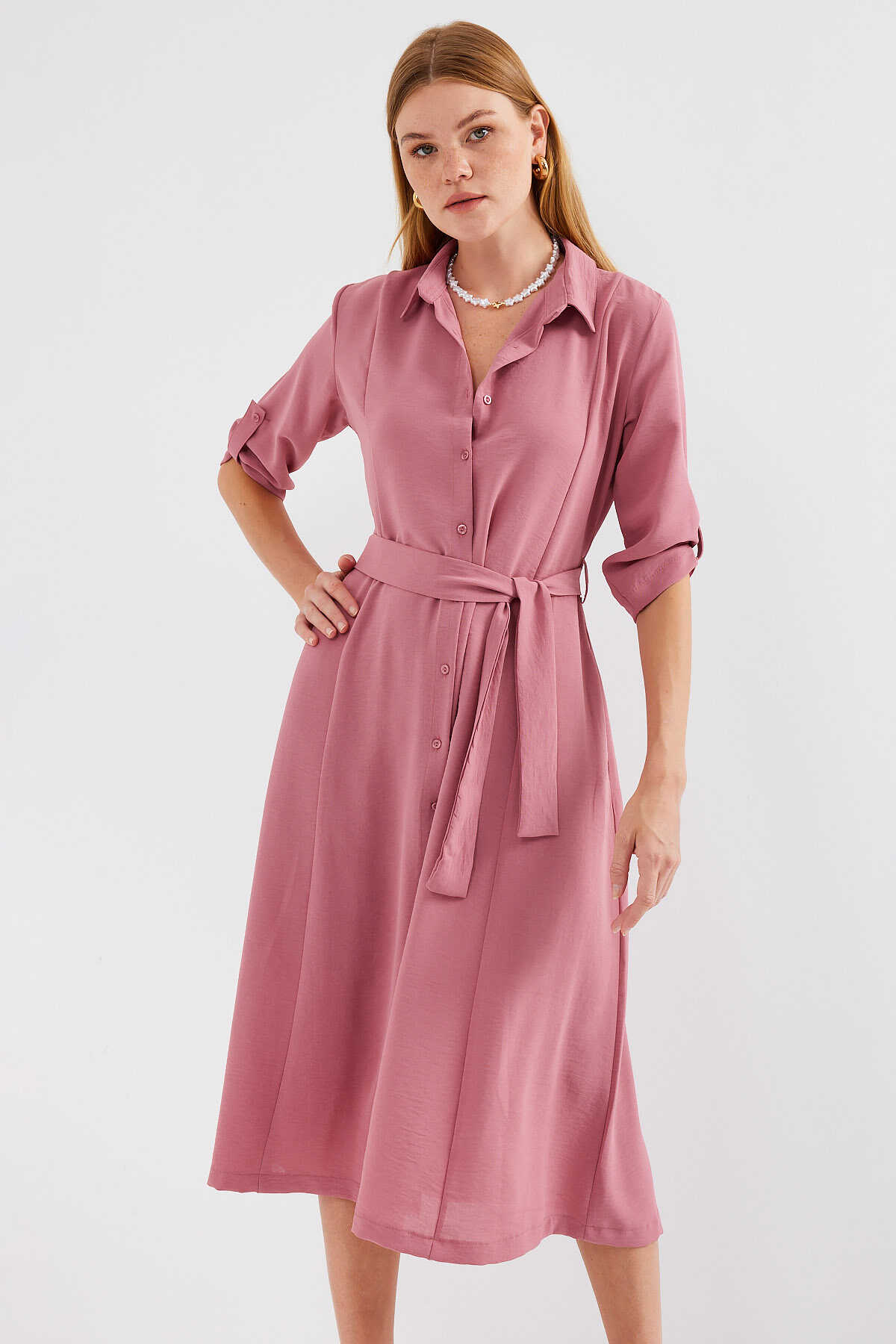 2442 Kuşaklı Gömlek Elbise - A.Gül Kurusu - Kombin