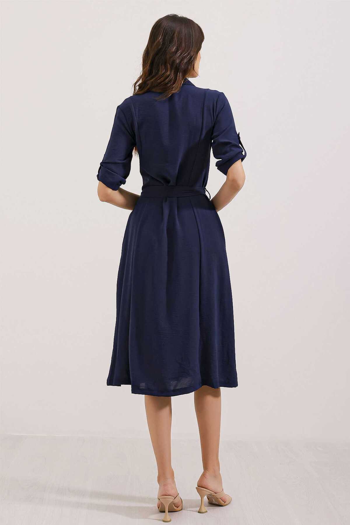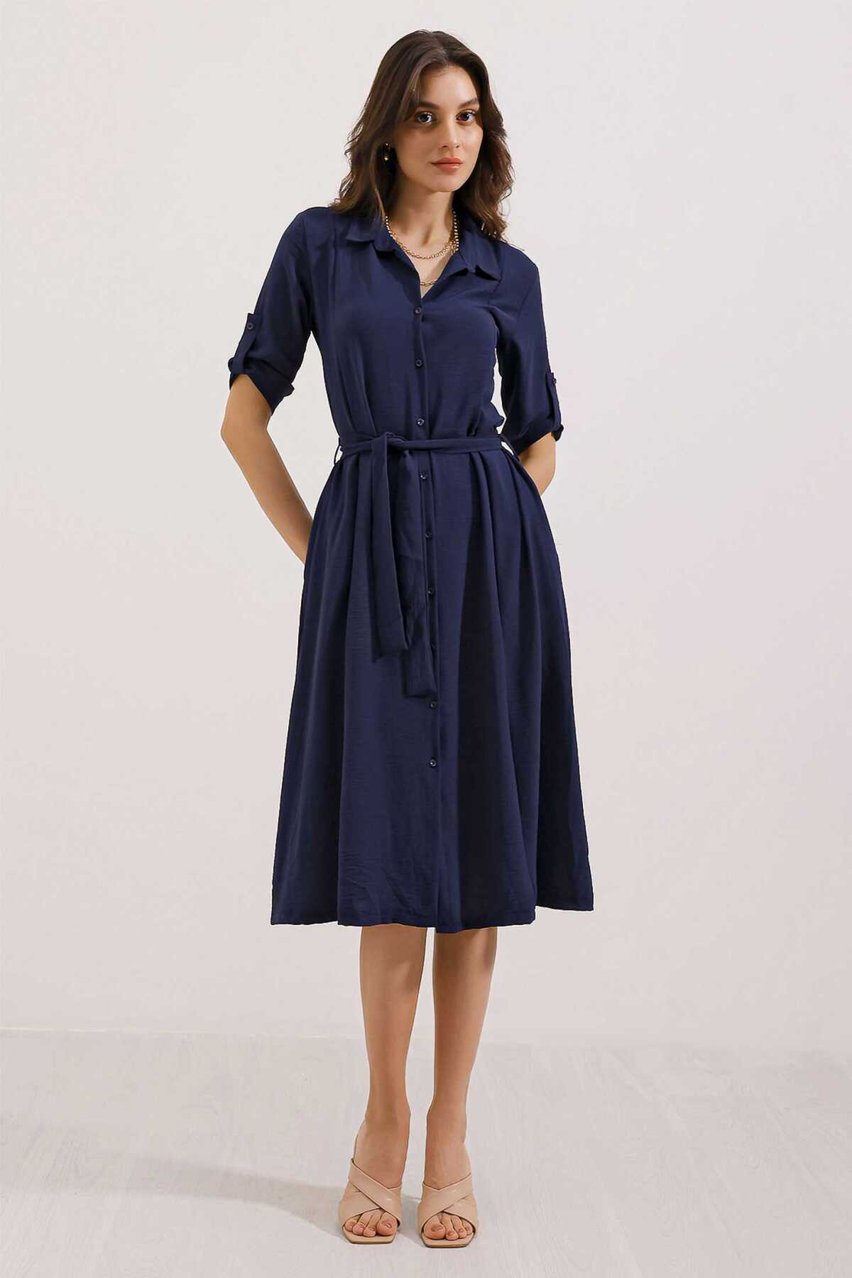 Kadın Lacivert Kuşaklı Gömlek Elbise 2442 - Kombin