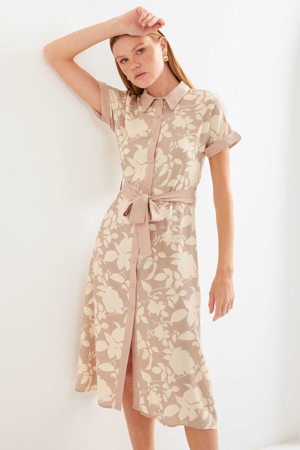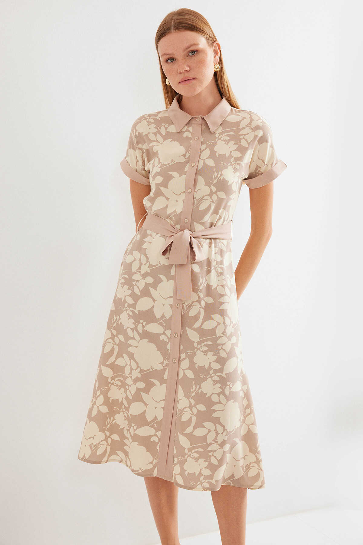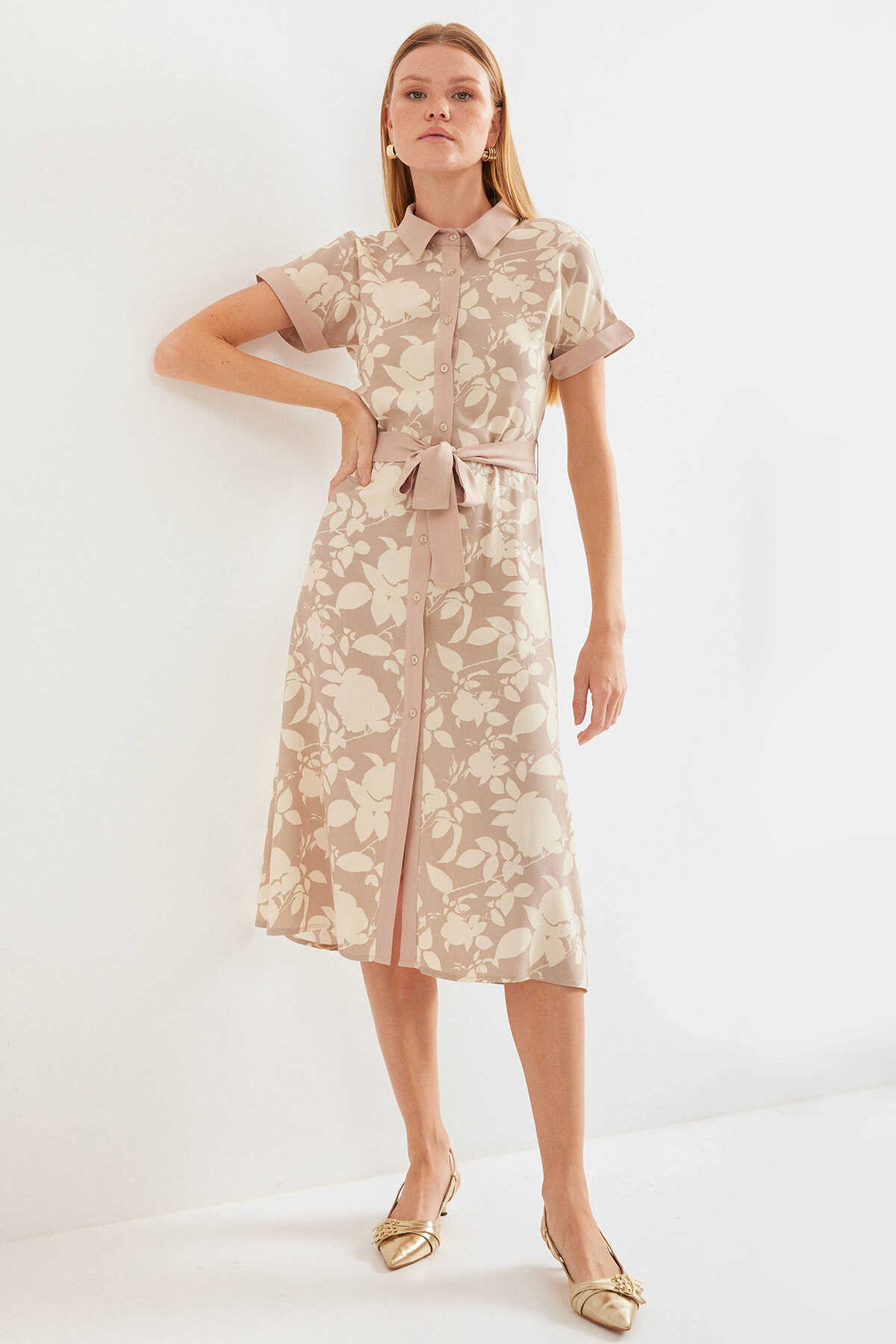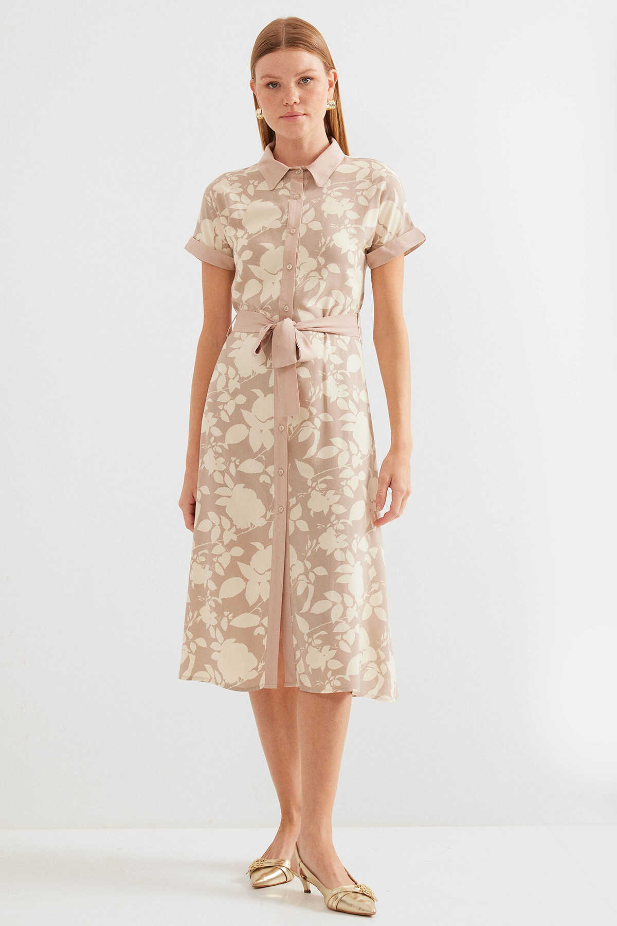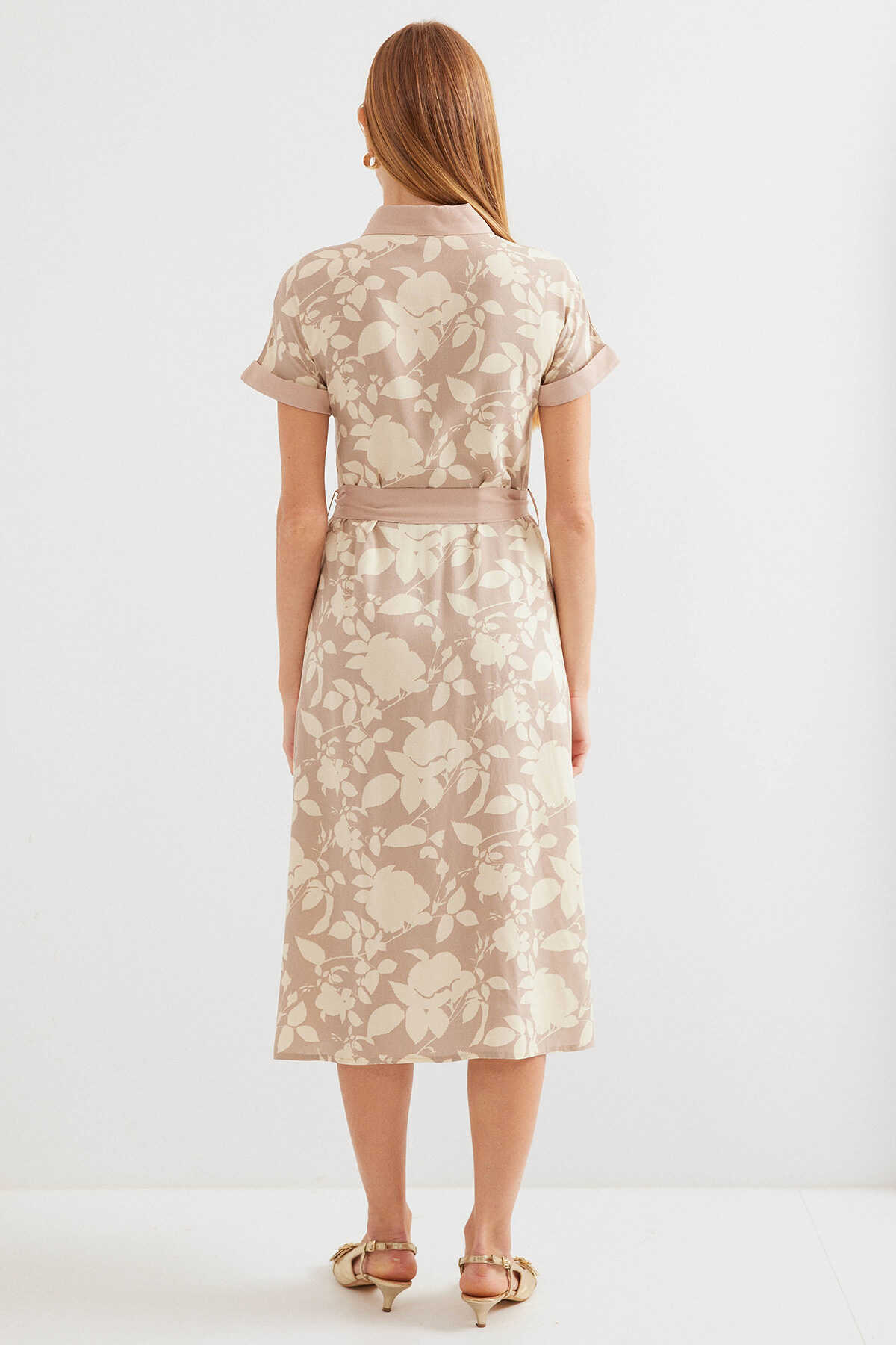 2455 Desenli Gömlek Elbise - Bej - Kombin