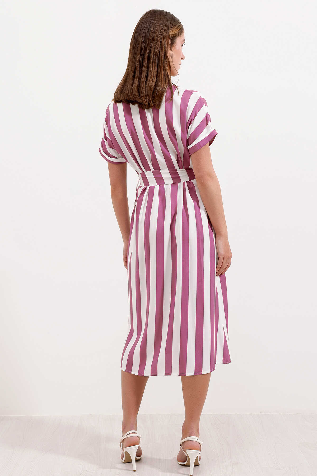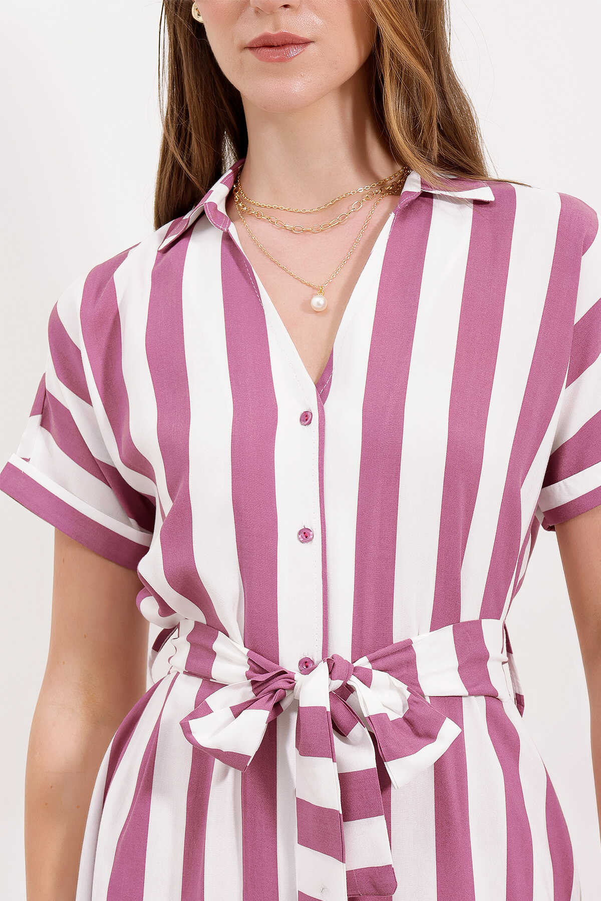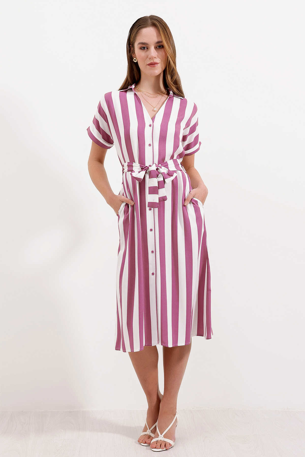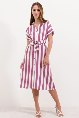 2456 Çizgili Gömlek Elbise - Gül Kurusu