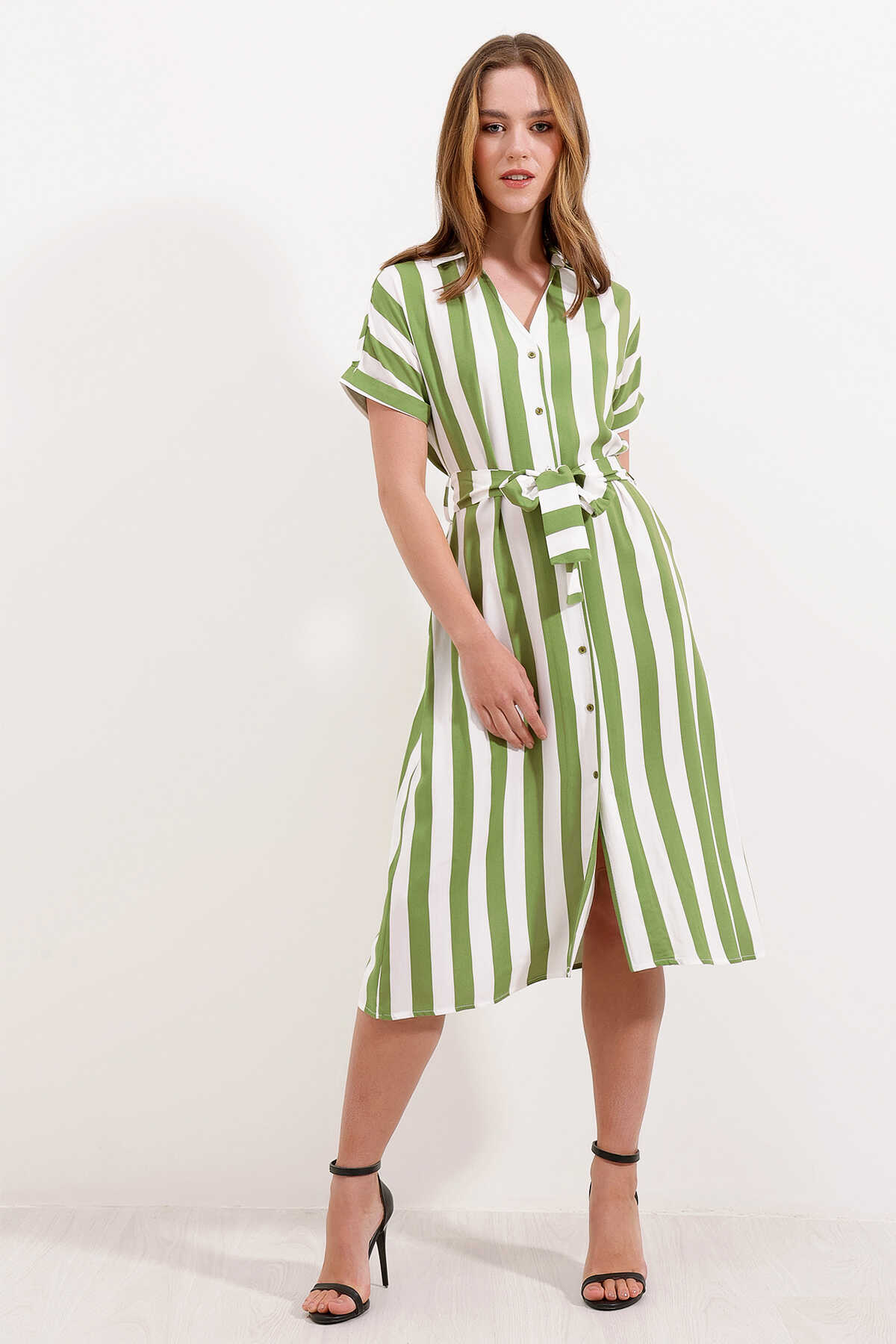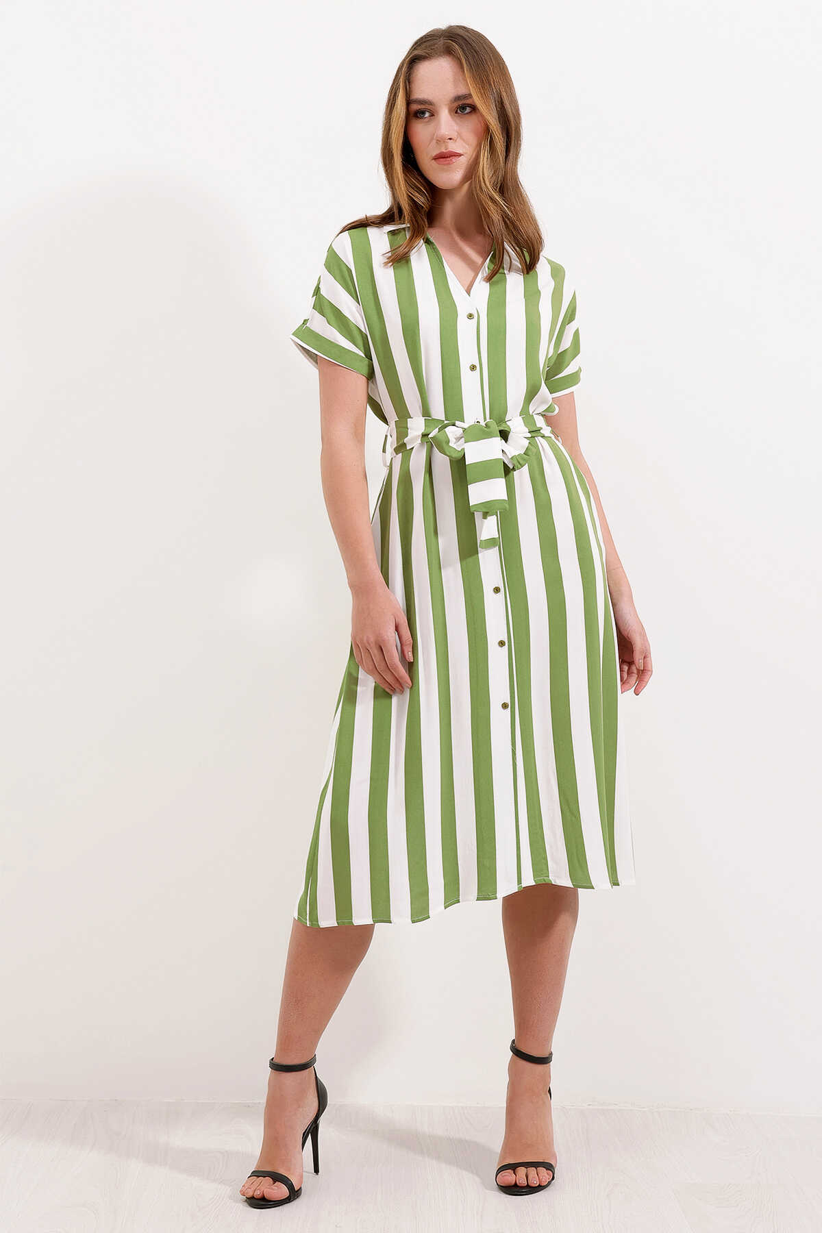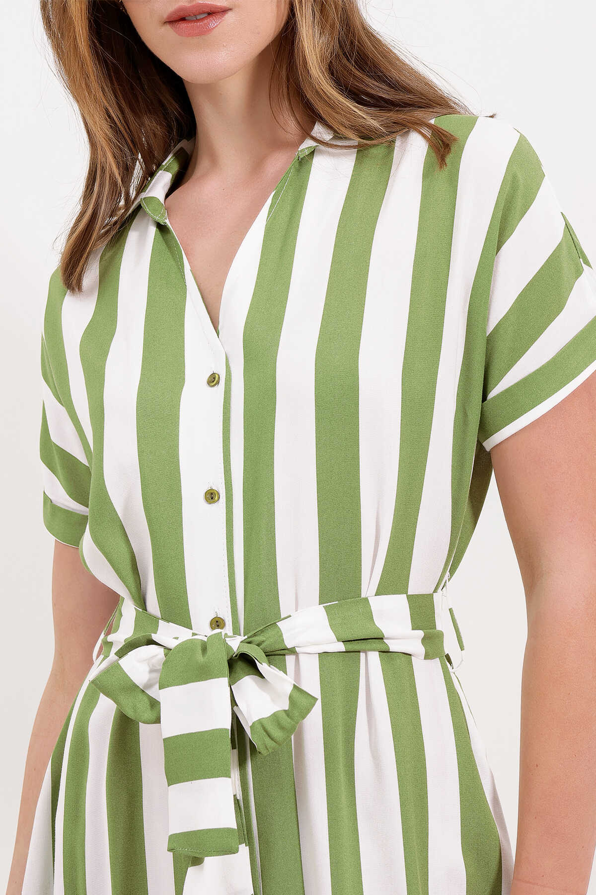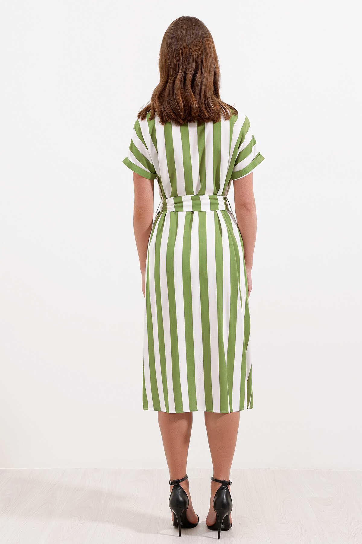 2456 Çizgili Gömlek Elbise - Yeşil - Kombin