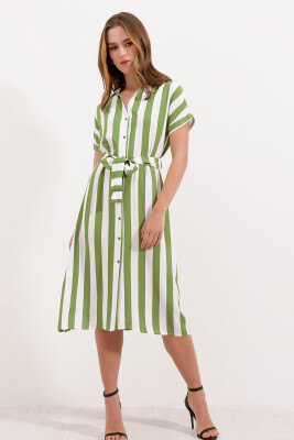 2456 Çizgili Gömlek Elbise - Yeşil