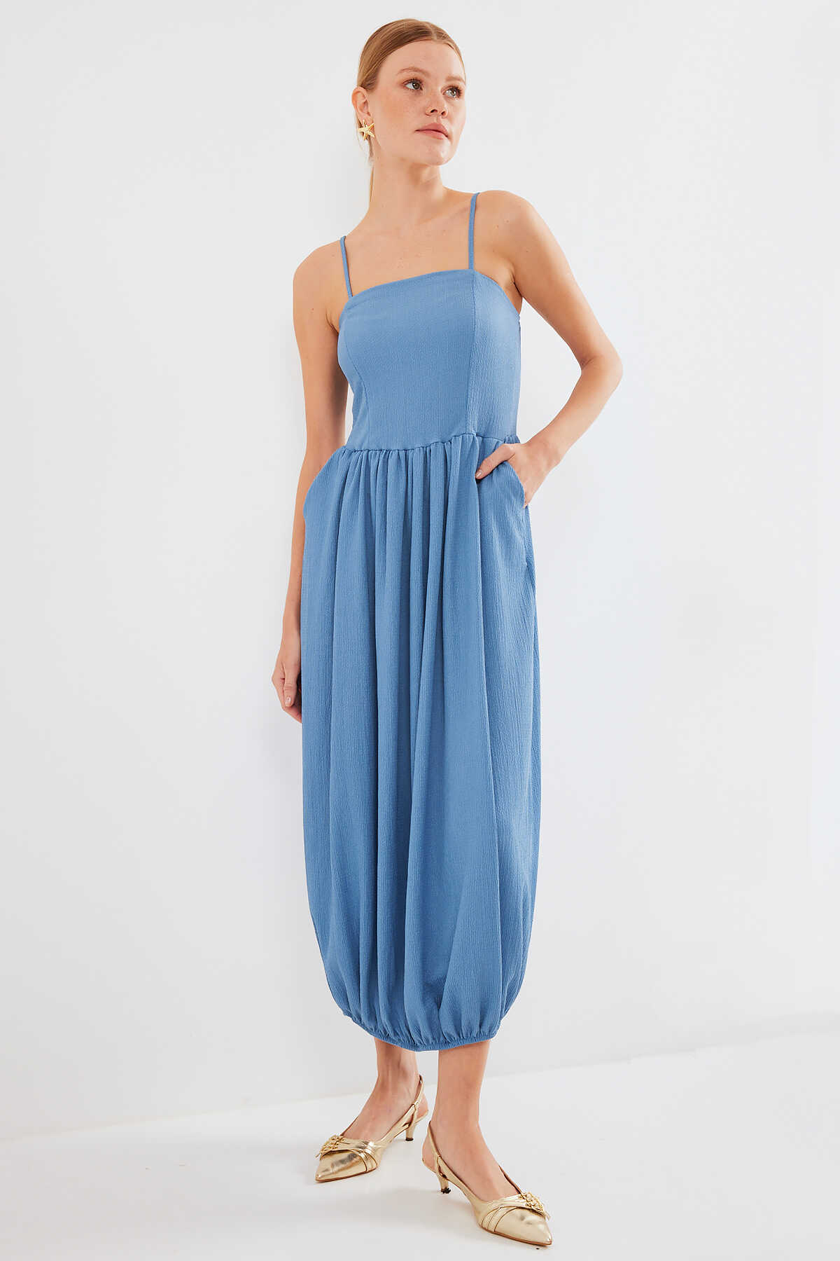 2492 Askılı Örme Salopet Elbise - İndigo - Kombin