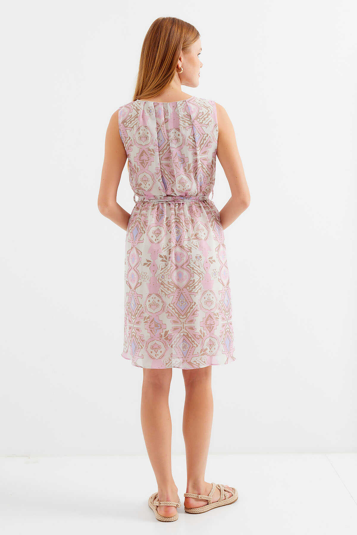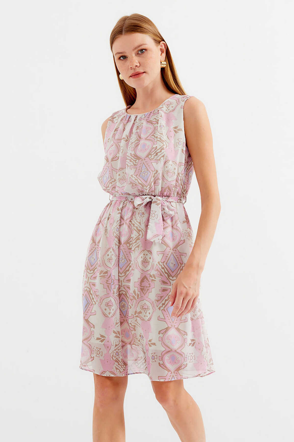Desenli Sifir Kol Sifon Elbise