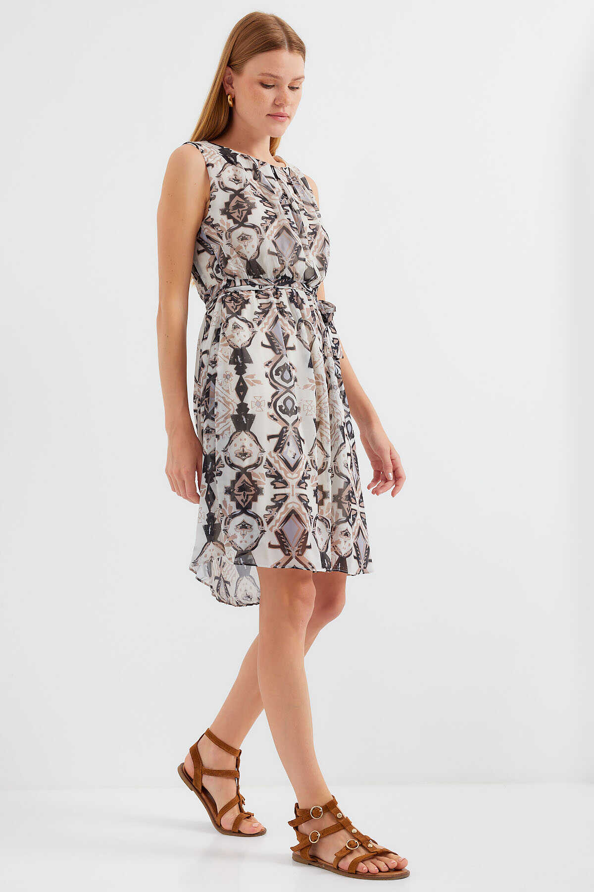 Desenli Sifir Kol Sifon Elbise
