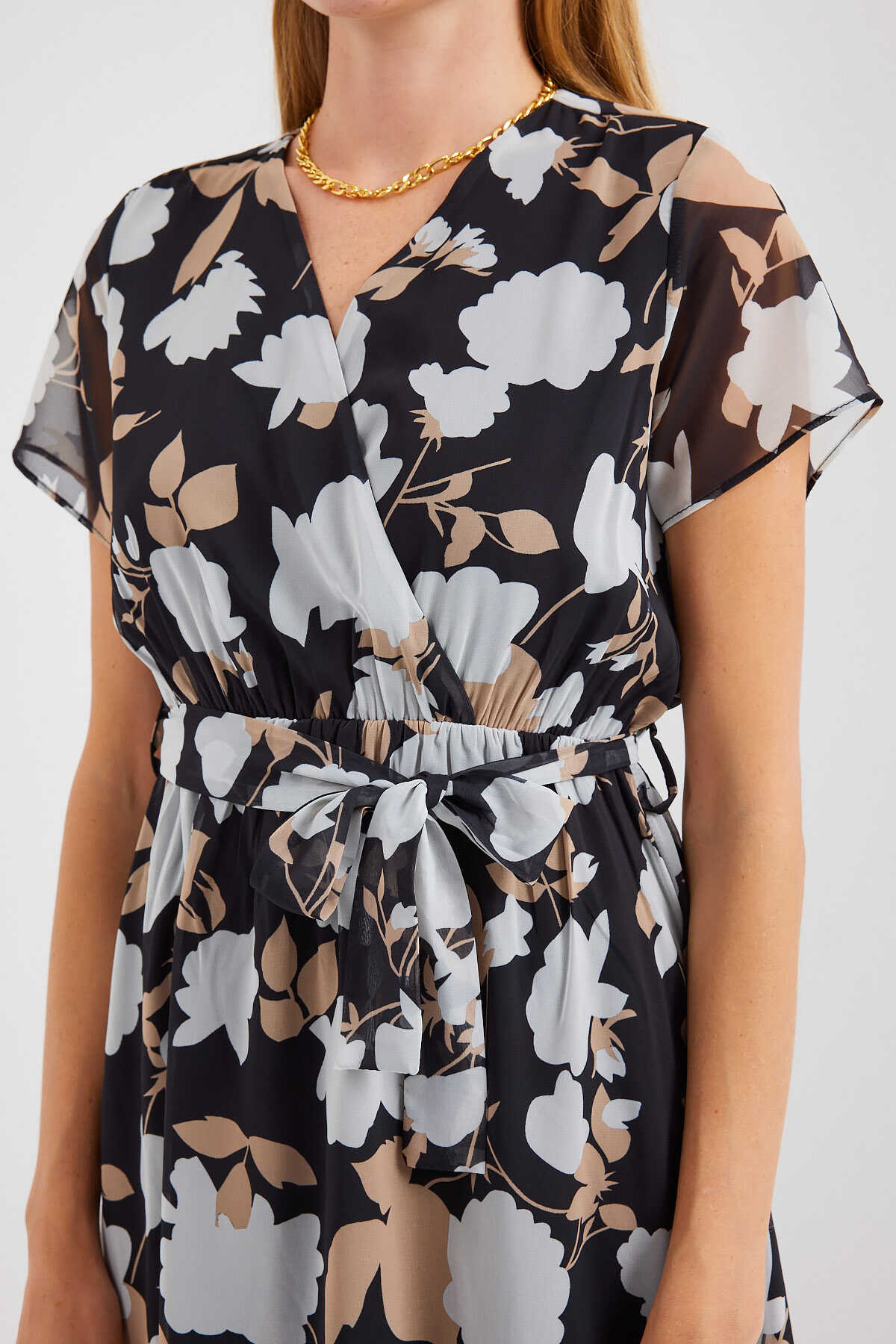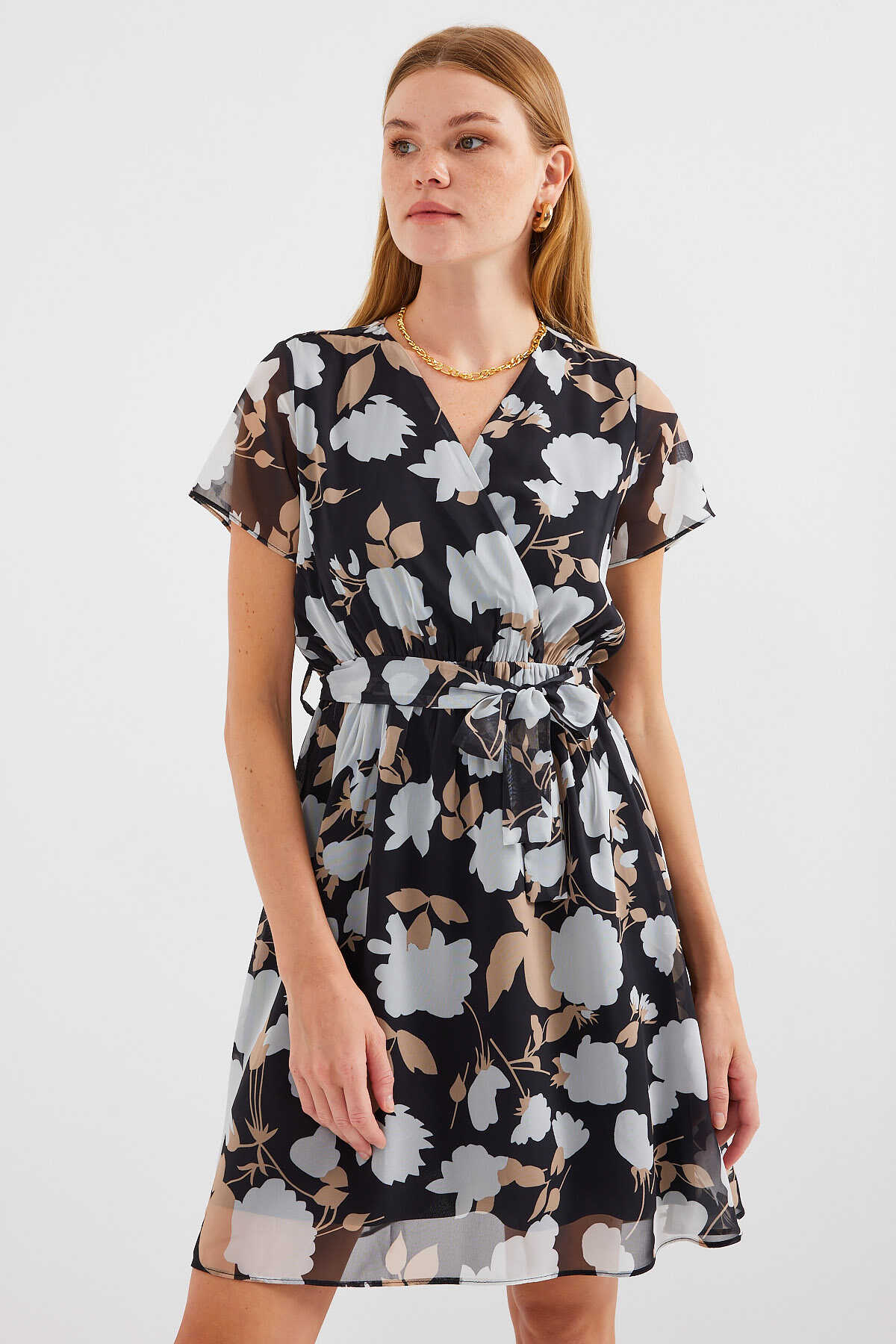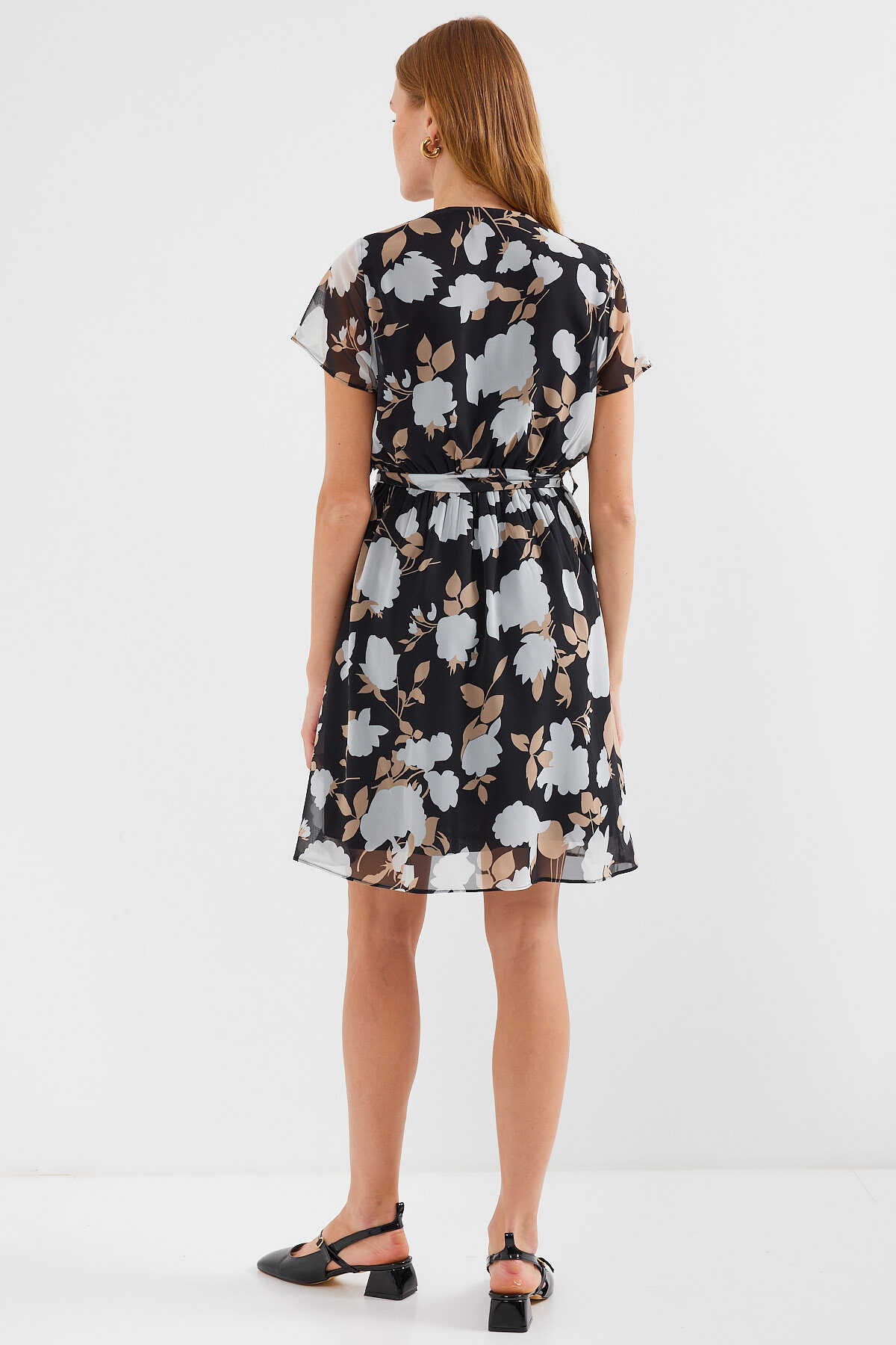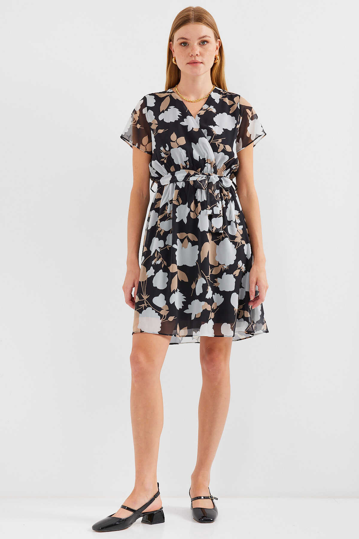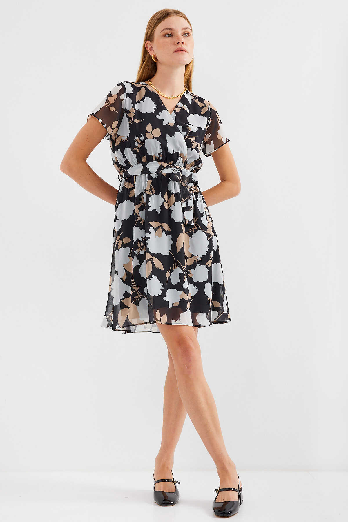 2502 Kısa Kol Desenli Şifon Elbise - A.Siyah - Kombin
