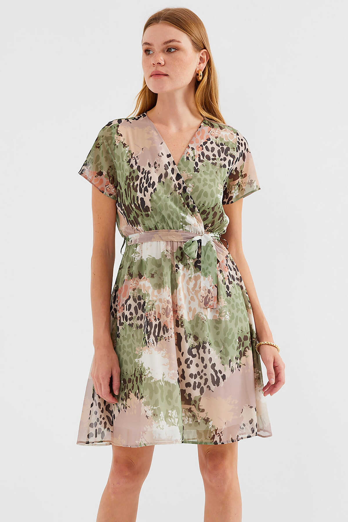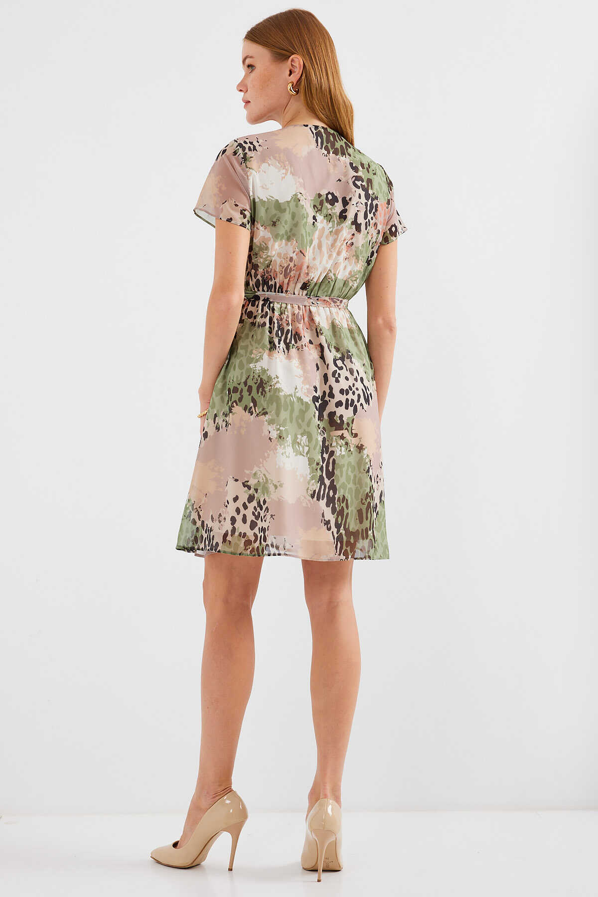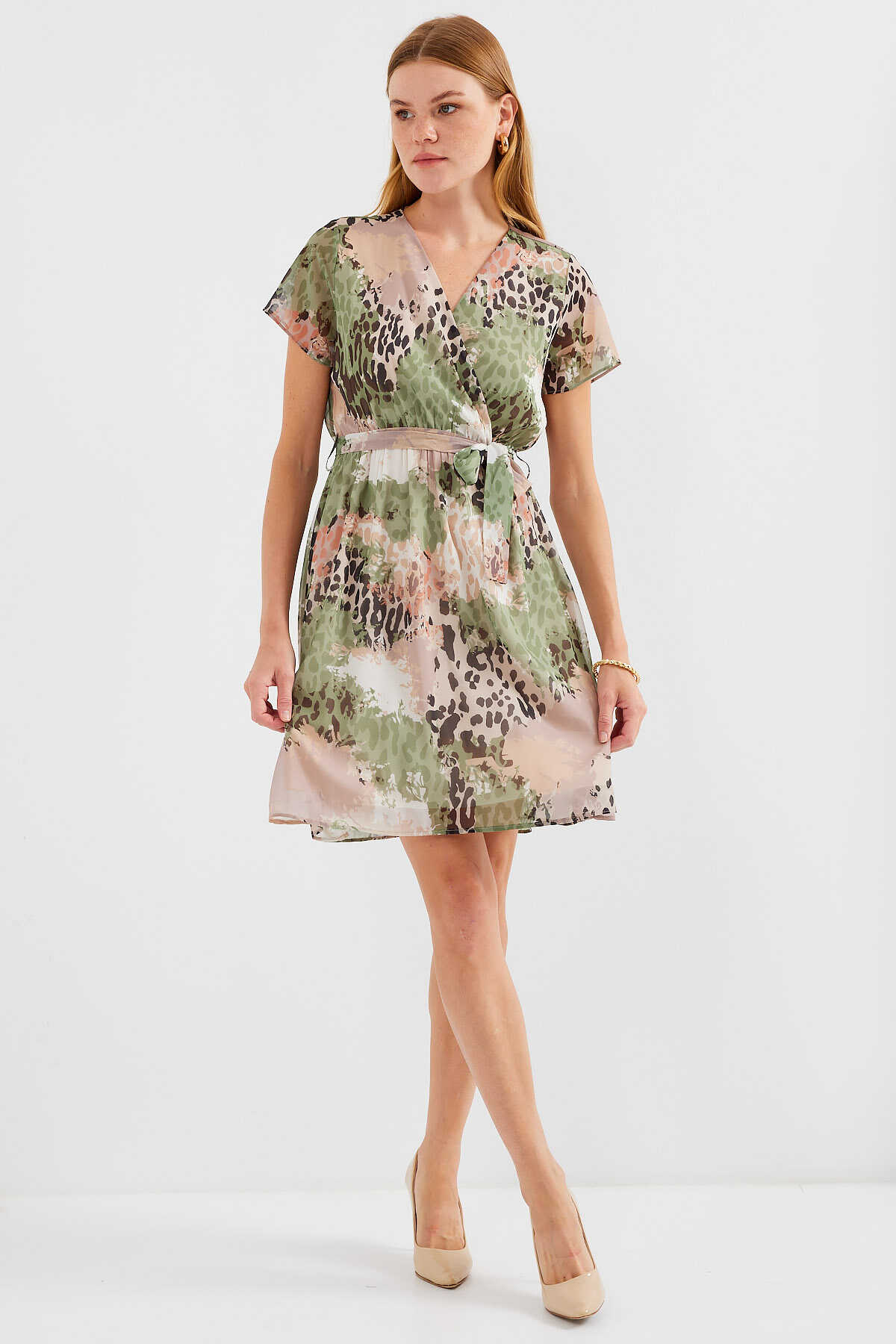 2502 Kısa Kol Desenli Şifon Elbise - Çağla - Kombin