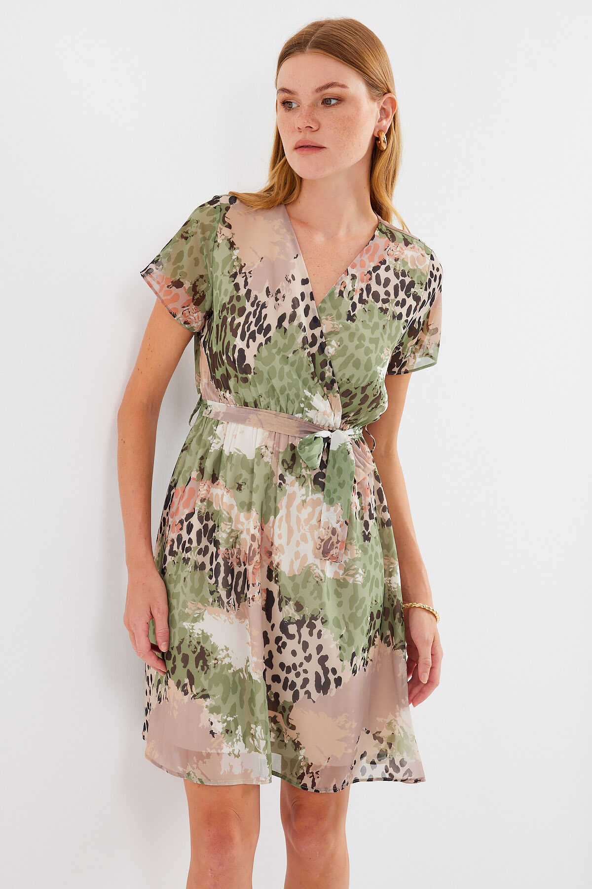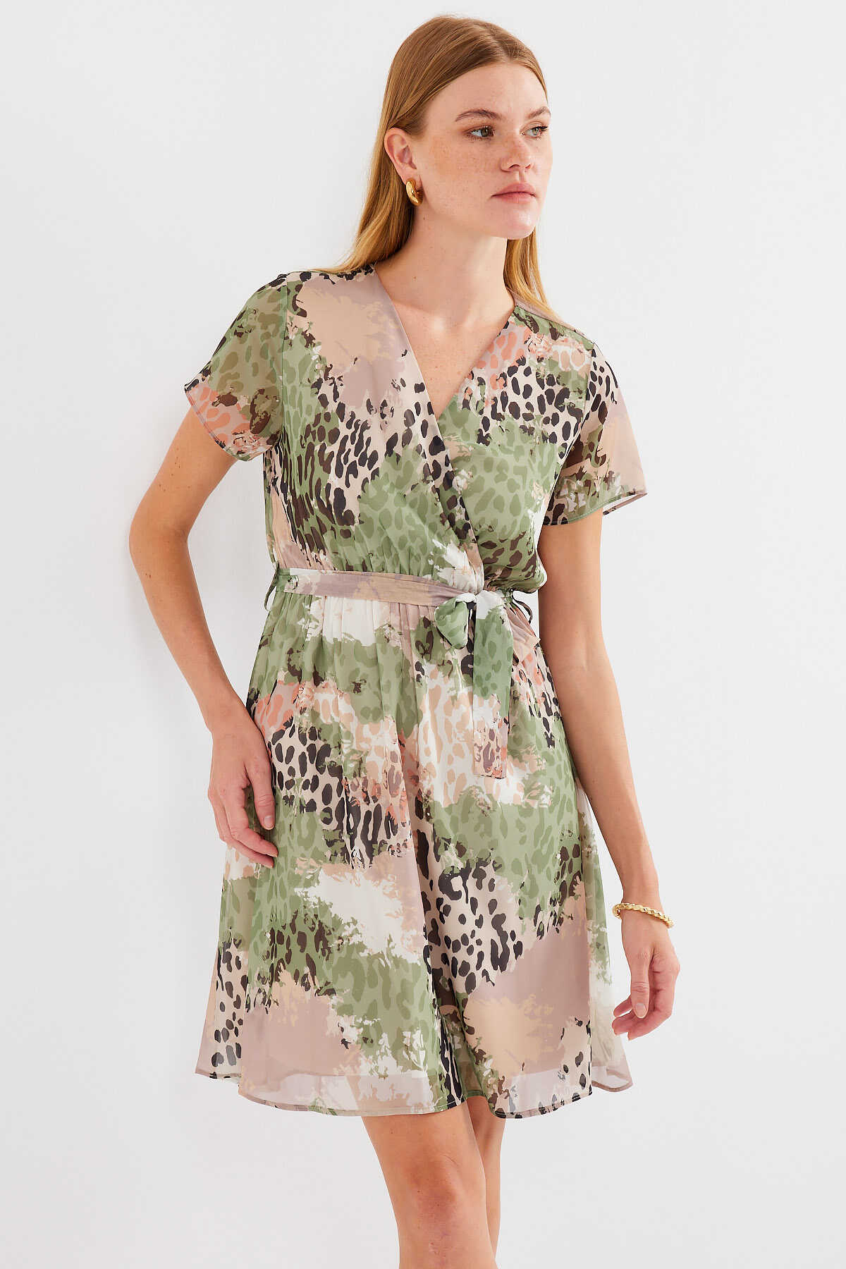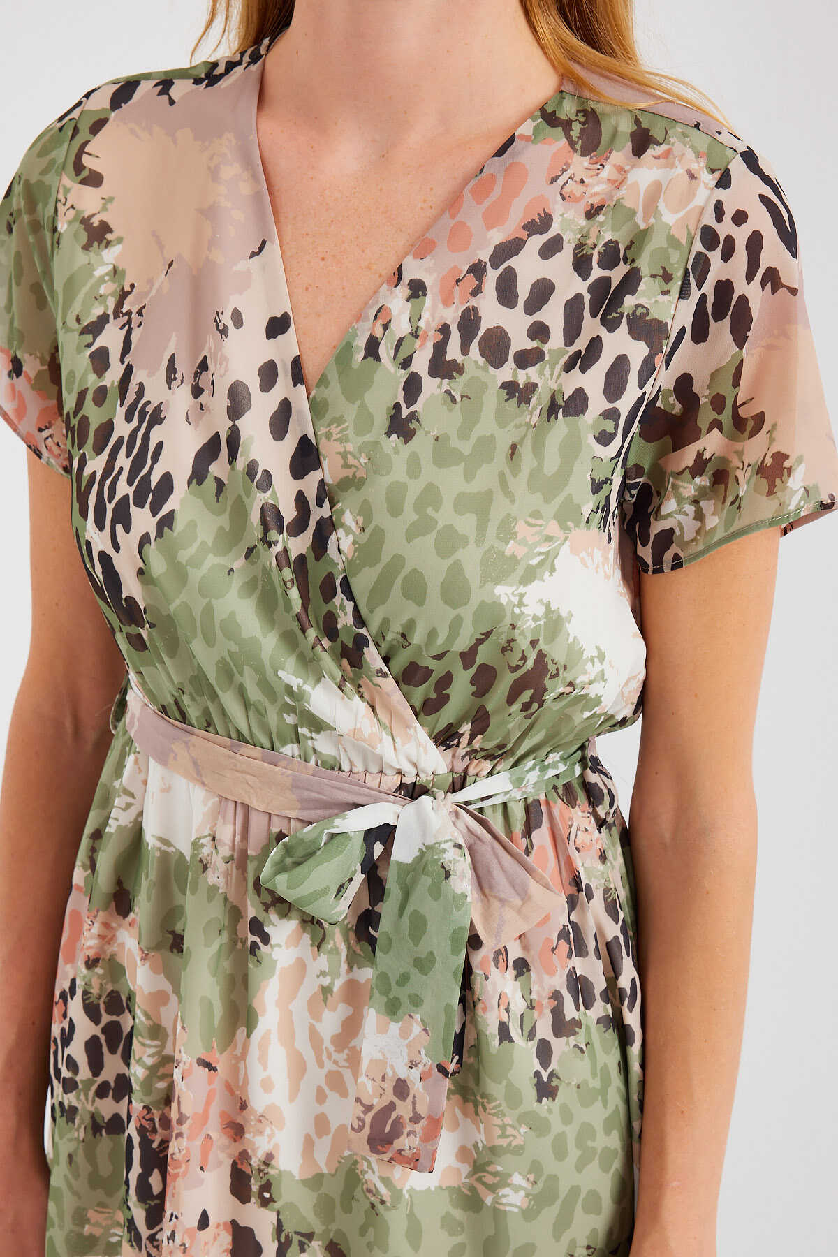 2502 Kısa Kol Desenli Şifon Elbise - Çağla - Kombin